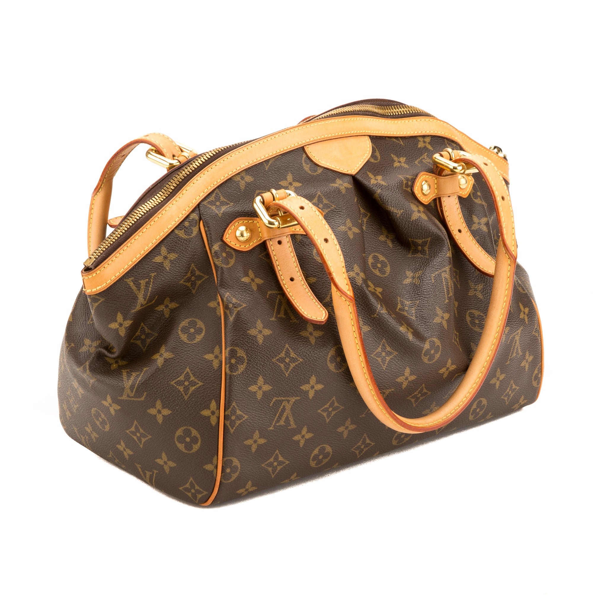 This authentic Louis Vuitton Monogram Canvas Tivoli GM Bag is stunning. The Tivoli is named after famous the city Tivoli, Italy. It features gold tone hardware, pleating, a frame top and a gold zipper LV pull.