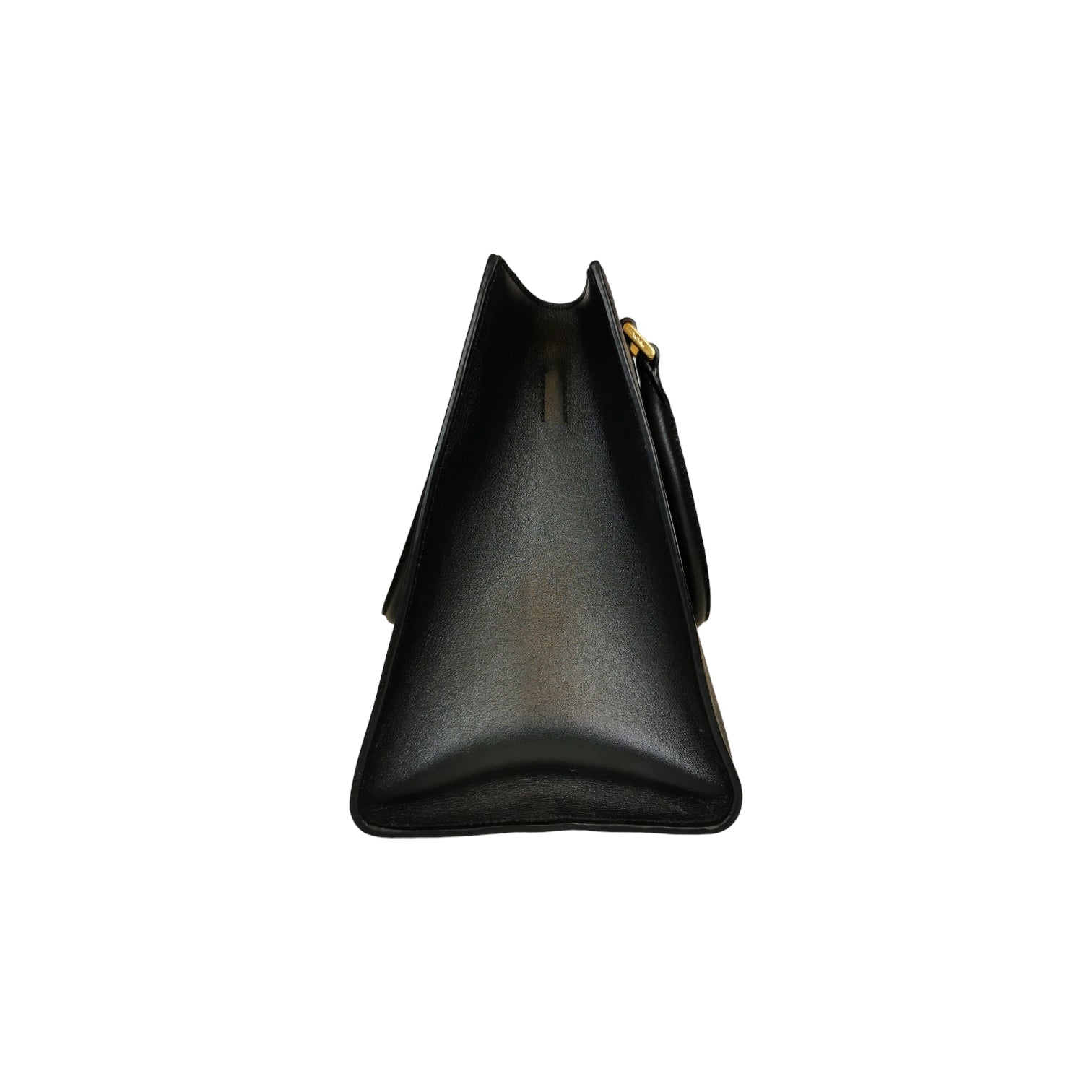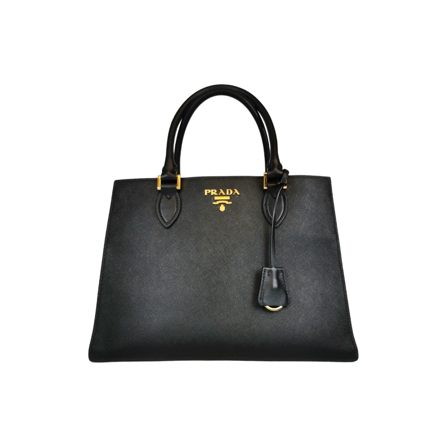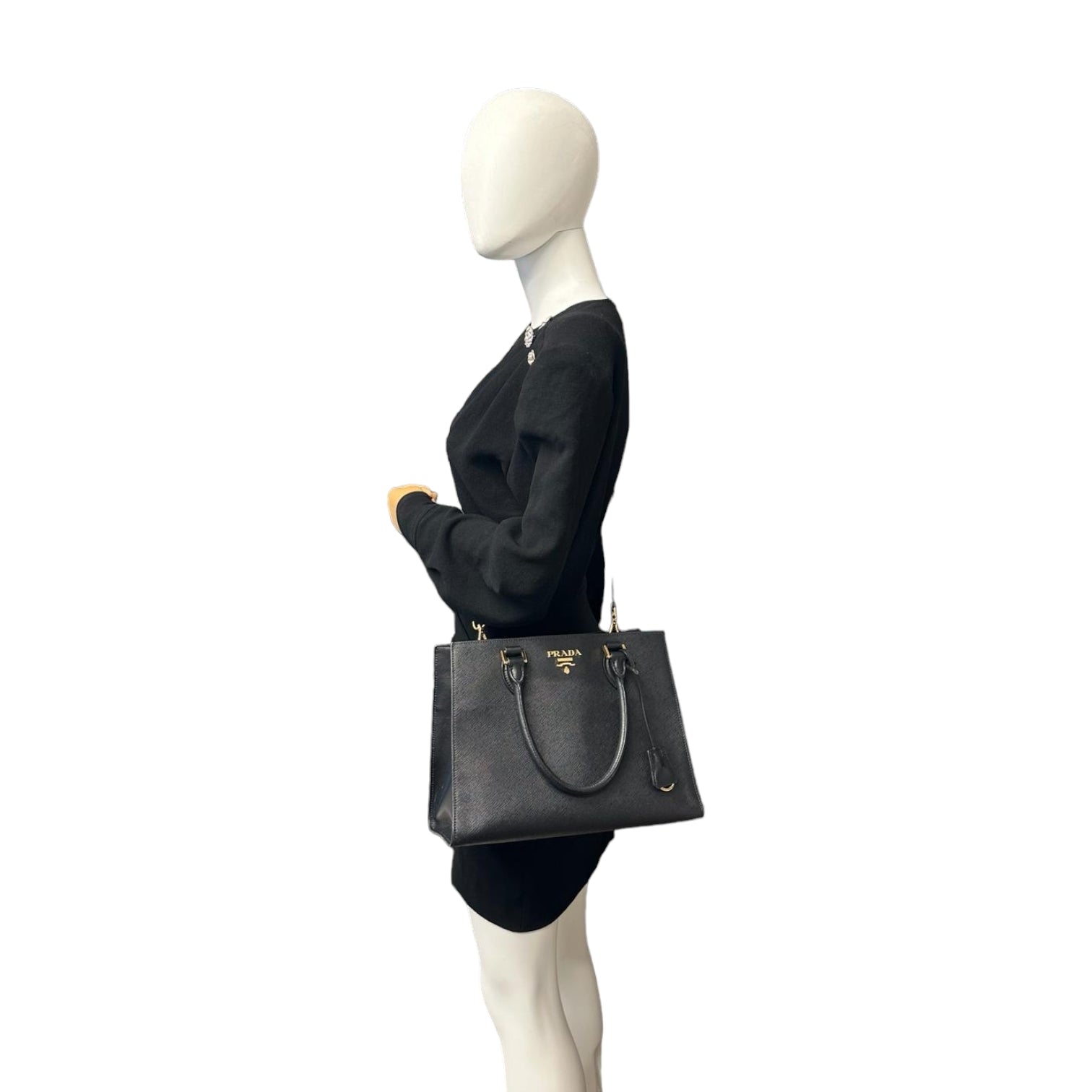 The Bag is made of black Saffiano with golden hardware. The large old Prada logo can be seen on the front. A shoulder strap allows it to be carried comfortably on the shoulder or crossbody.
