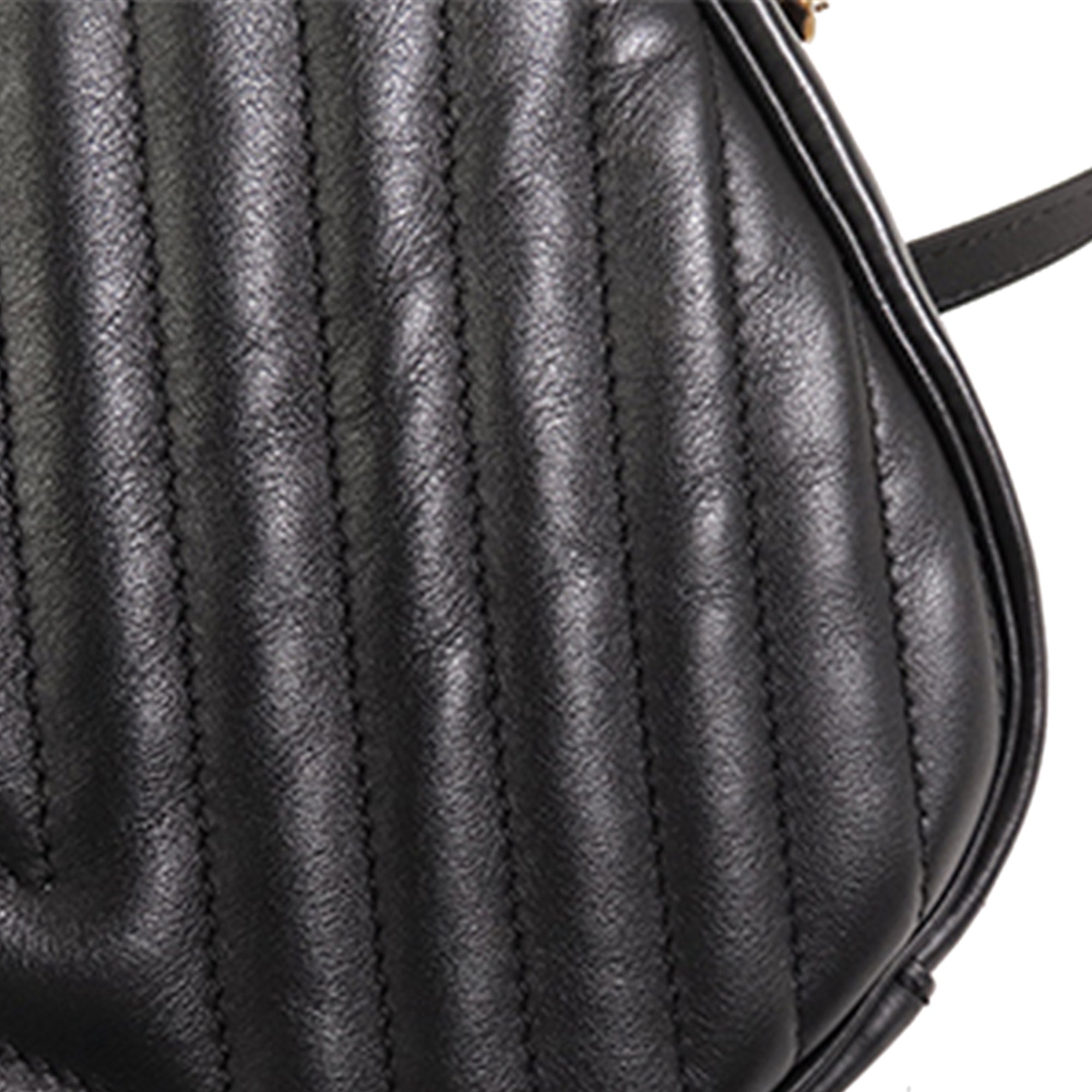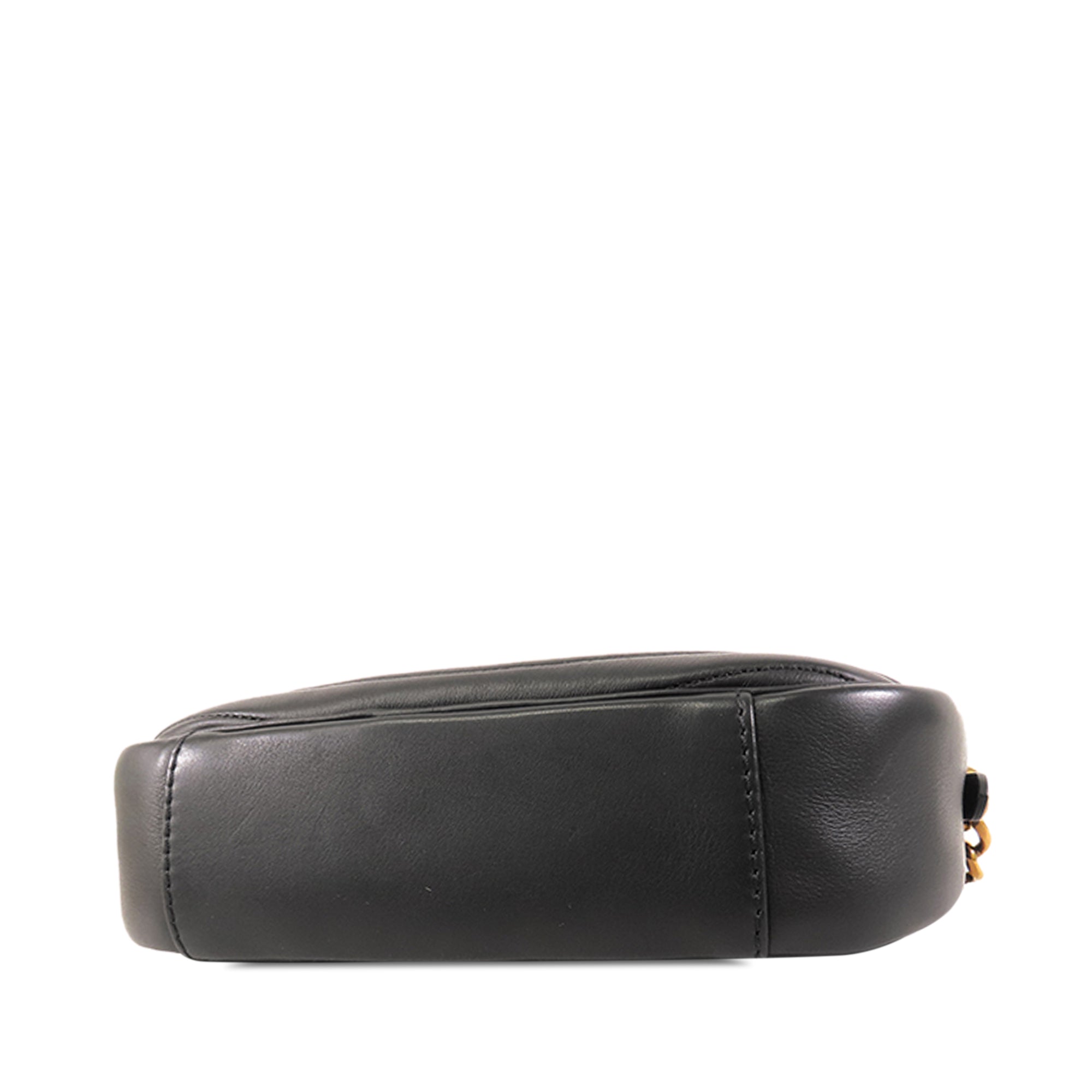 The New Wave Camera bag features a quilted leather body, a flat leather strap with curb chain, a top zip closure, an exterior slip pocket, and an interior slip pocket.