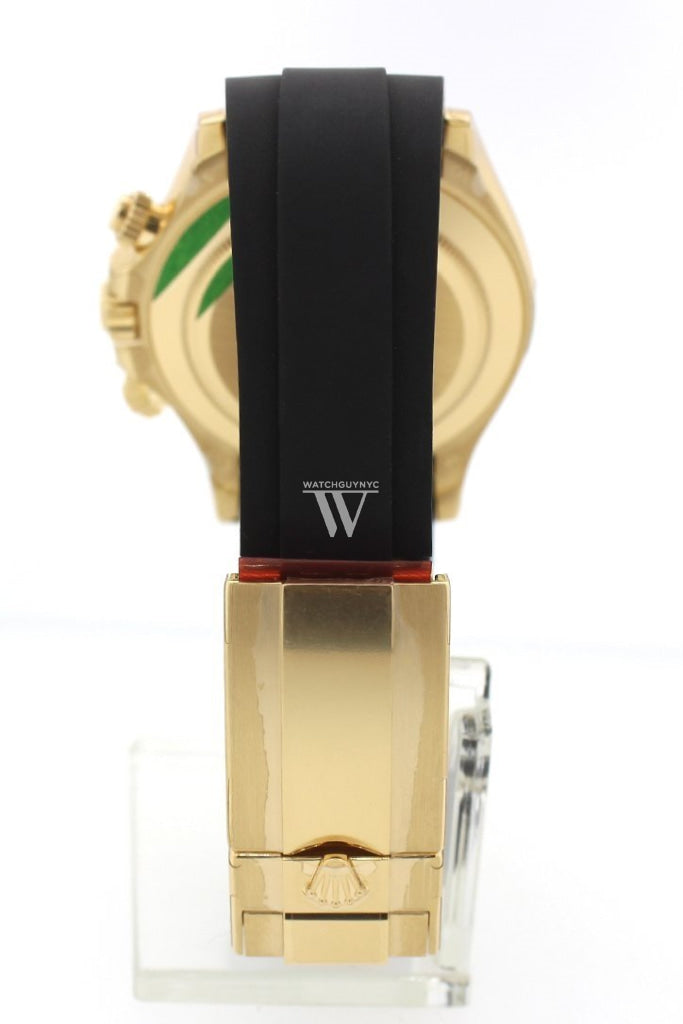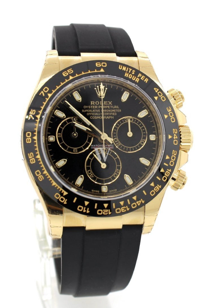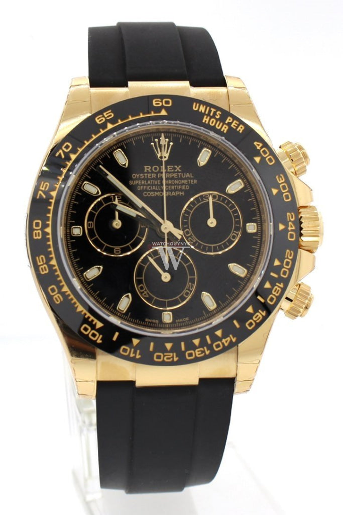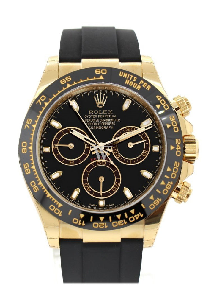 18kt yellow gold case with a black oysterflex bracelet. Black ceramic bezel. Black dial with gold-tone hands and index hour markers. Tachymetric scale. Dial Type: Analog. Chronograph – sub-dials displaying: three – 60 second, 30 minute and 12 hours. Calibre 4130 automatic movement with a 72-hour power reserve. Scratch resistant sapphire crystal. Screw down crown. Solid case back. Case size: 40 mm. Round case shape. Water resistant at 100 meters / 330 feet. Functions: chronograph, hour, minute, second. Luxury watch style. Watch label: Swiss Made. Oyster Perpetual Champagne Dial Automatic Mens Chronograph Watch 116518LN.