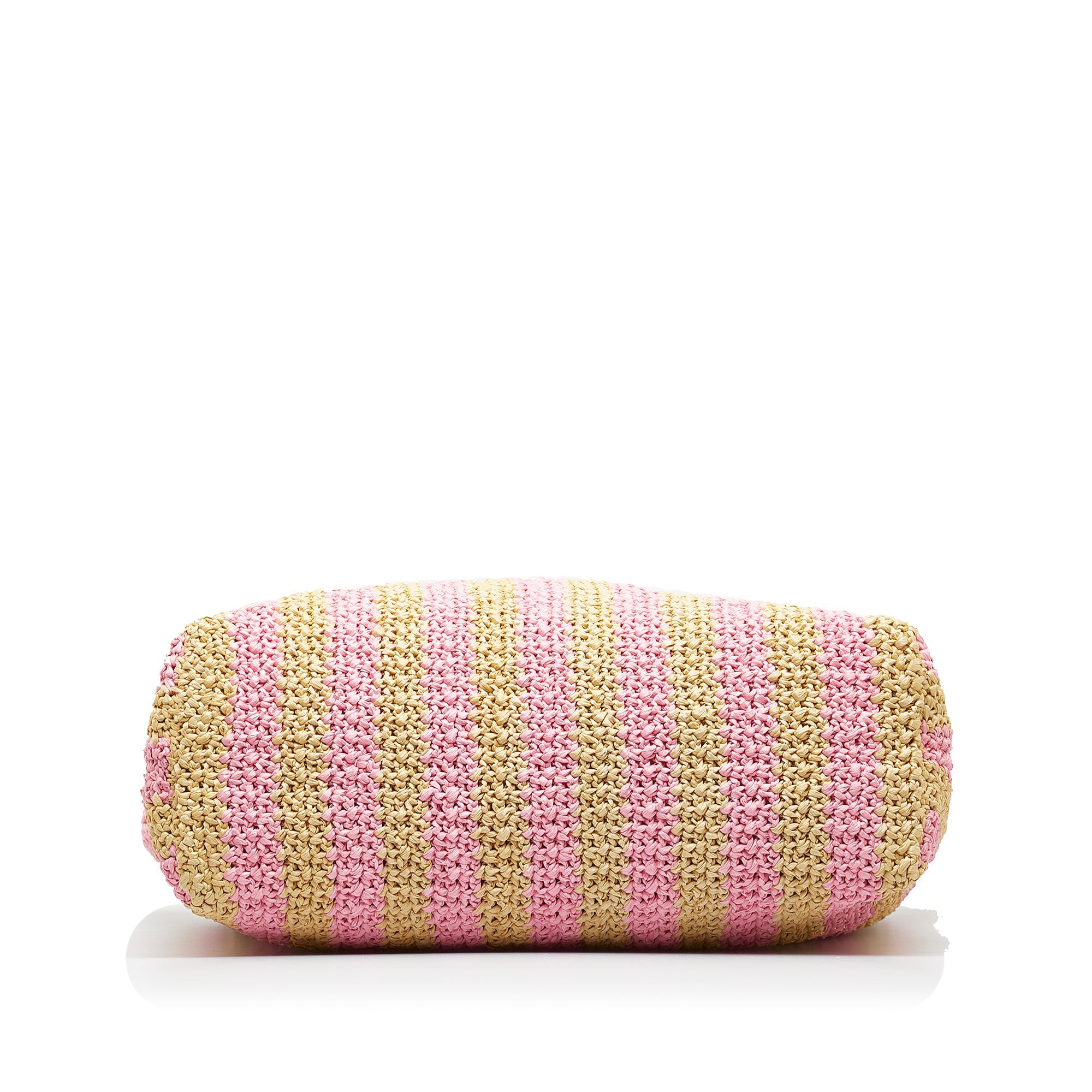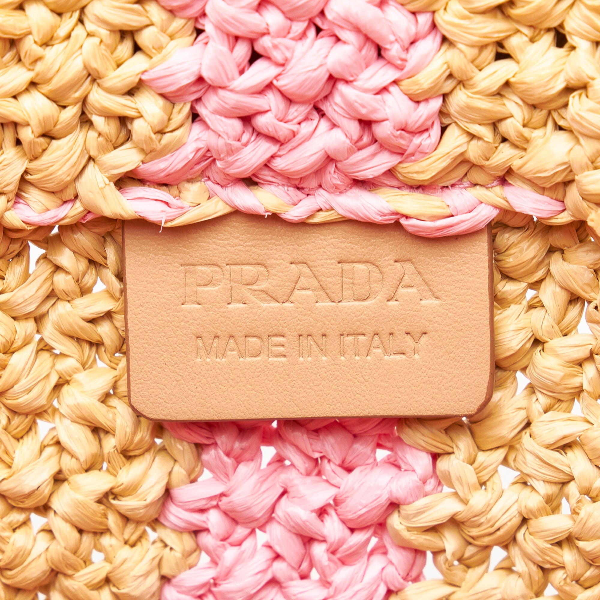 Product Details: Pink Prada Large Raffia Logo Tote. This tote bag features a striped woven raffia body, flat raffia handles, and an open top. 13″ L x 18.9″ W x 6.3″ D, 5.9″ drop.