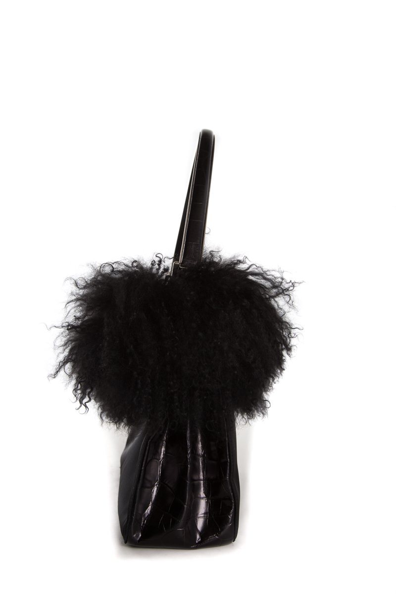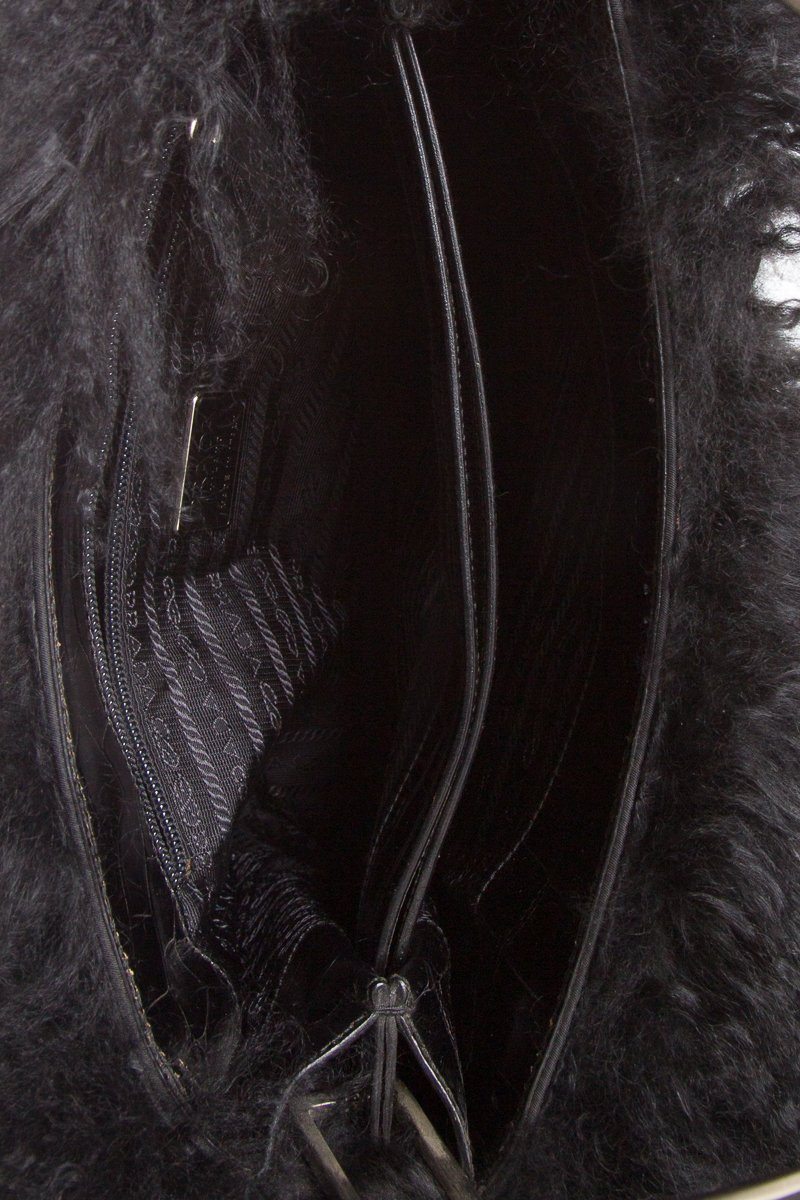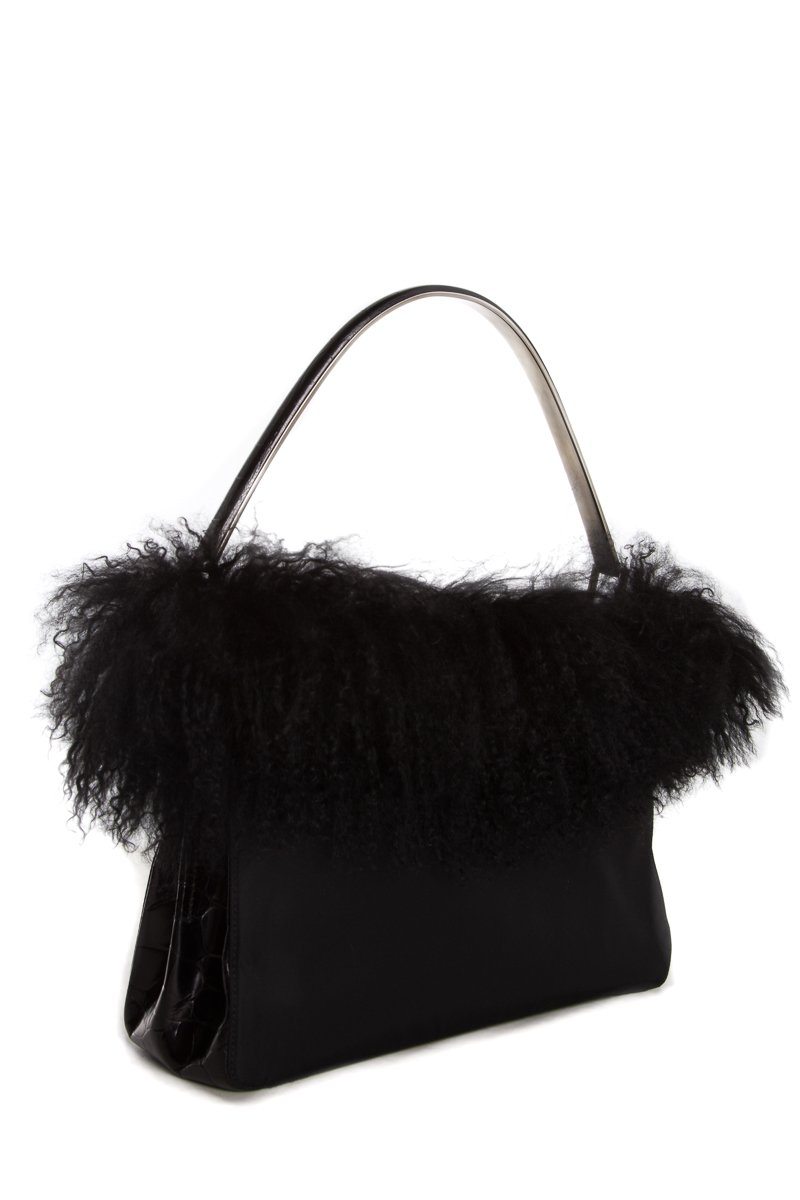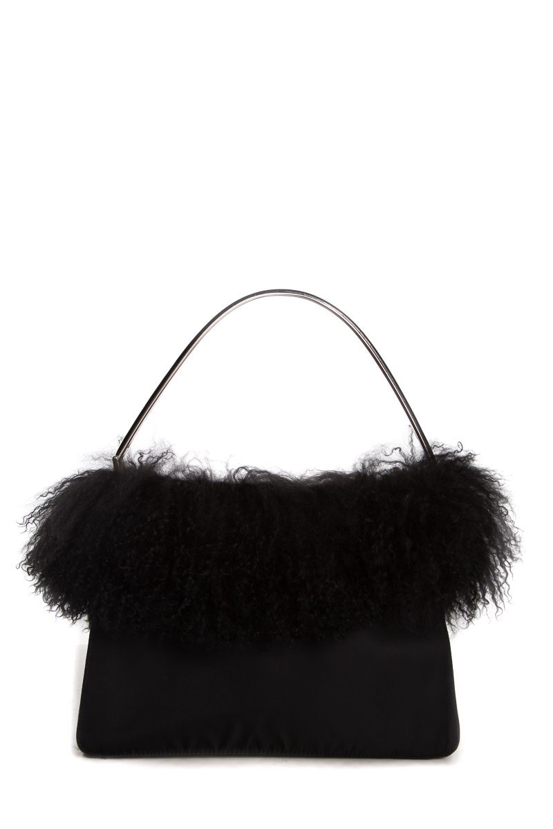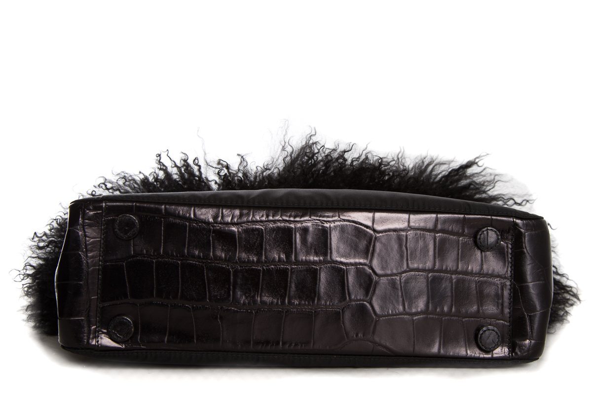 Prada black nylon handbag with croc & fur trim, tonal logo lining, zip interior pocket.