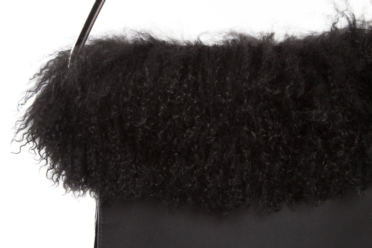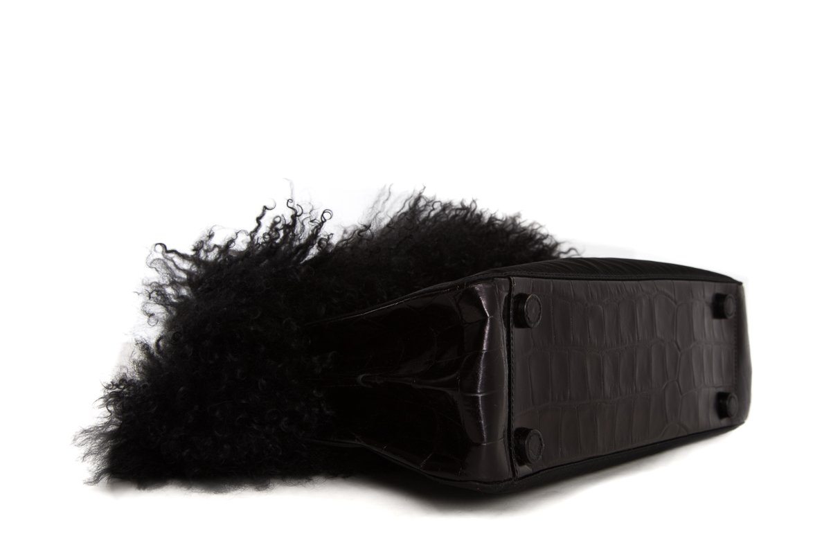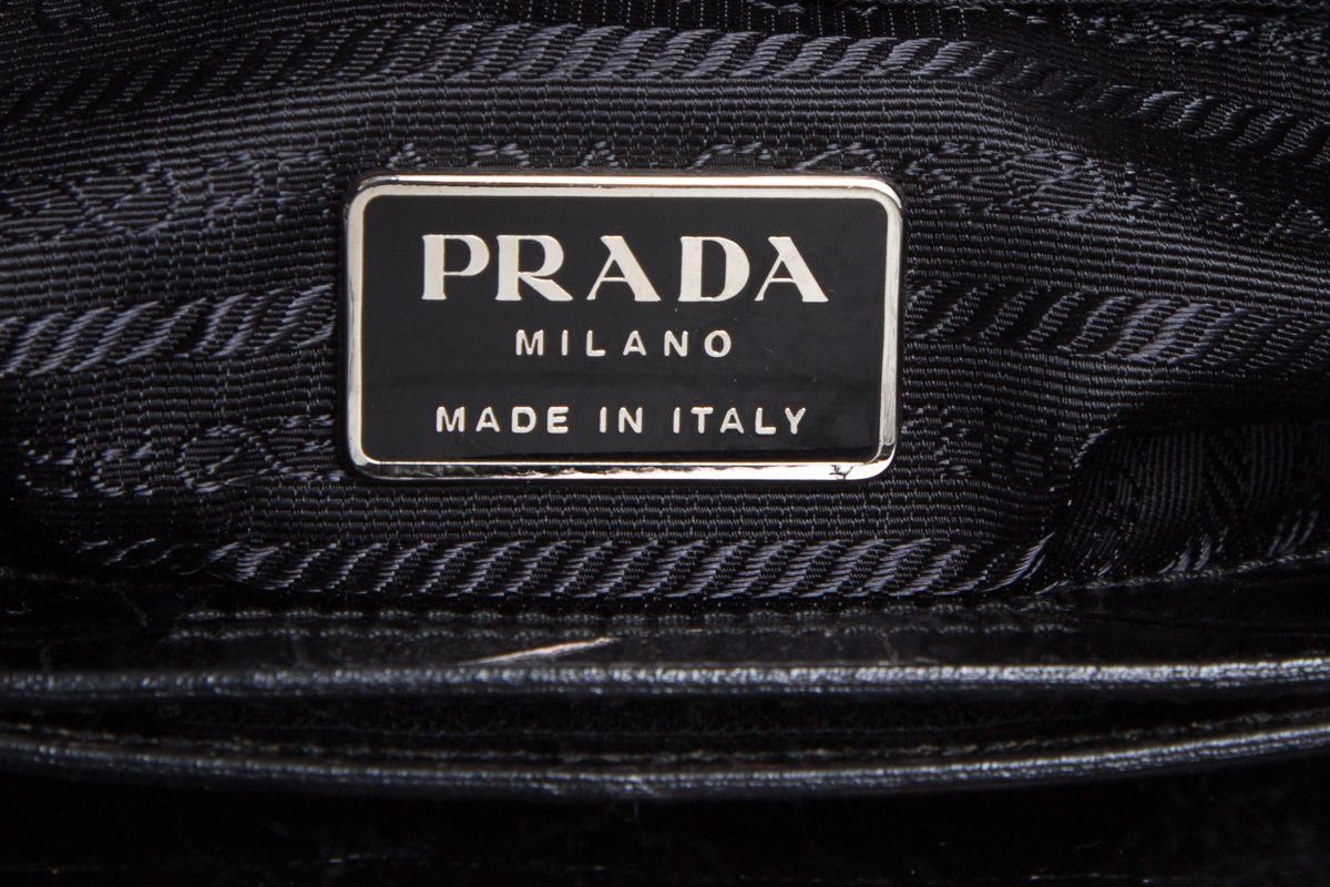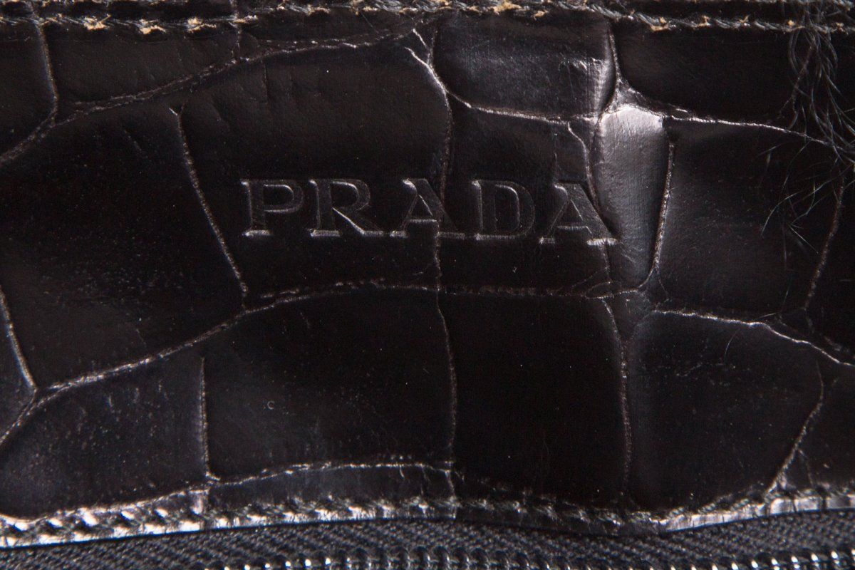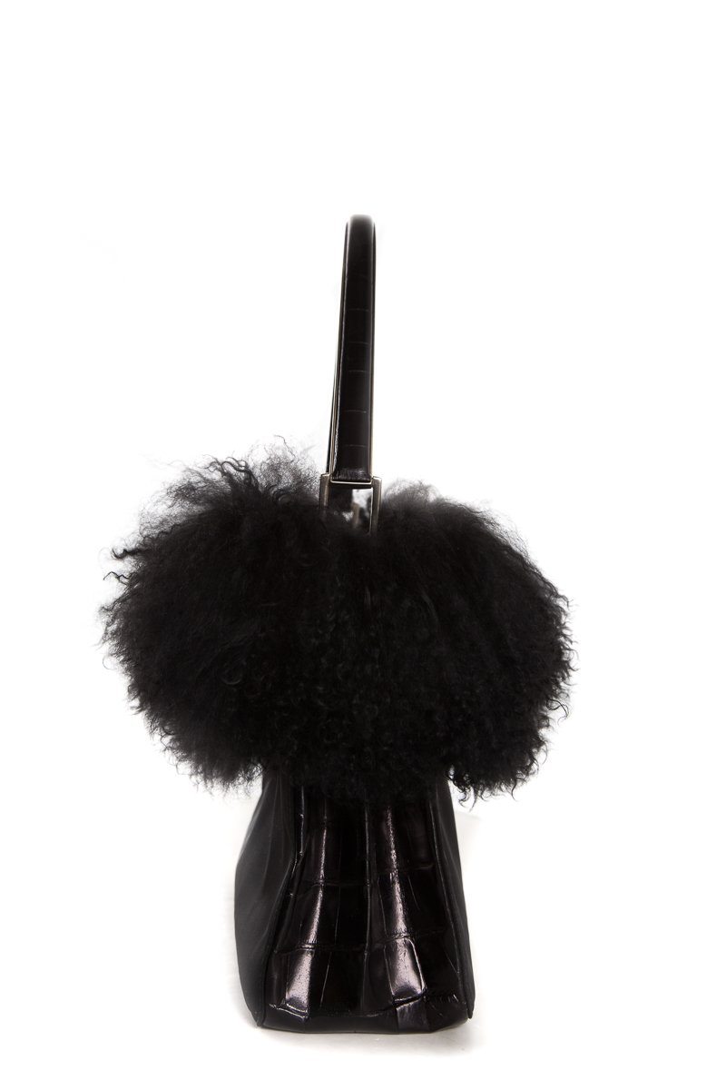 Prada black nylon handbag with croc & fur trim, tonal logo lining, zip interior pocket.