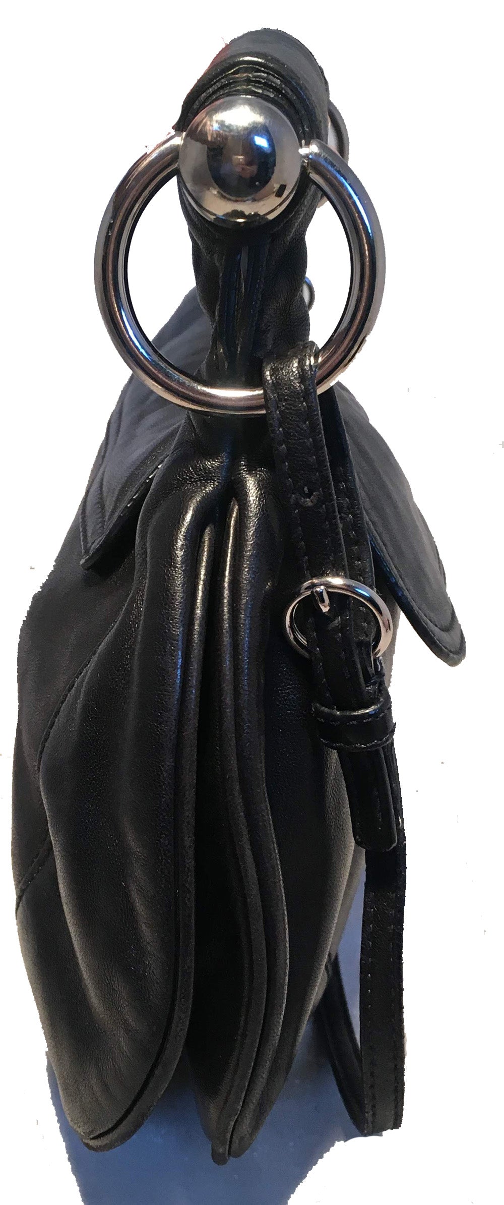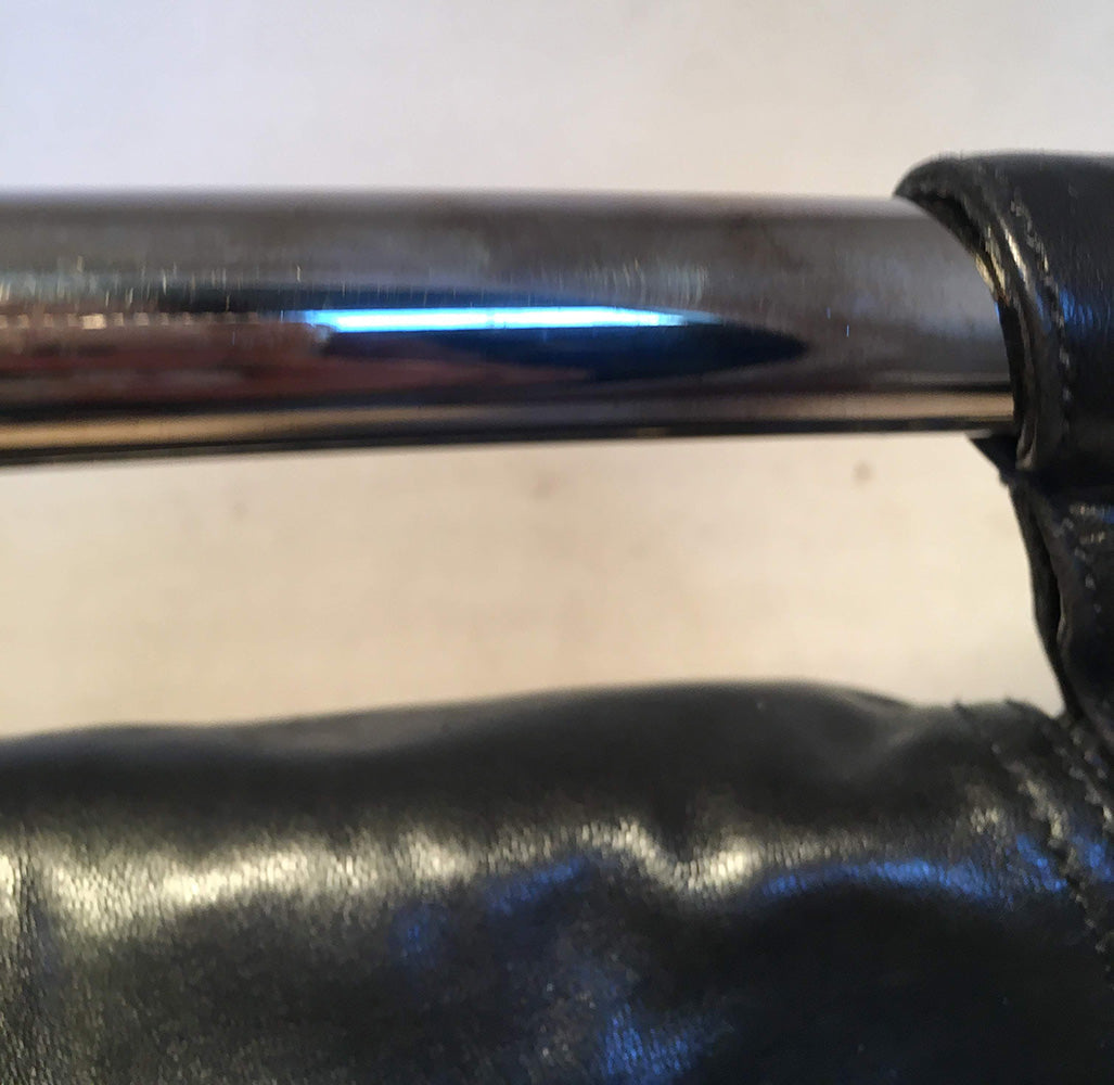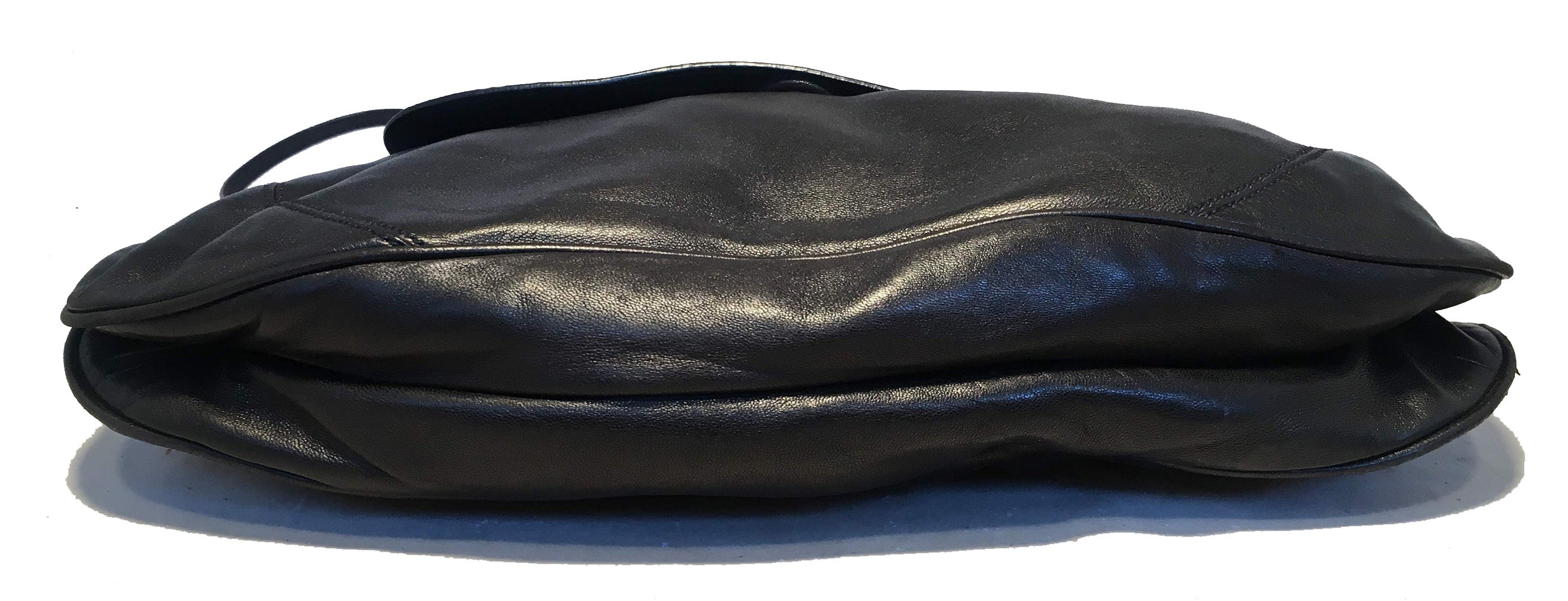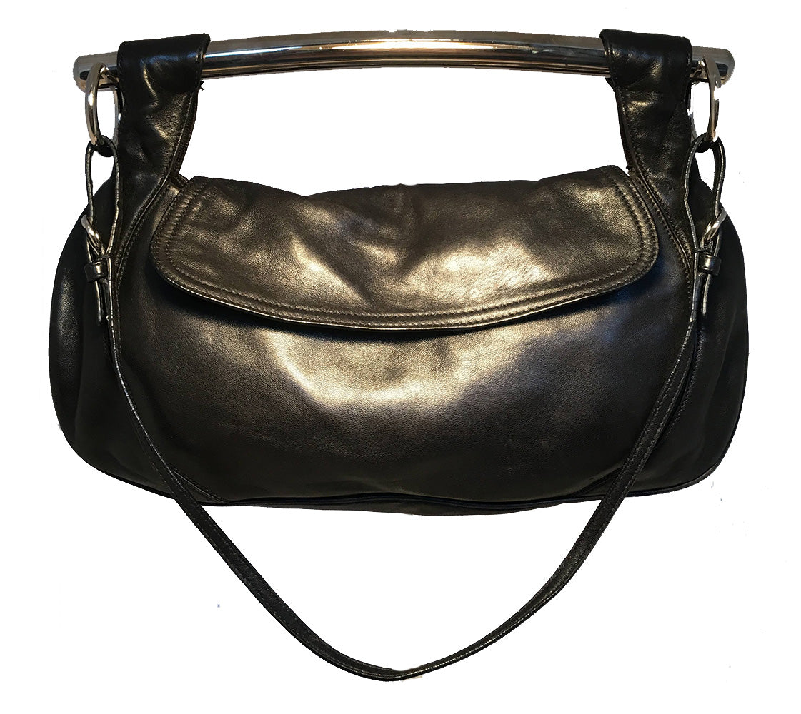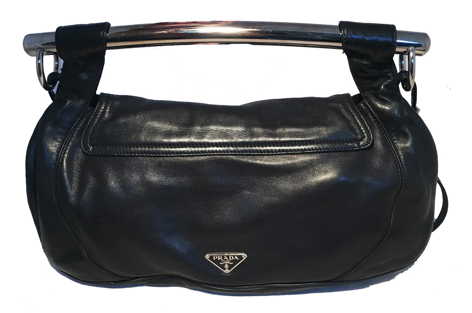 Prada Black Leather Bar Top Handle Convertible Handbag in very good condition. Soft black calfskin leather exterior trimmed with silver hardware and signature enamel logo plate on back side. Top Silver bar handle and attached thin black leather shoulder strap easily convert between hand and shoulder styles to suit your mood. Front flap snap closure opens to a black nylon interior with one side zippered pocket. No stains, smells or leather scuffs. Light discoloration on top silver bar handle- see photo- not immediately visible. Clean corners, edges and interior. Purchase includes a dust cover. Measurements: 12″x7″x4″ 2.5″ handle 13″ strap