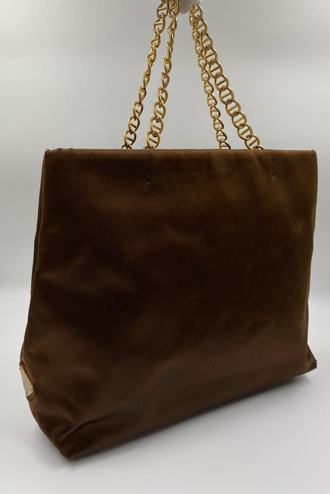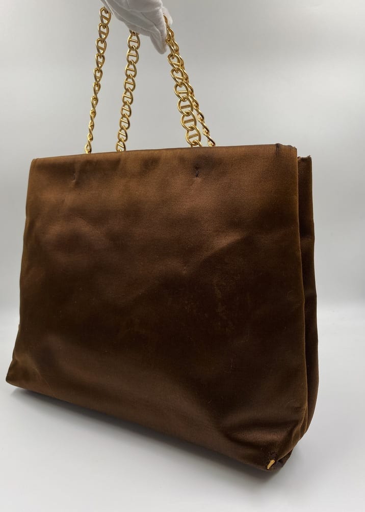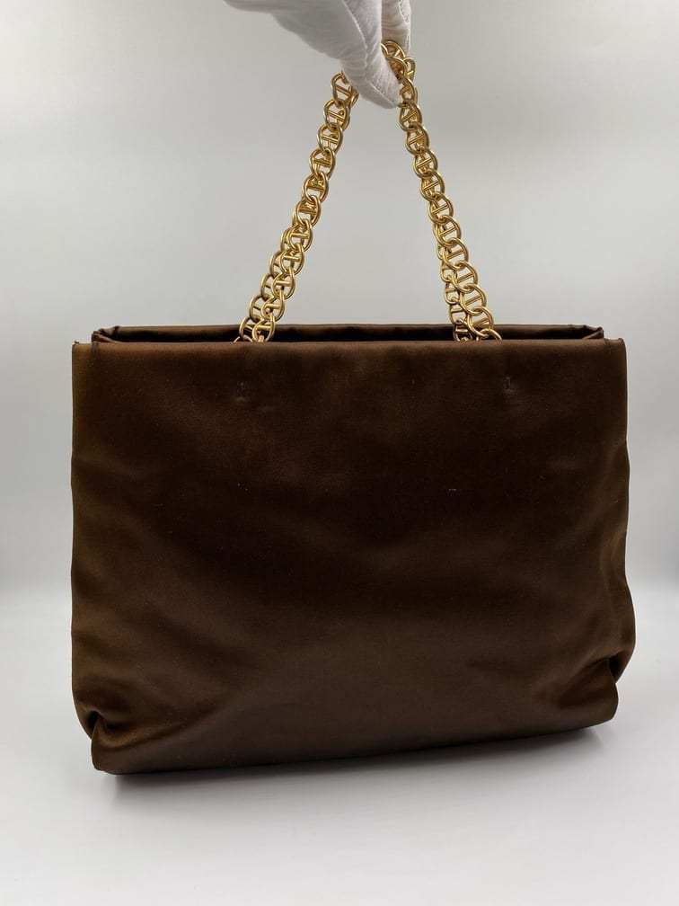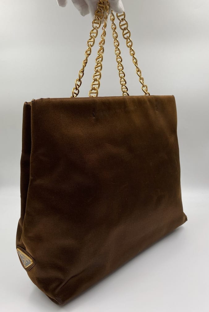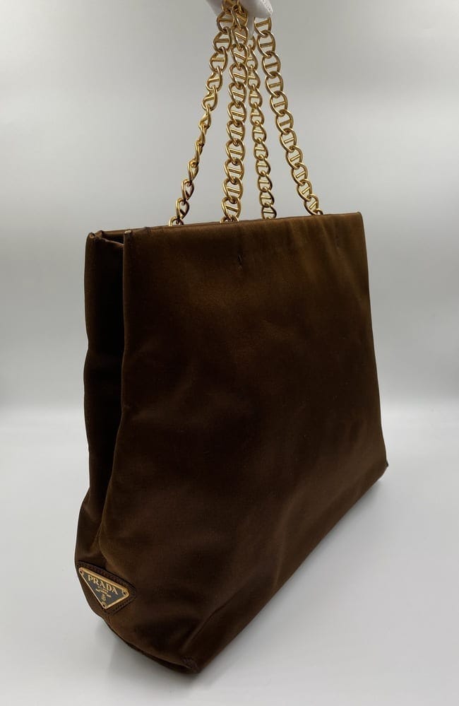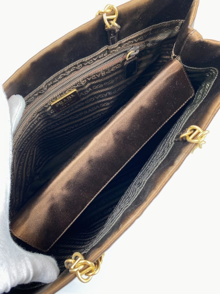 A great Prada satin tote bag with a gold chain top handle. Inside the bag is lined with the iconic Prada logo lining and has a zipped interior pocket for your valuables.