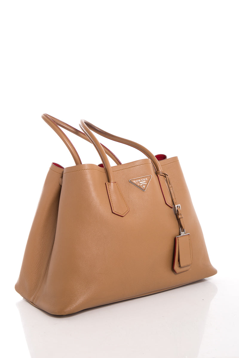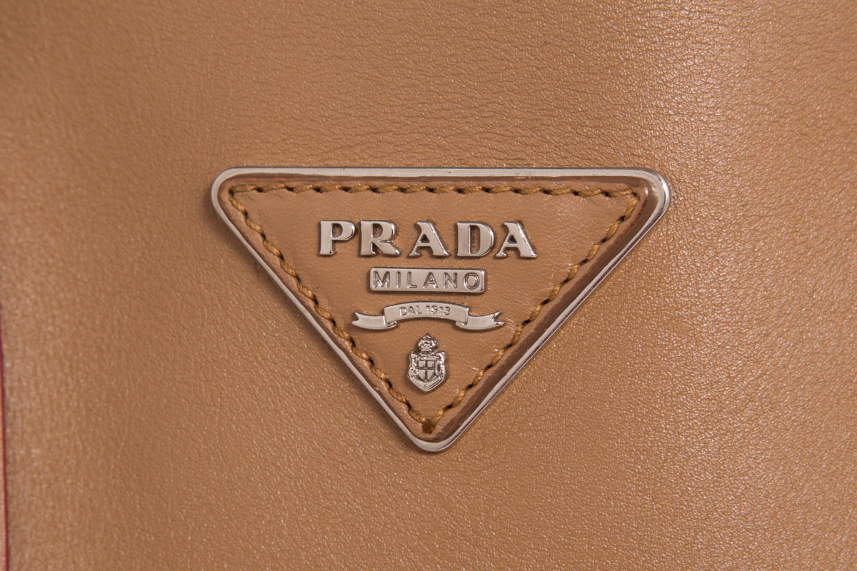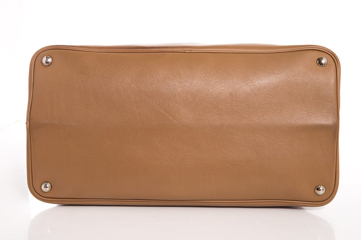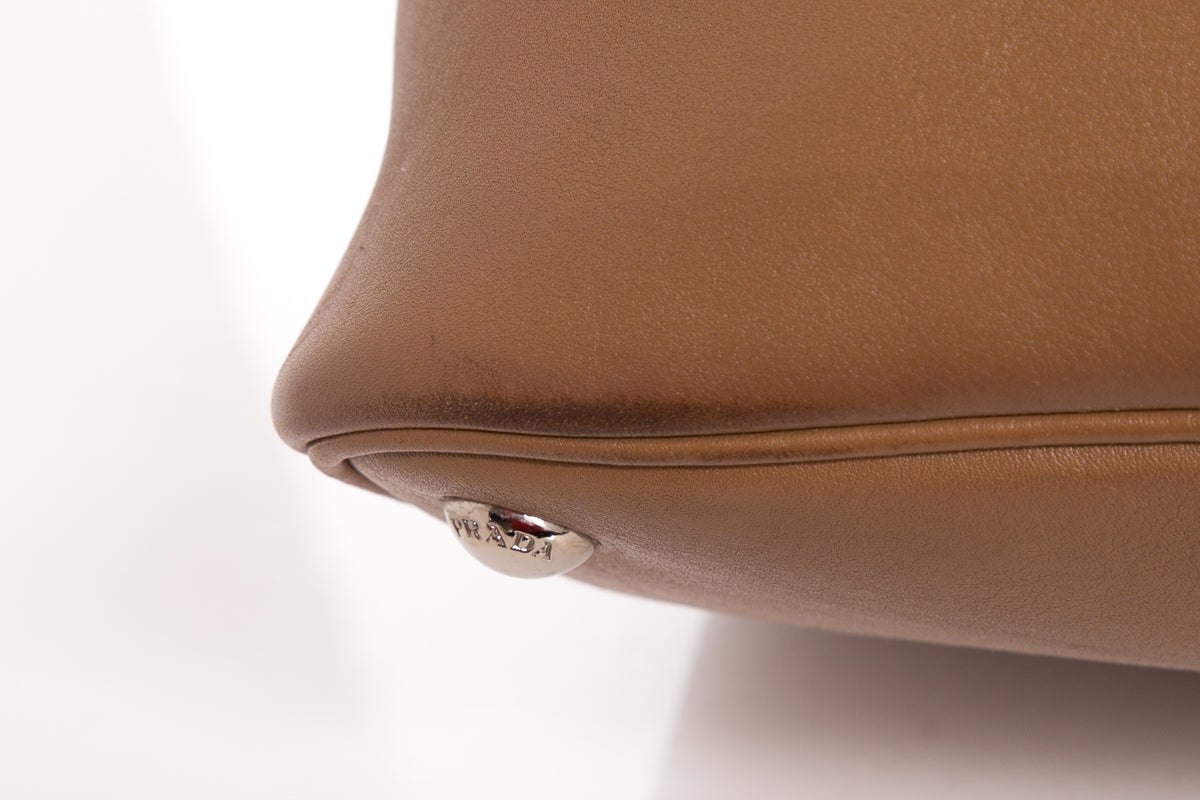 Prada Camel Leather Tote with silver hard ware, dual leather shoulder straps. This item is in good condition; contains some discoloring/wear to leather on corners.
