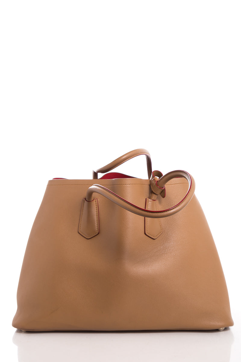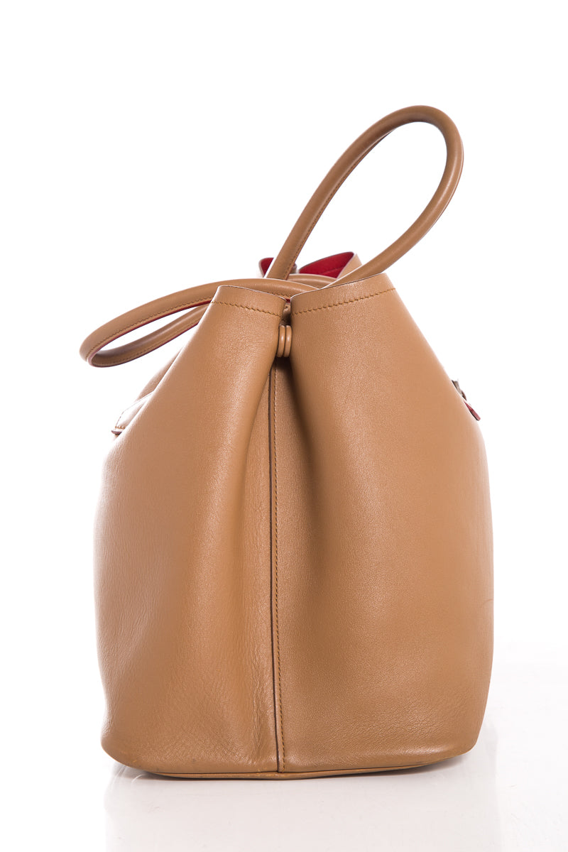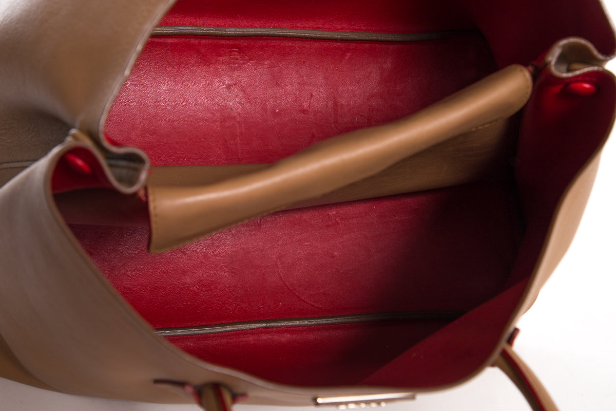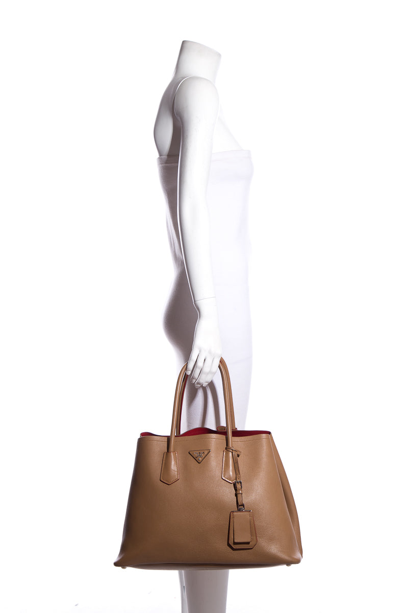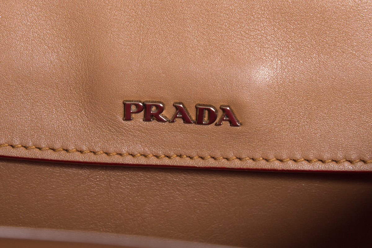 Prada Camel Leather Tote with silver hard ware, dual leather shoulder straps. This item is in good condition; contains some discoloring/wear to leather on corners.