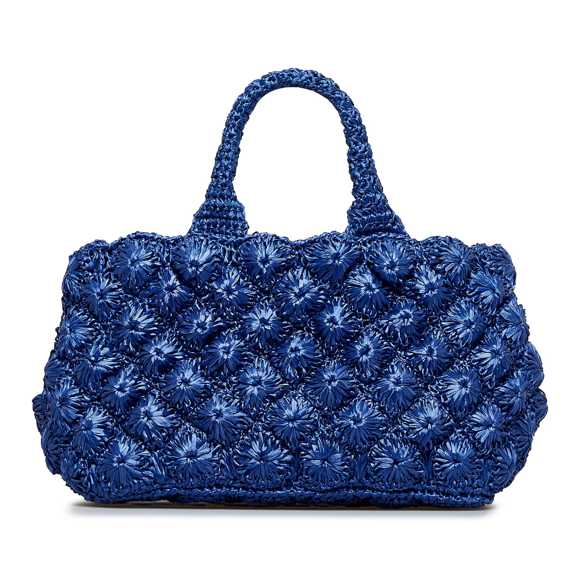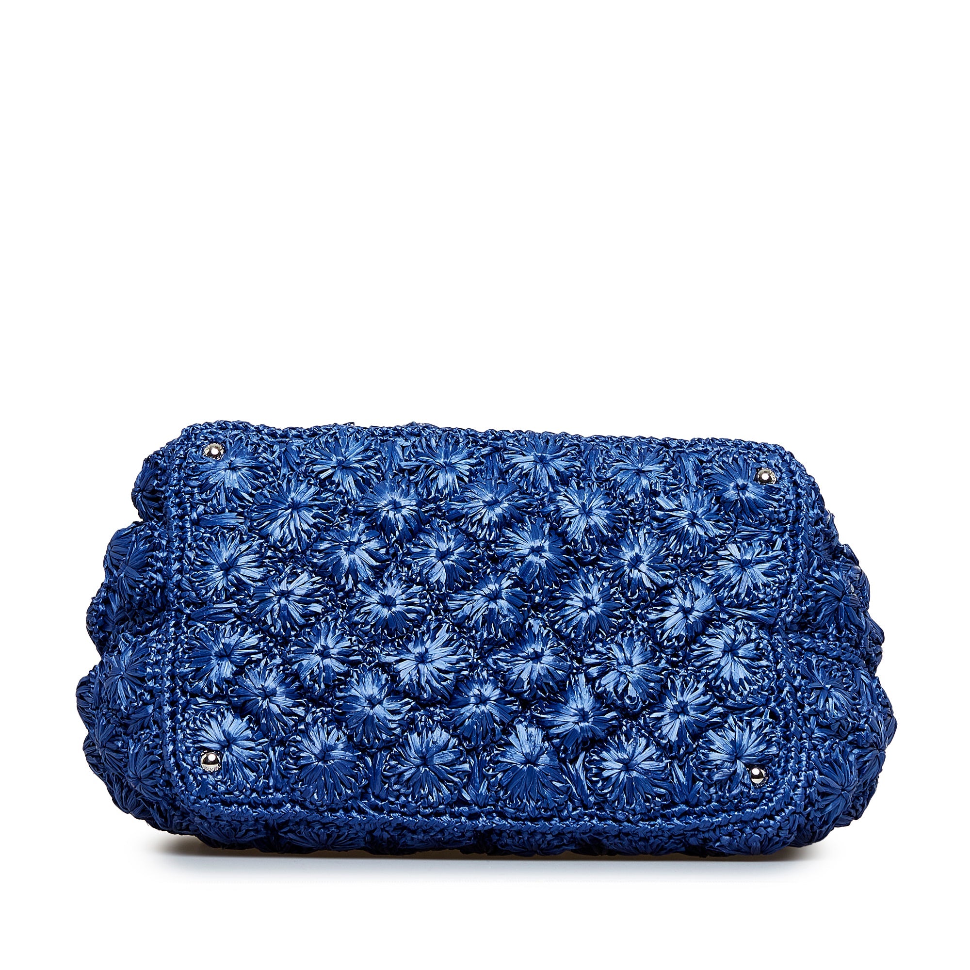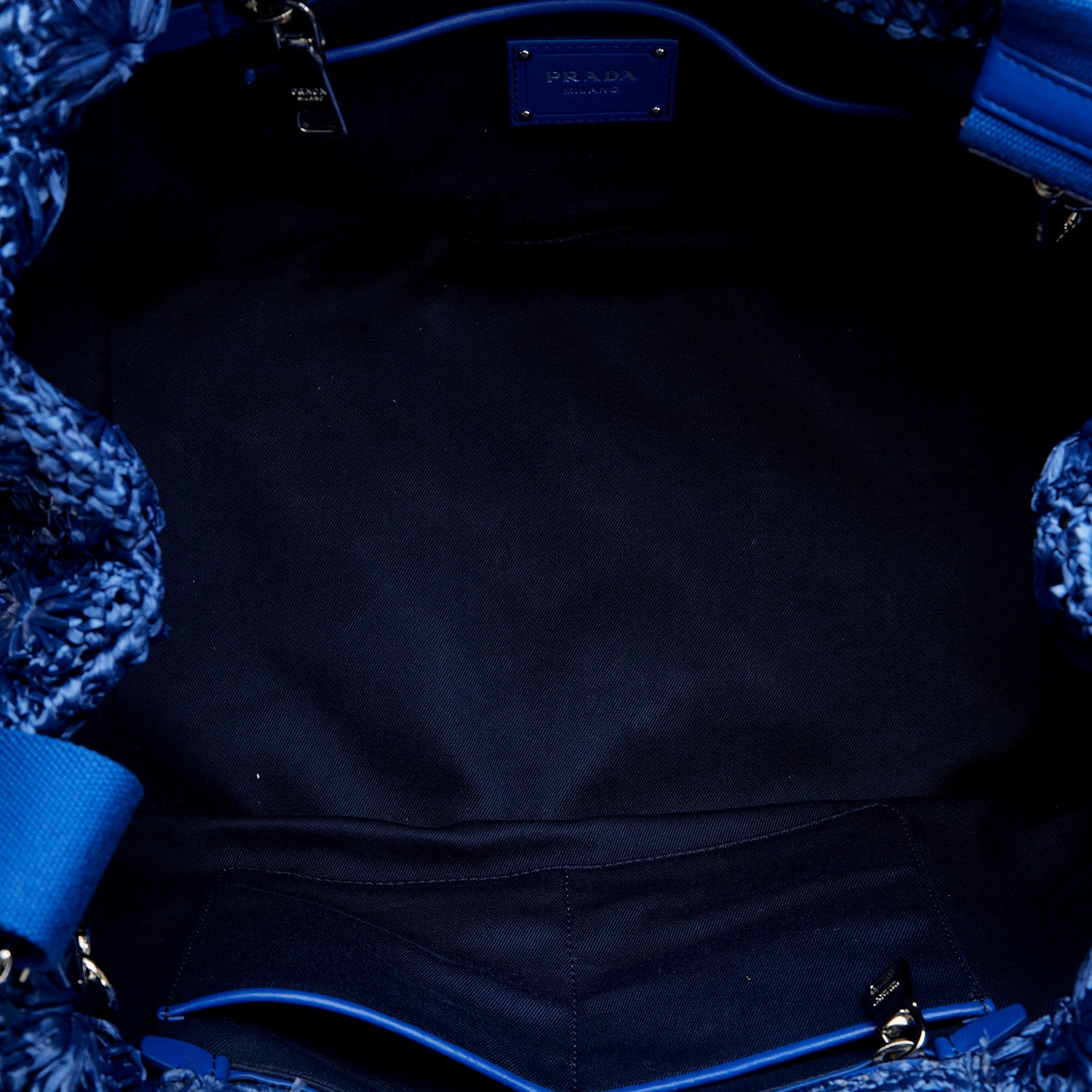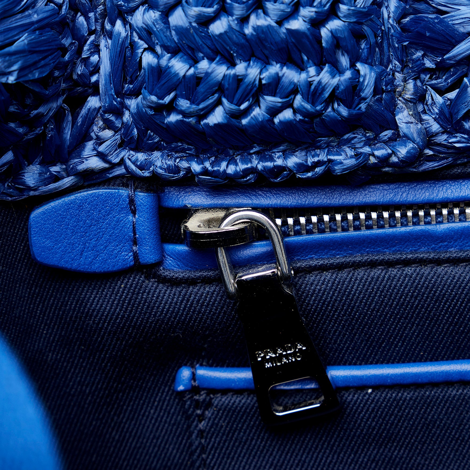 This canapa was made from woven raffia in blue. It features braided handles, a removable flat strap, an open top, and zippered and slip pockets inside.