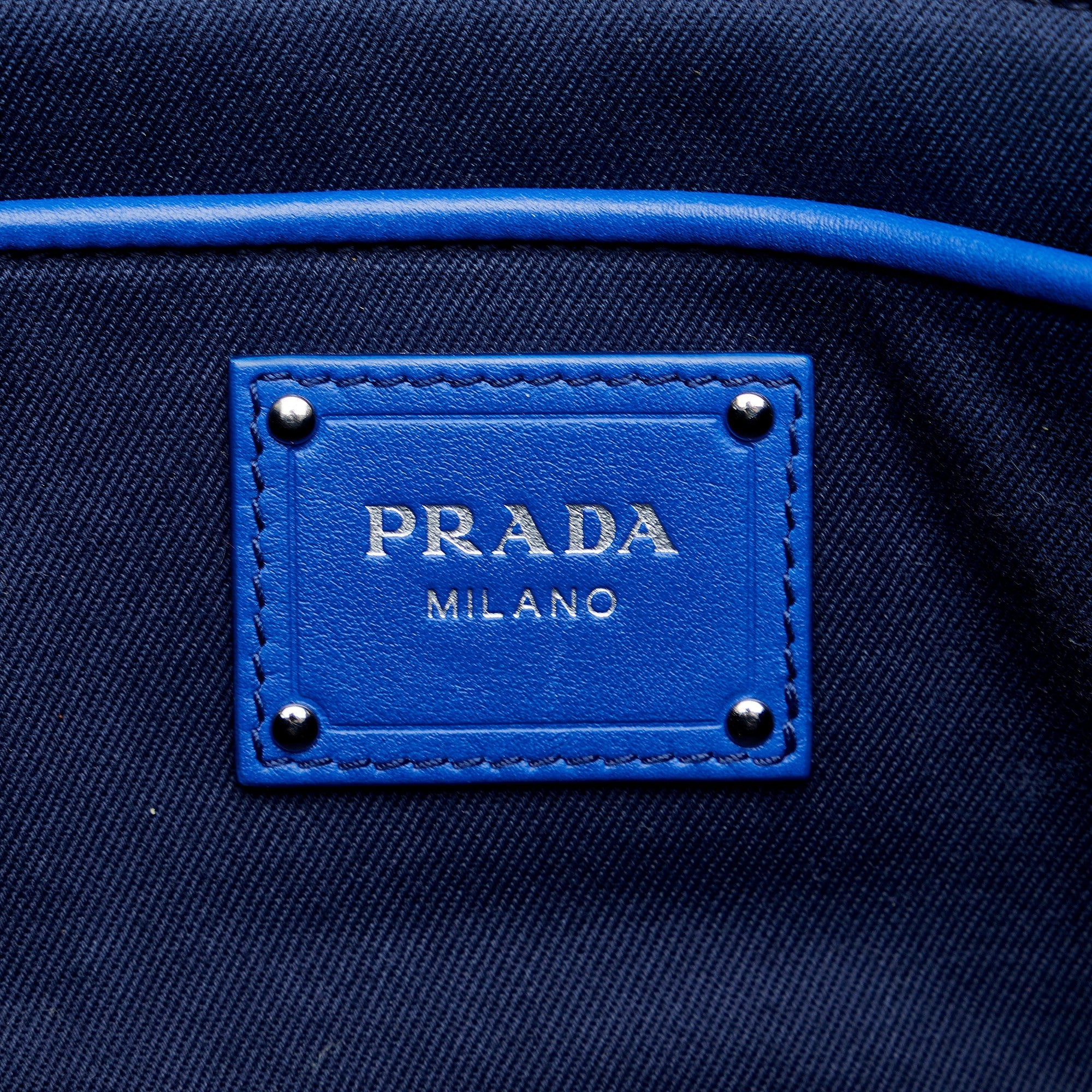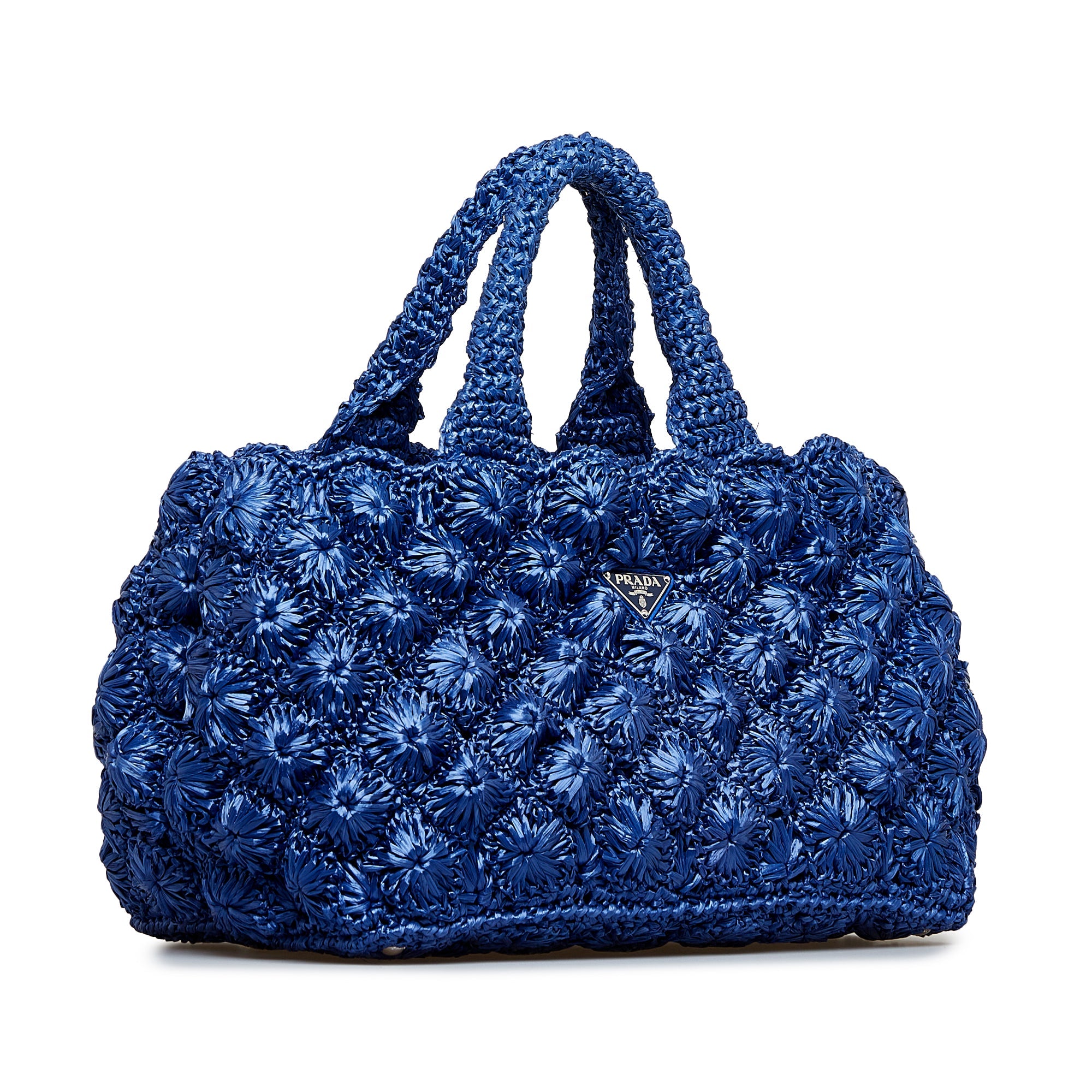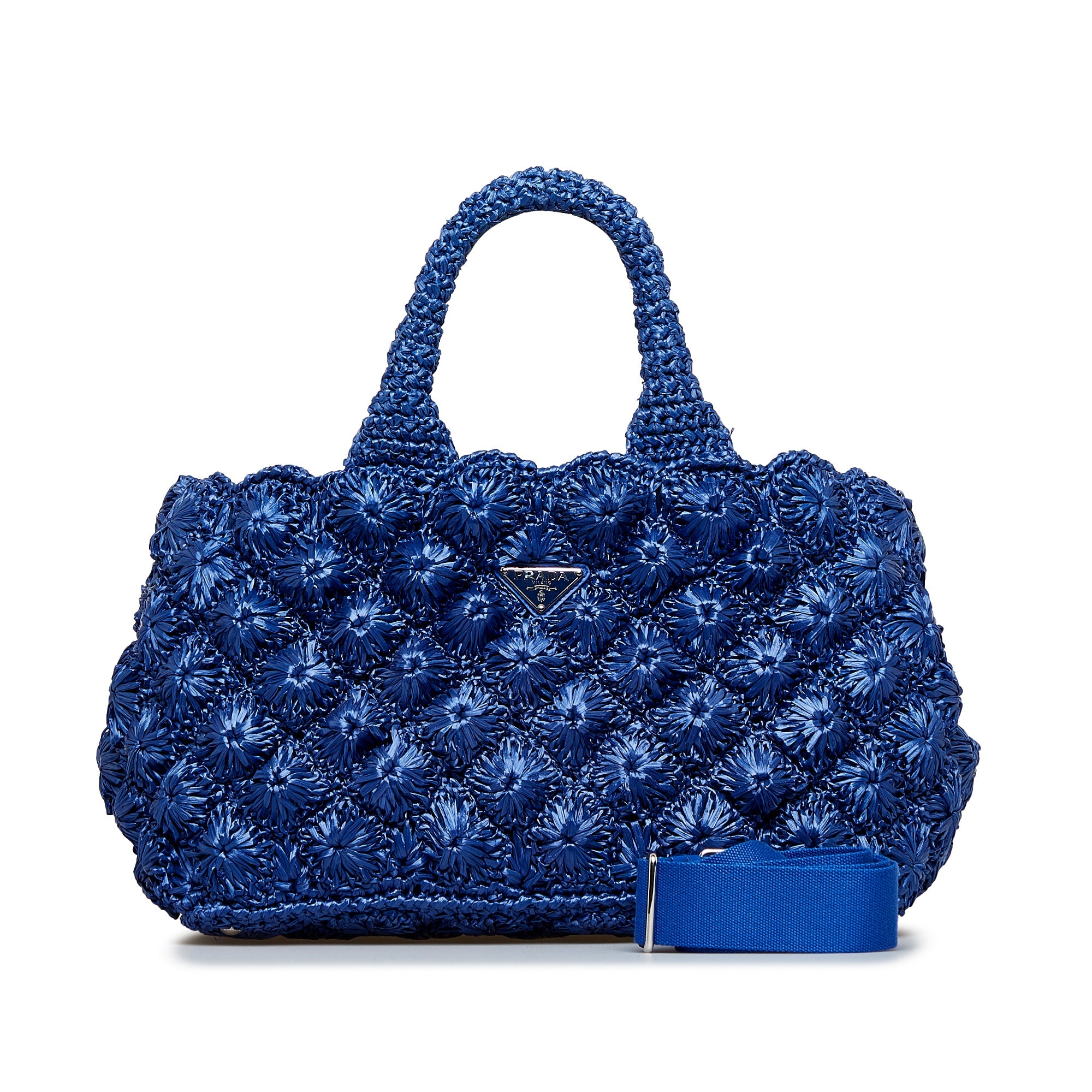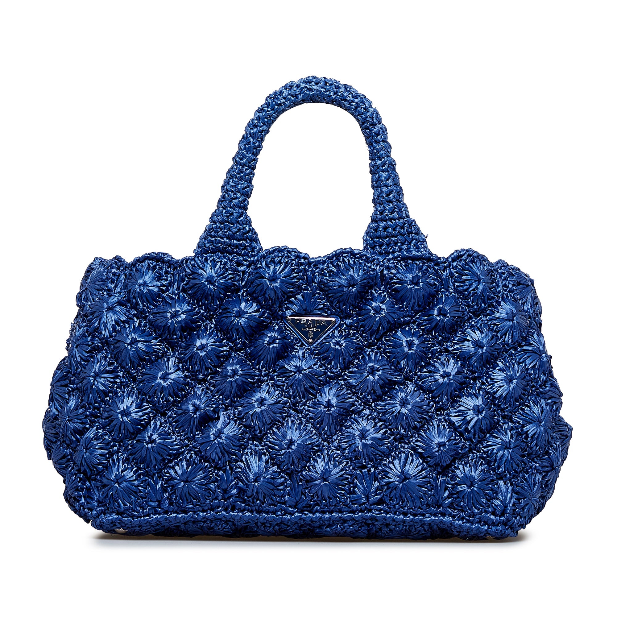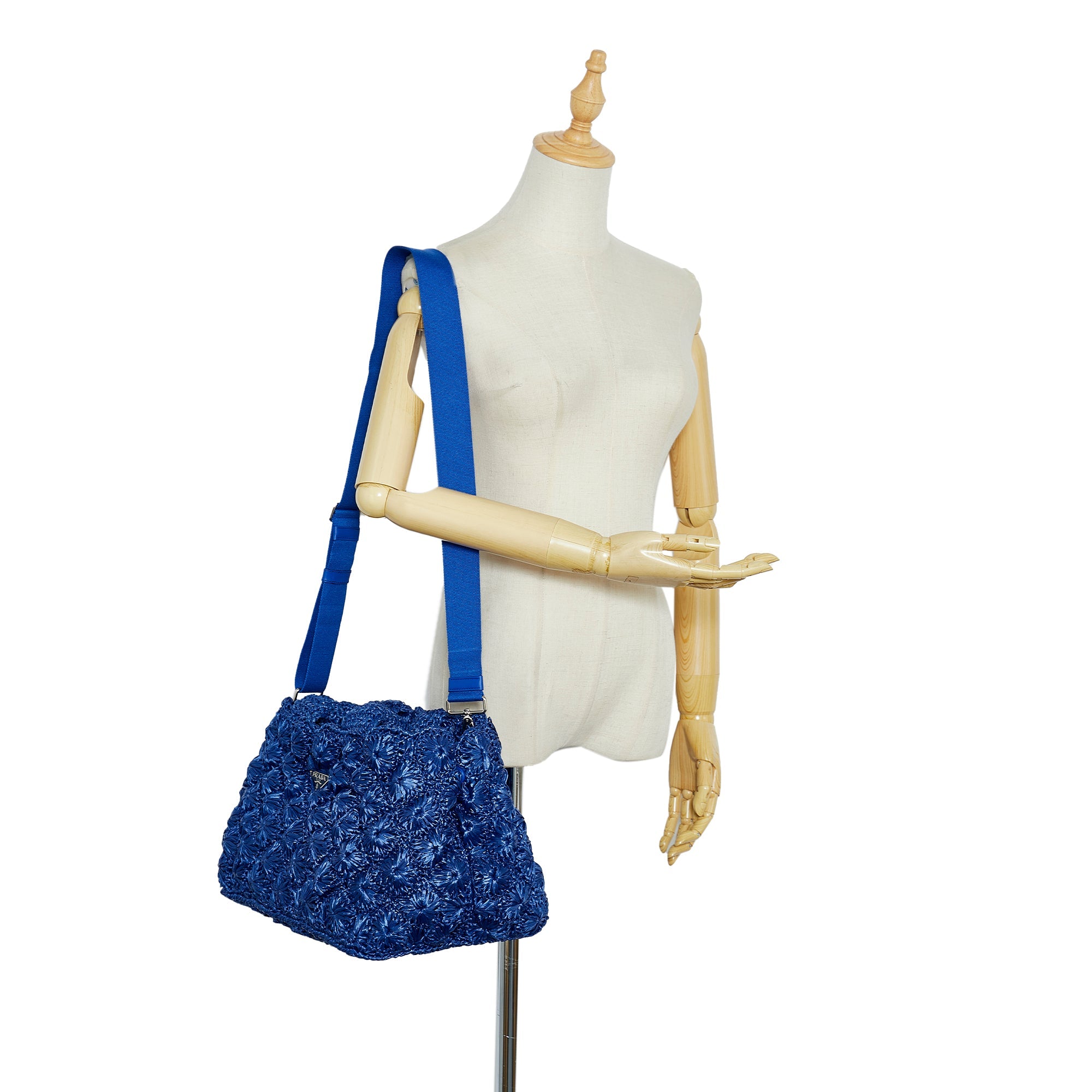 This canapa was made from woven raffia in blue. It features braided handles, a removable flat strap, an open top, and zippered and slip pockets inside.