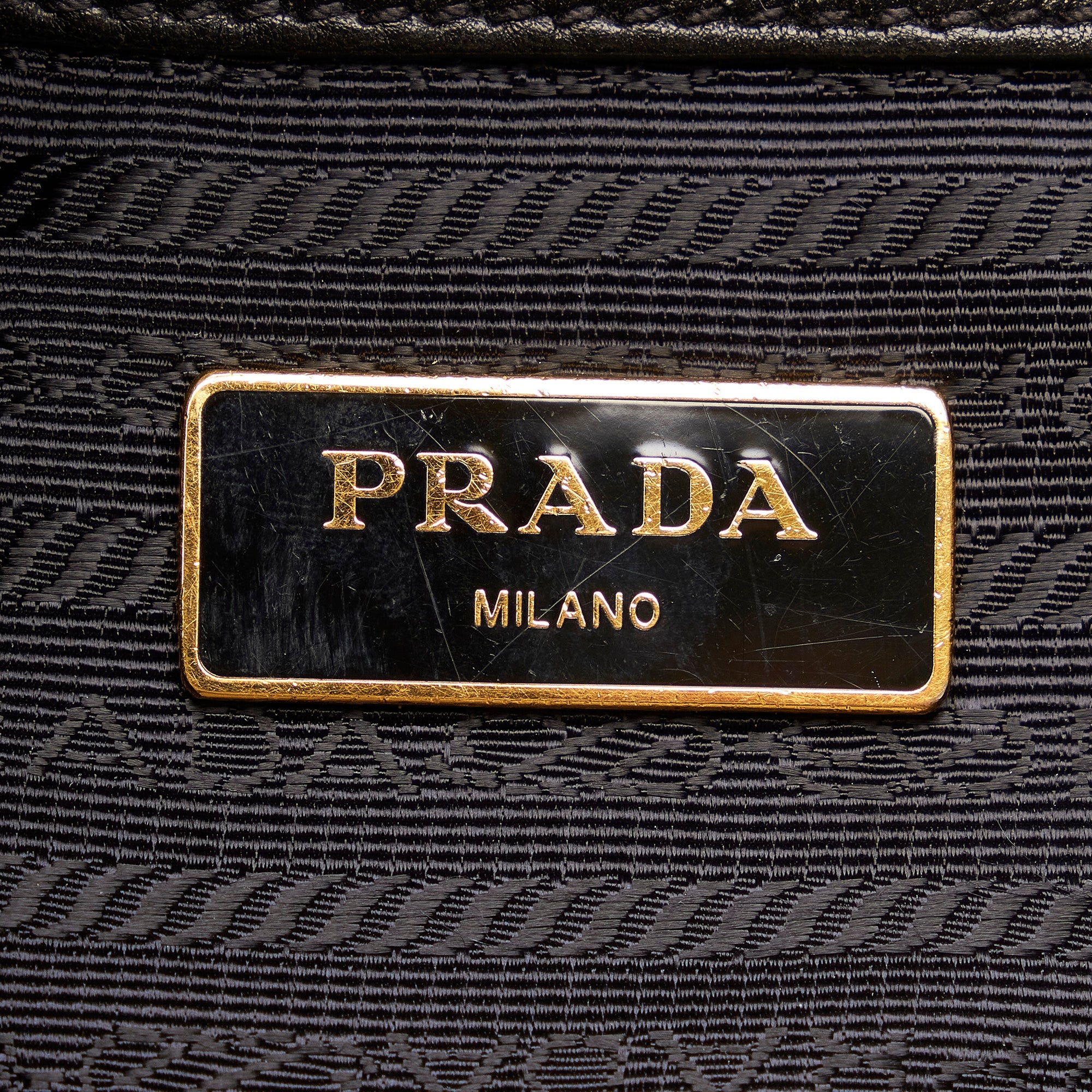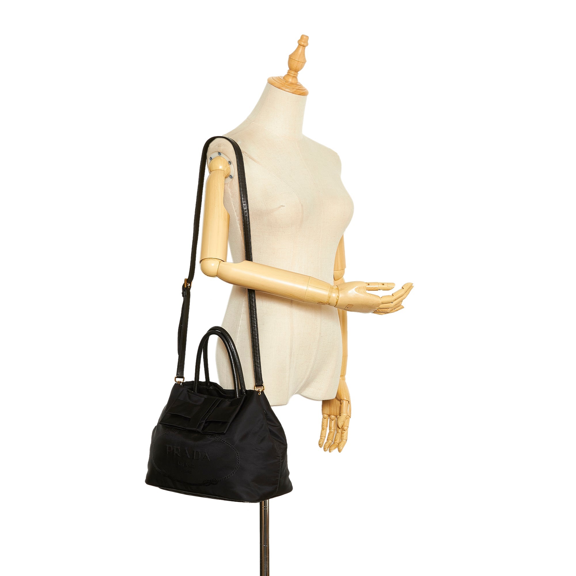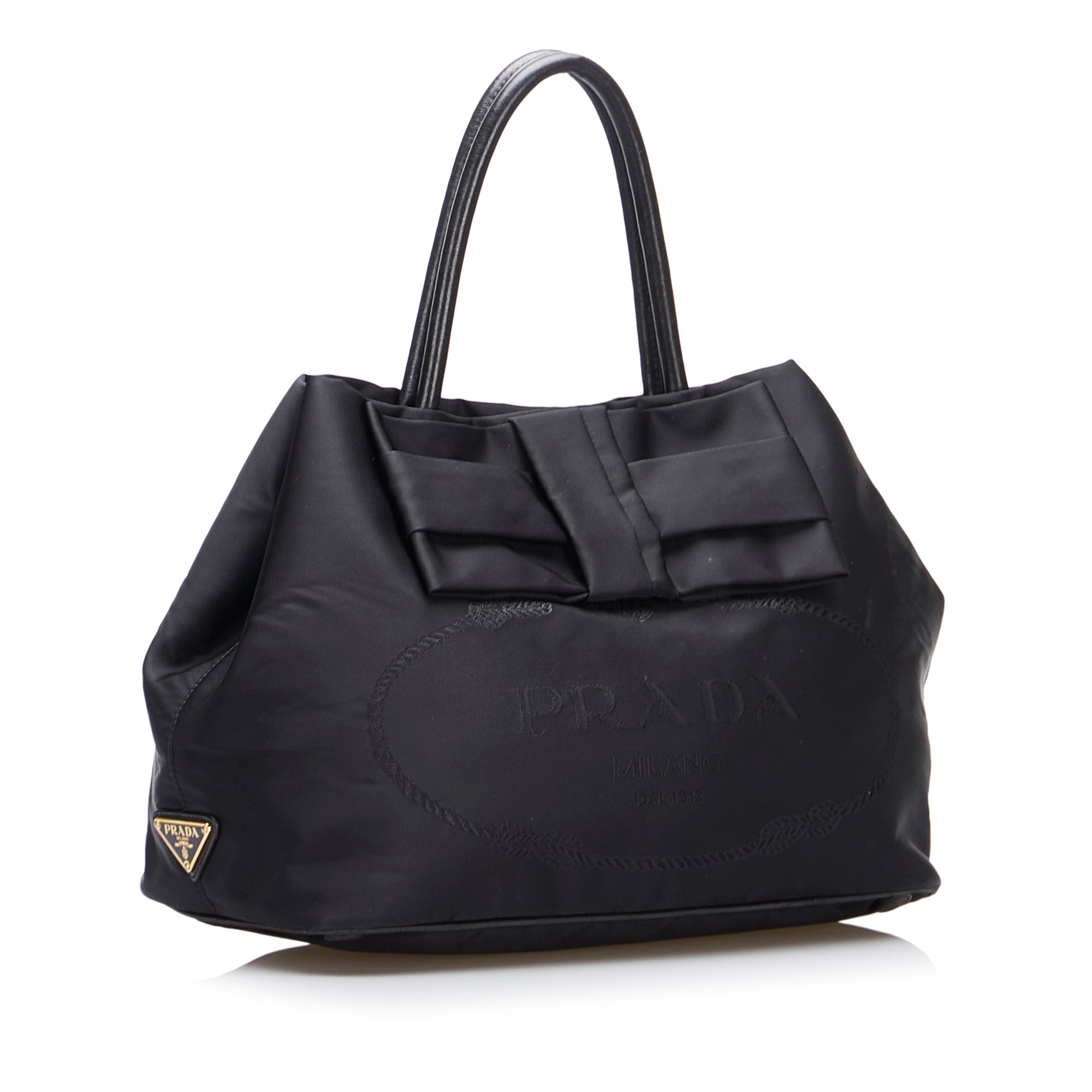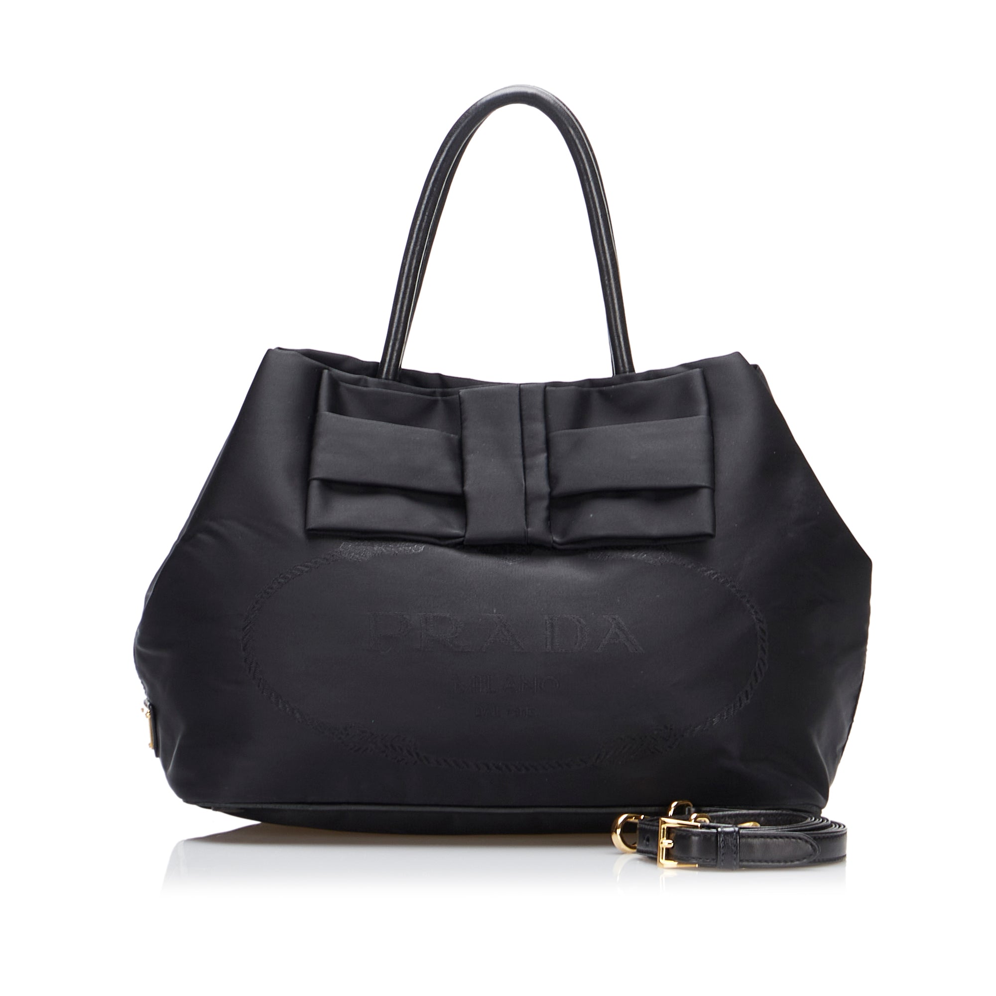 This Prada Canapa Bow handbag is made of black nylon logo canvas. The Bag features gold details, a bow on the front, rolled leather handles, a detachable flat shoulder strap, an open top, and zippered and slip pockets inside. The Bag can be carried in hand and arm or loosely over the shoulder.