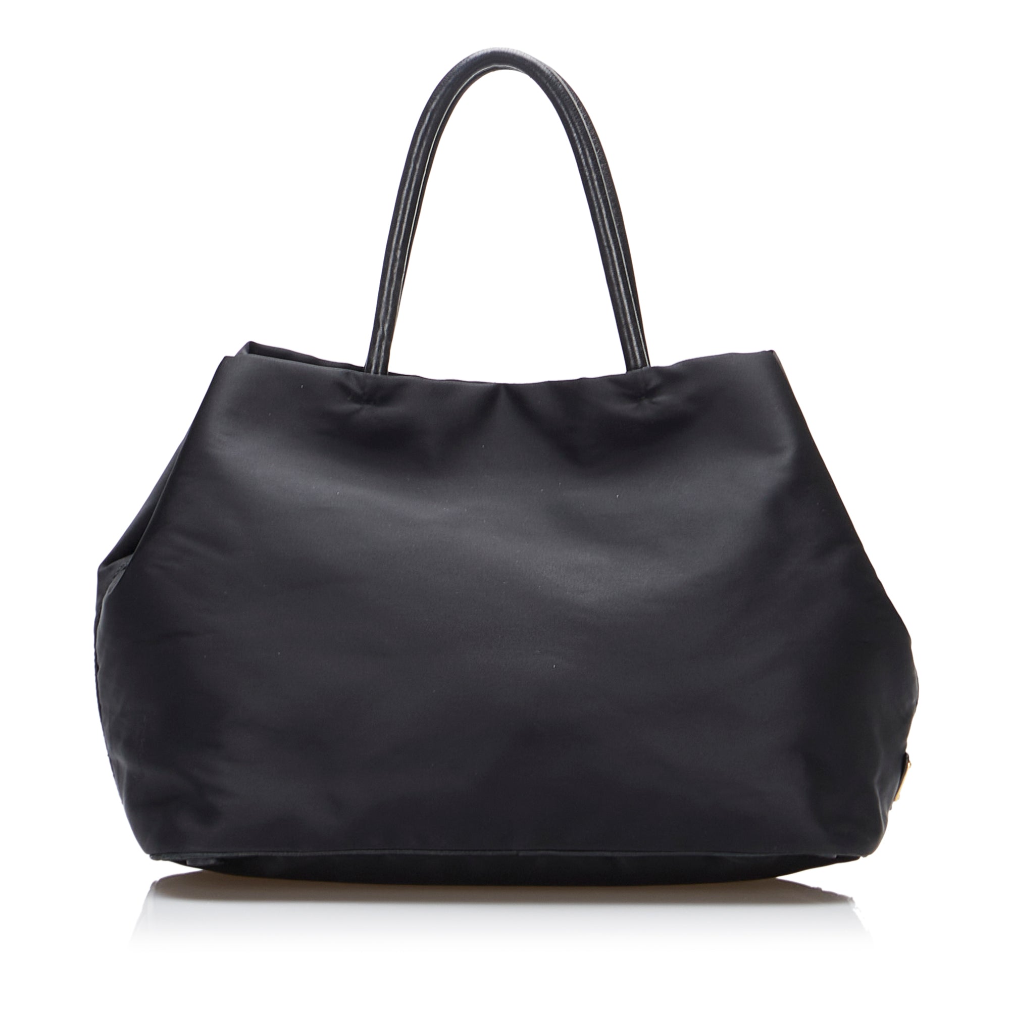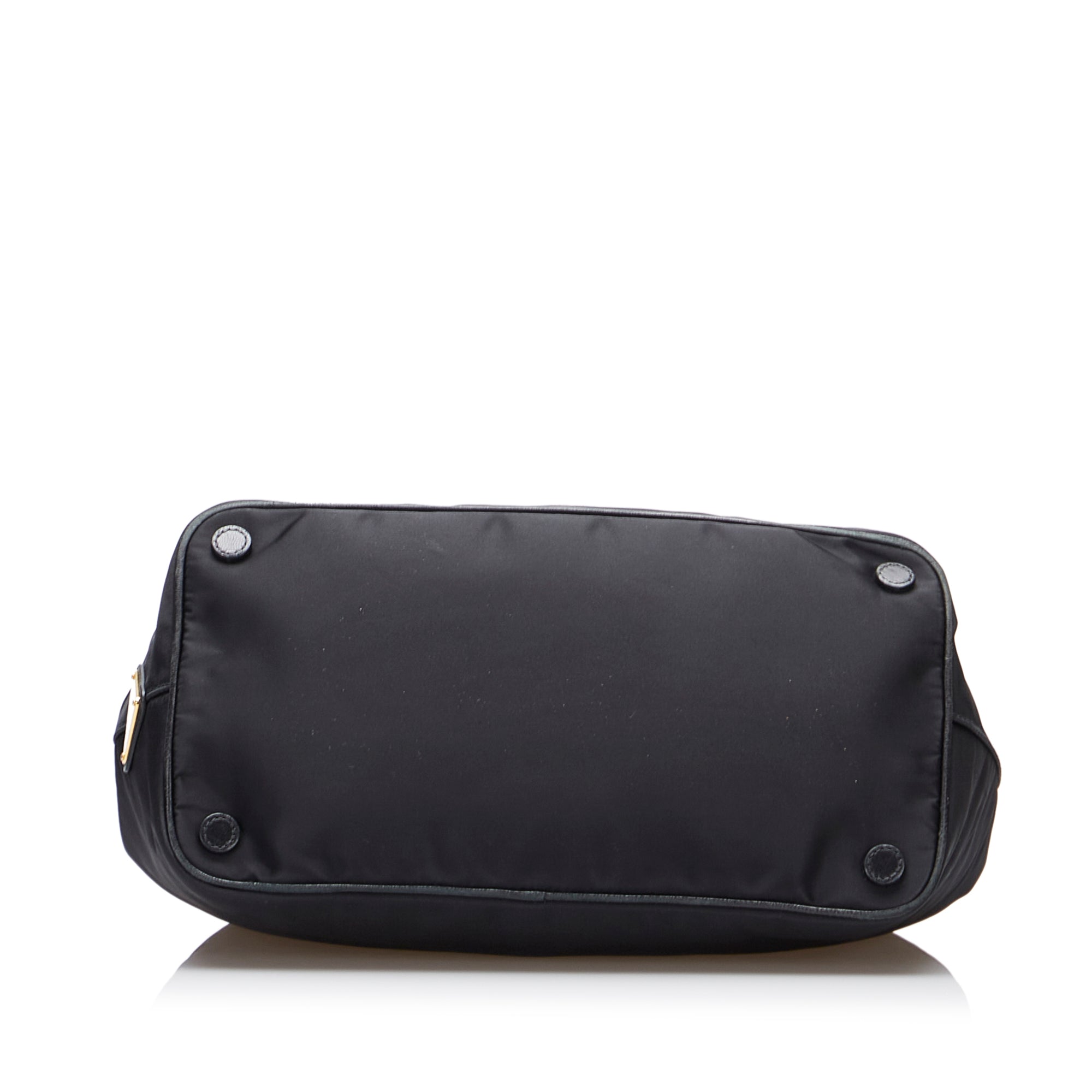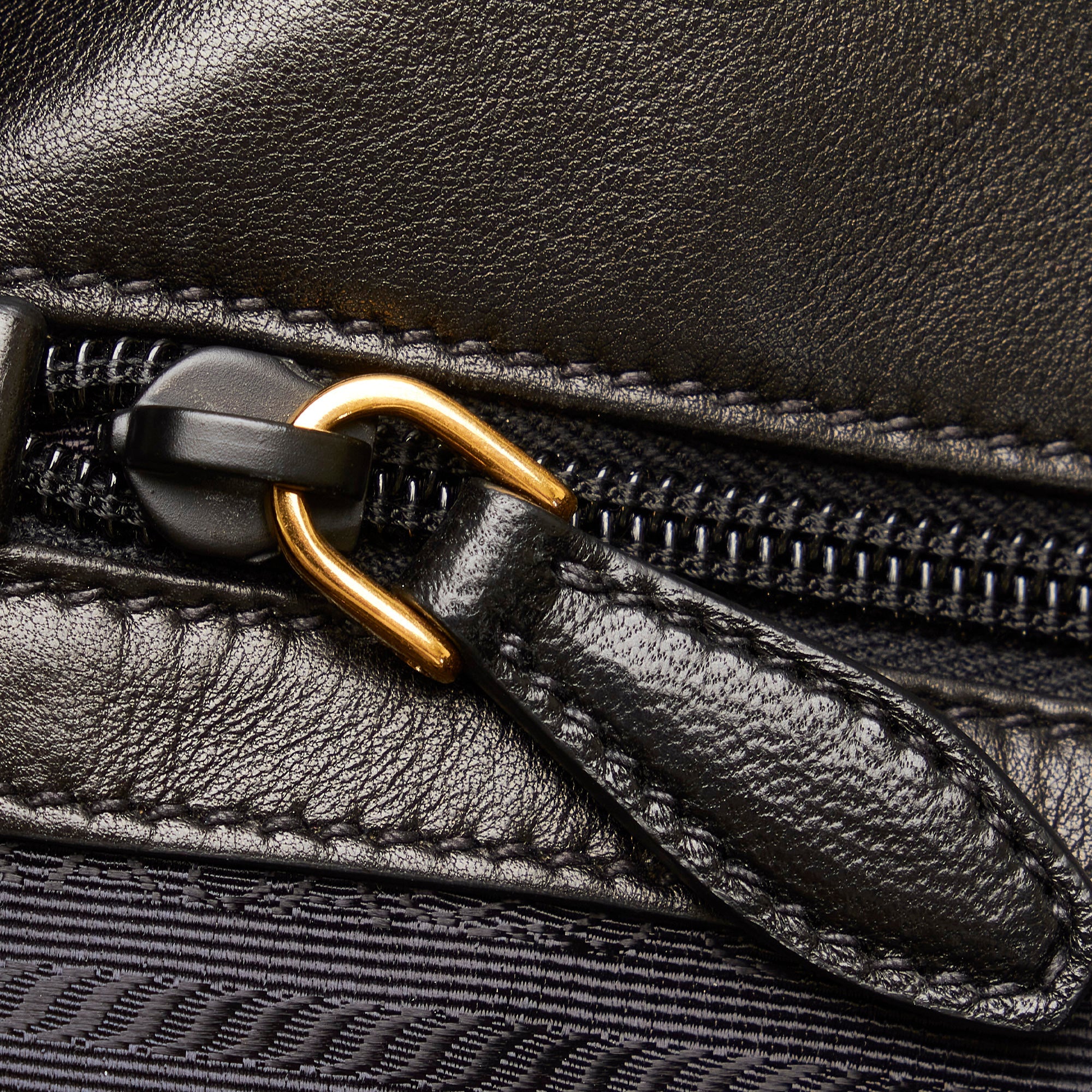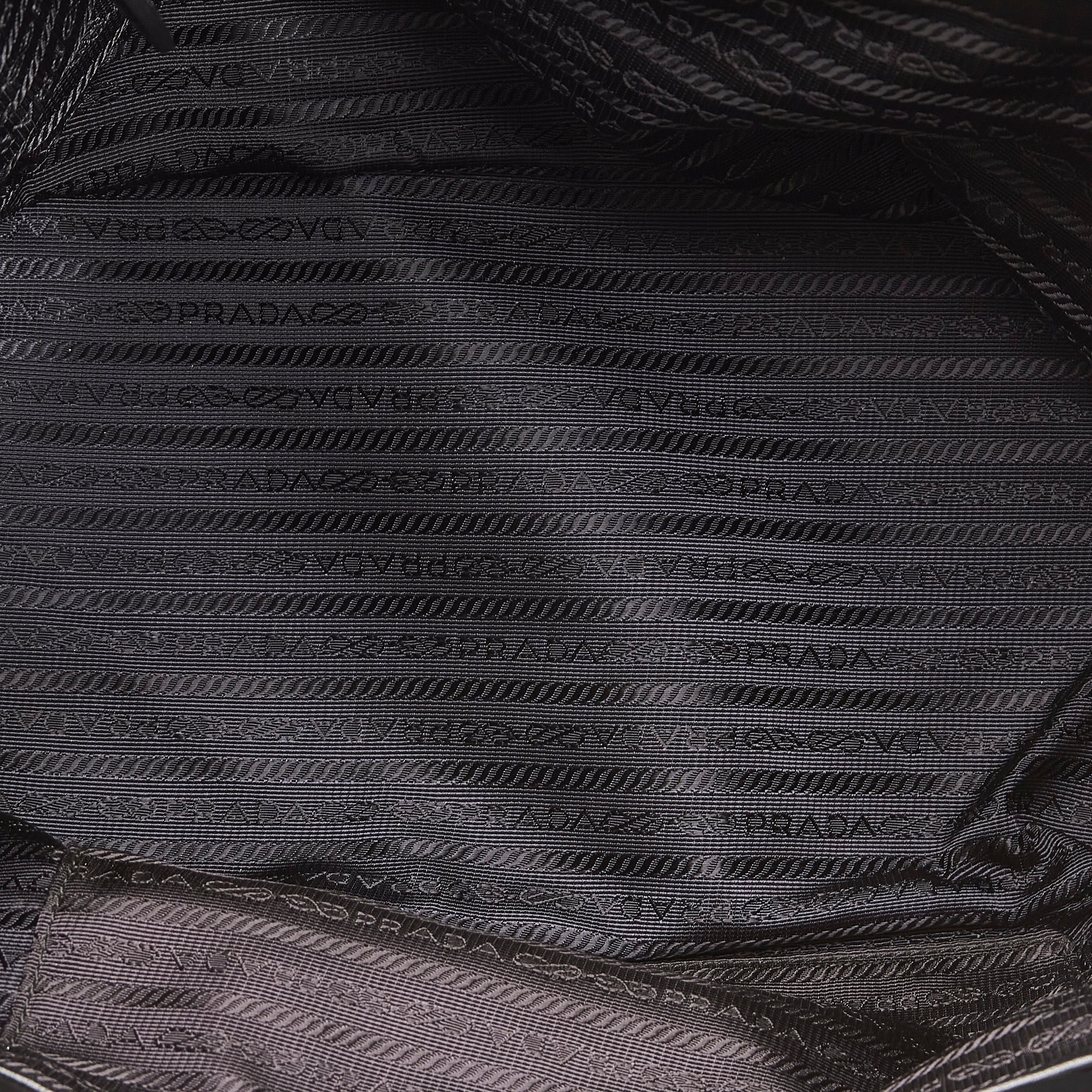 This Prada Canapa Bow handbag is made of black nylon logo canvas. The Bag features gold details, a bow on the front, rolled leather handles, a detachable flat shoulder strap, an open top, and zippered and slip pockets inside. The Bag can be carried in hand and arm or loosely over the shoulder.