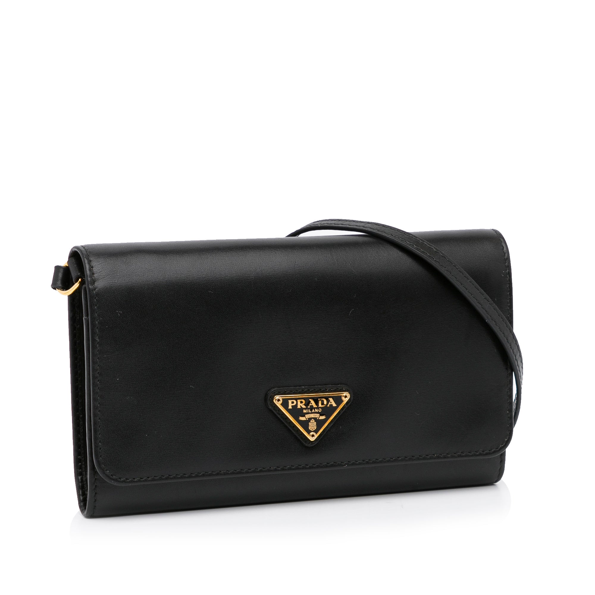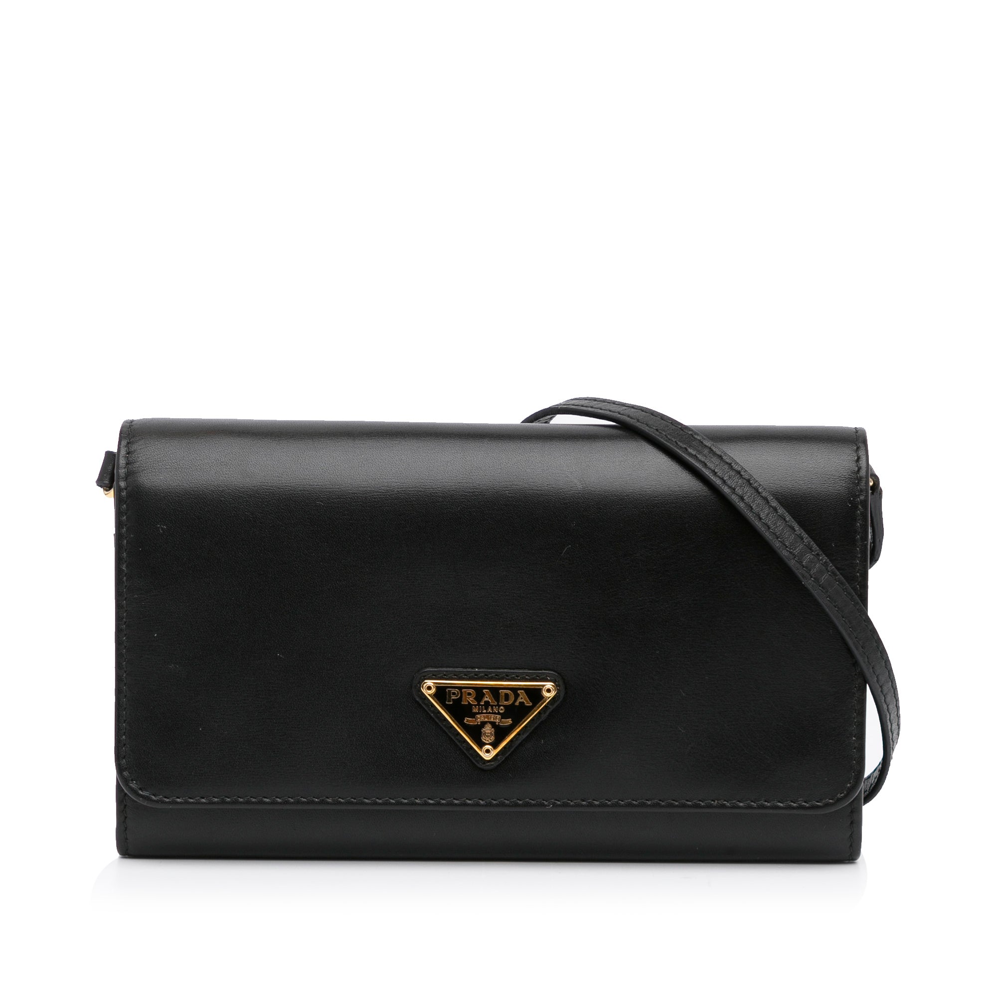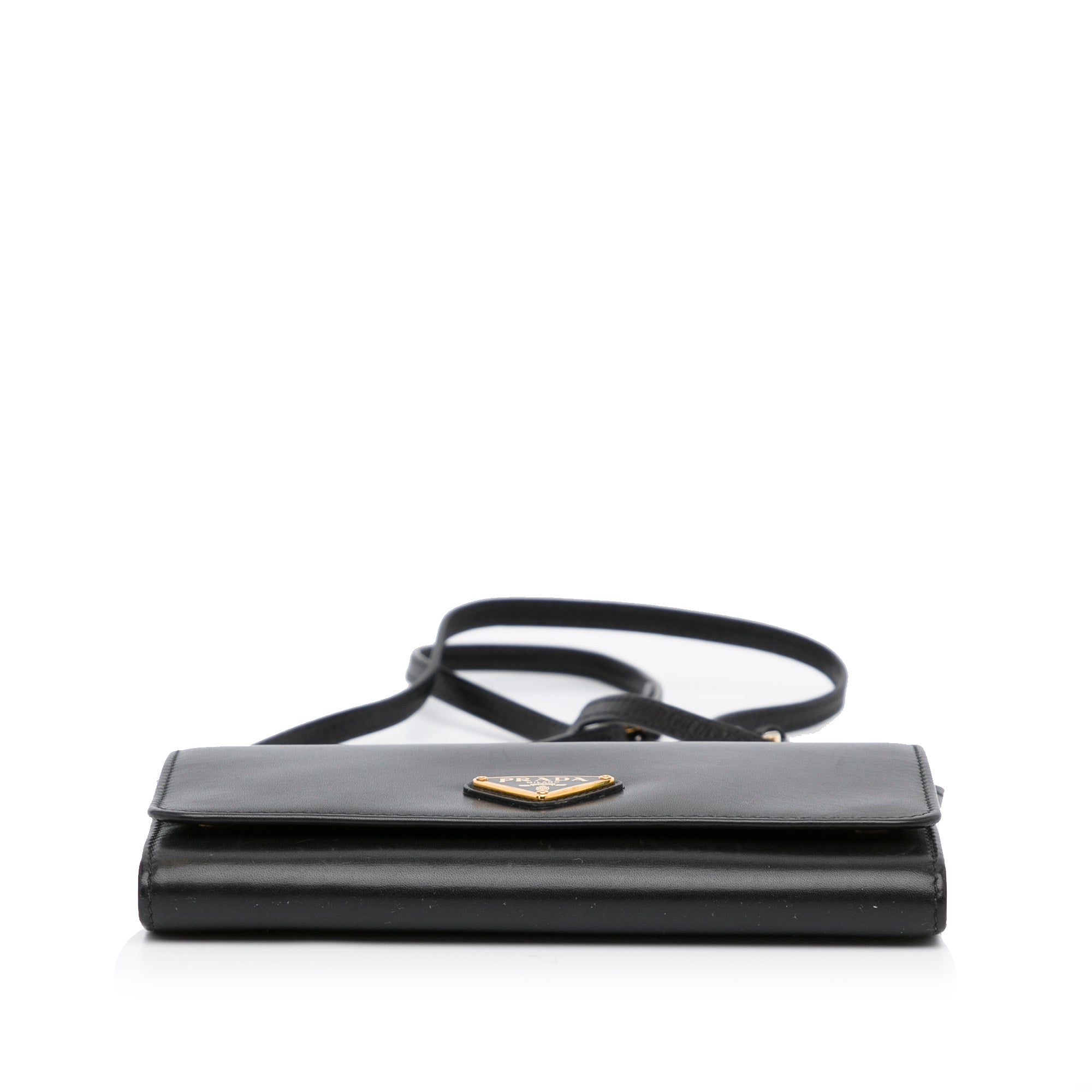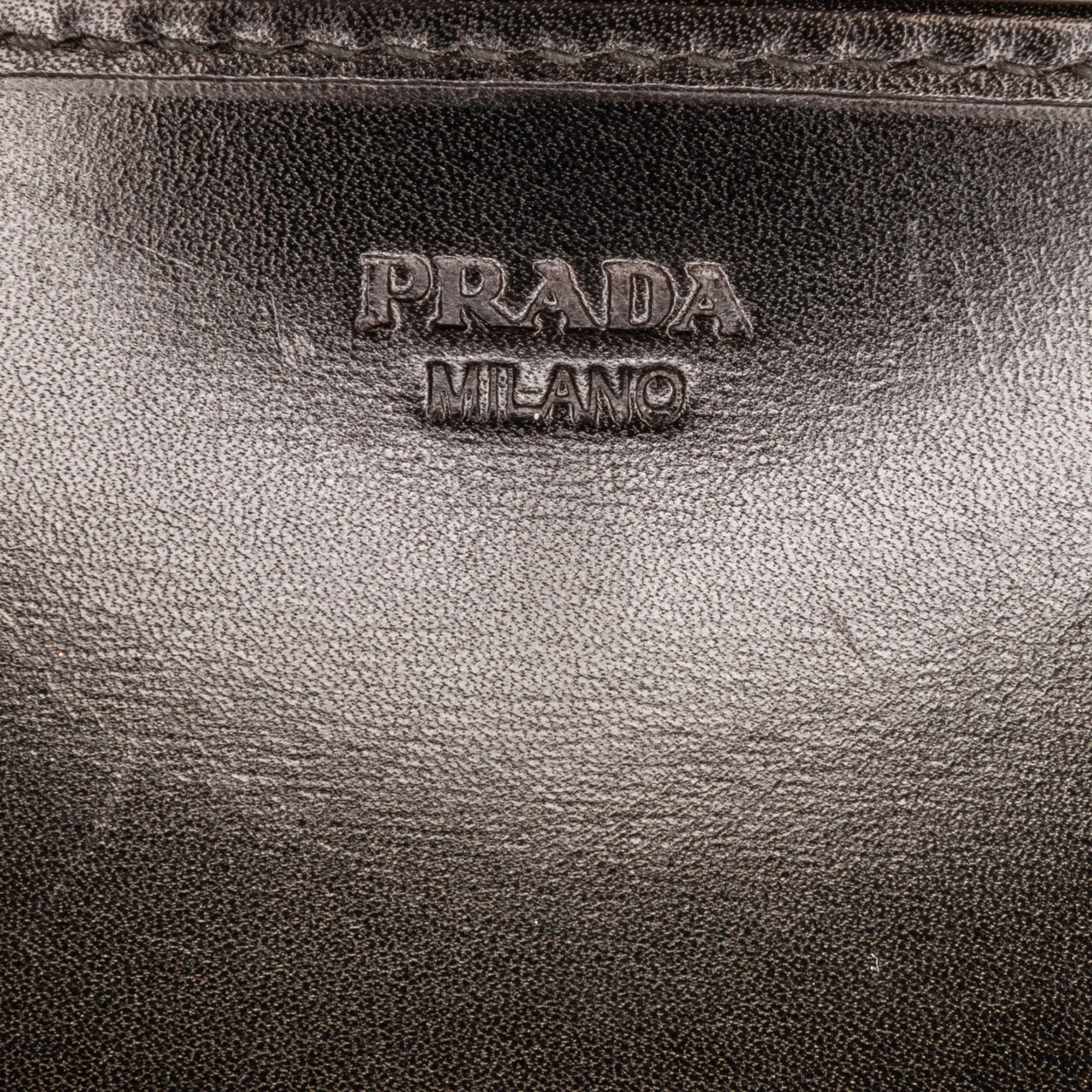 This crossbodyBag from the house of Prada was made of black leather. It has a flat leather strap. It is closed a front flap with magnetic closure. The interior offers the Bag pockets.
