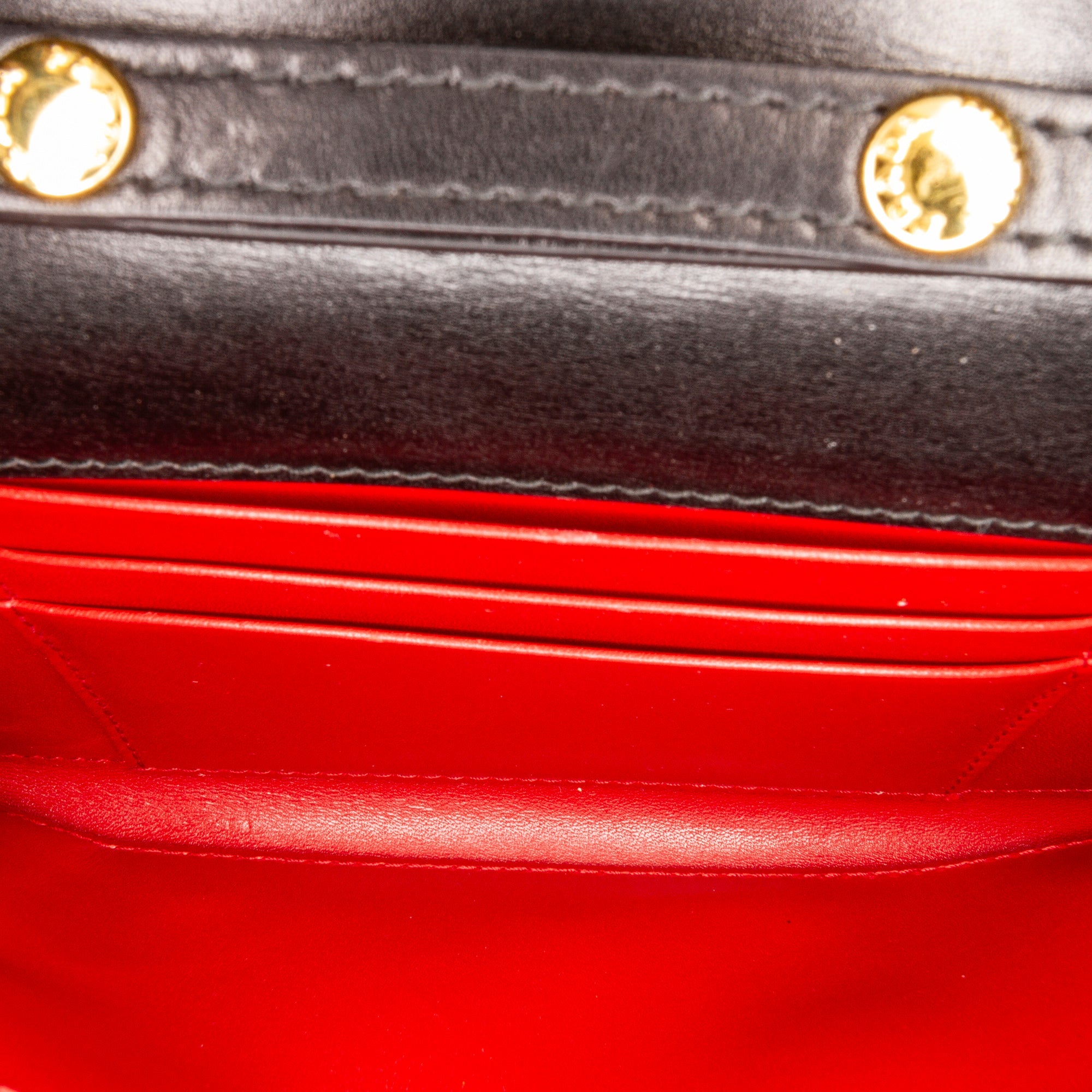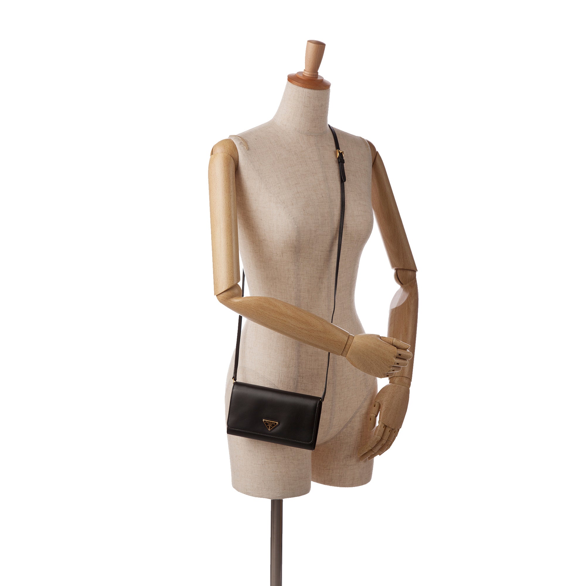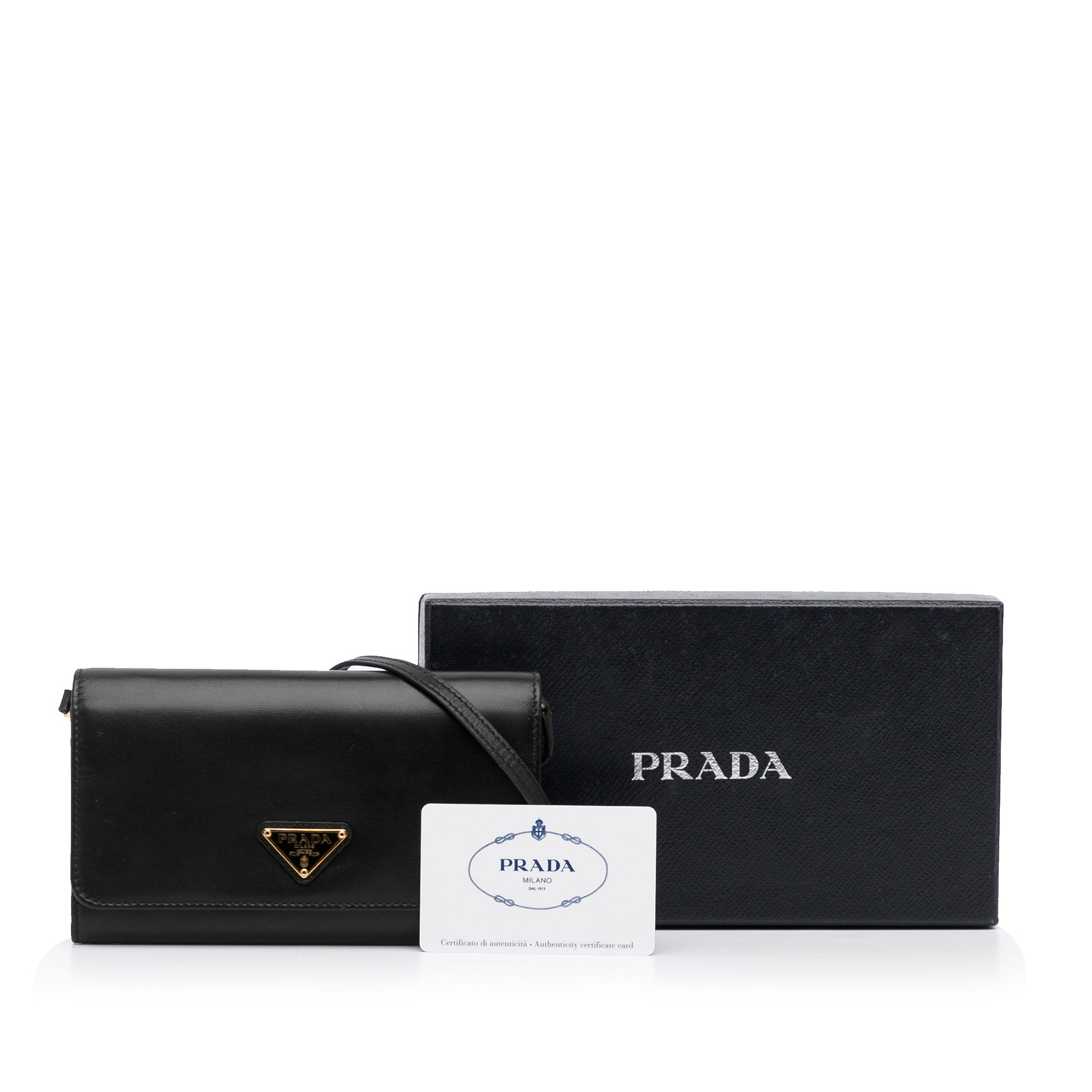 This crossbodyBag from the house of Prada was made of black leather. It has a flat leather strap. It is closed a front flap with magnetic closure. The interior offers the Bag pockets.
