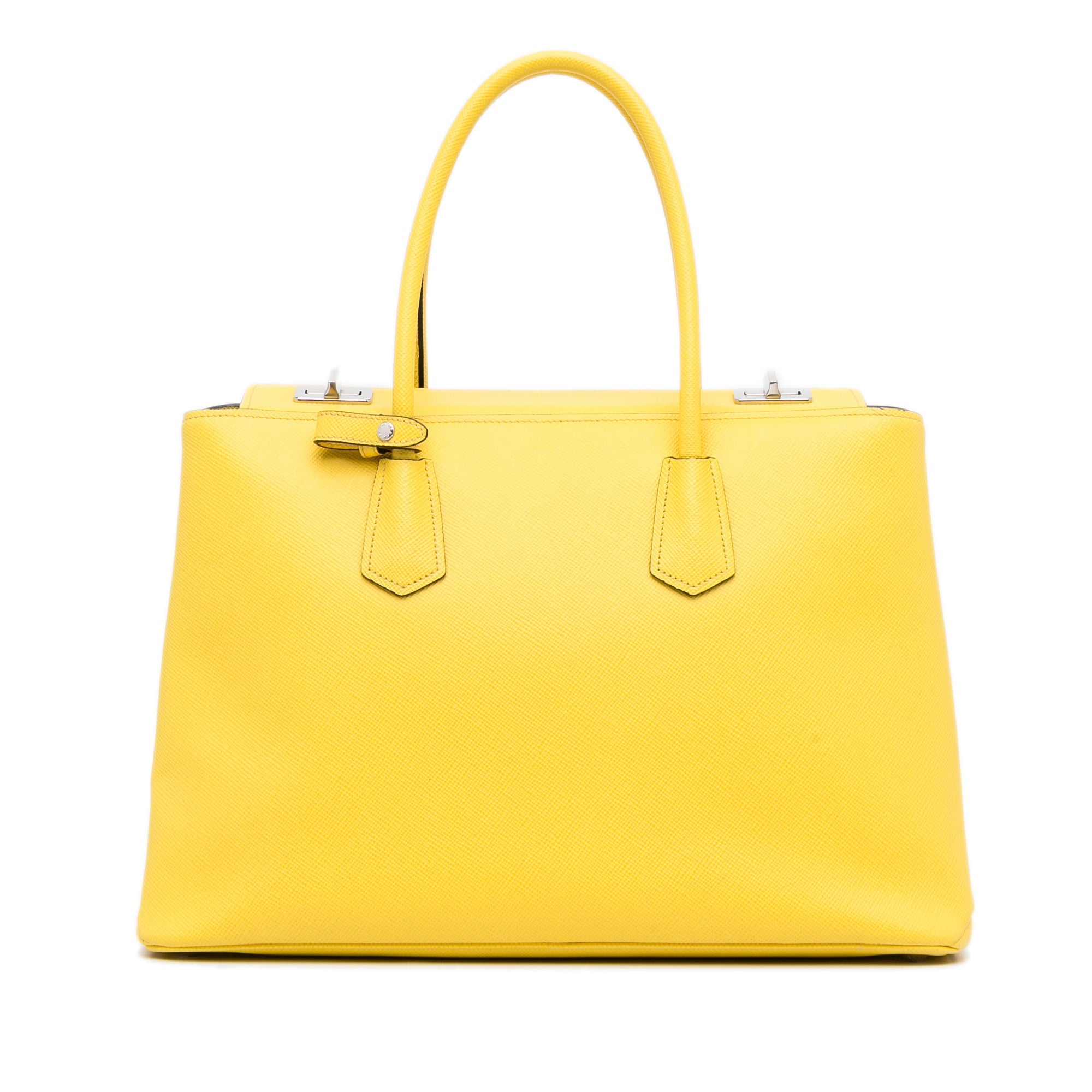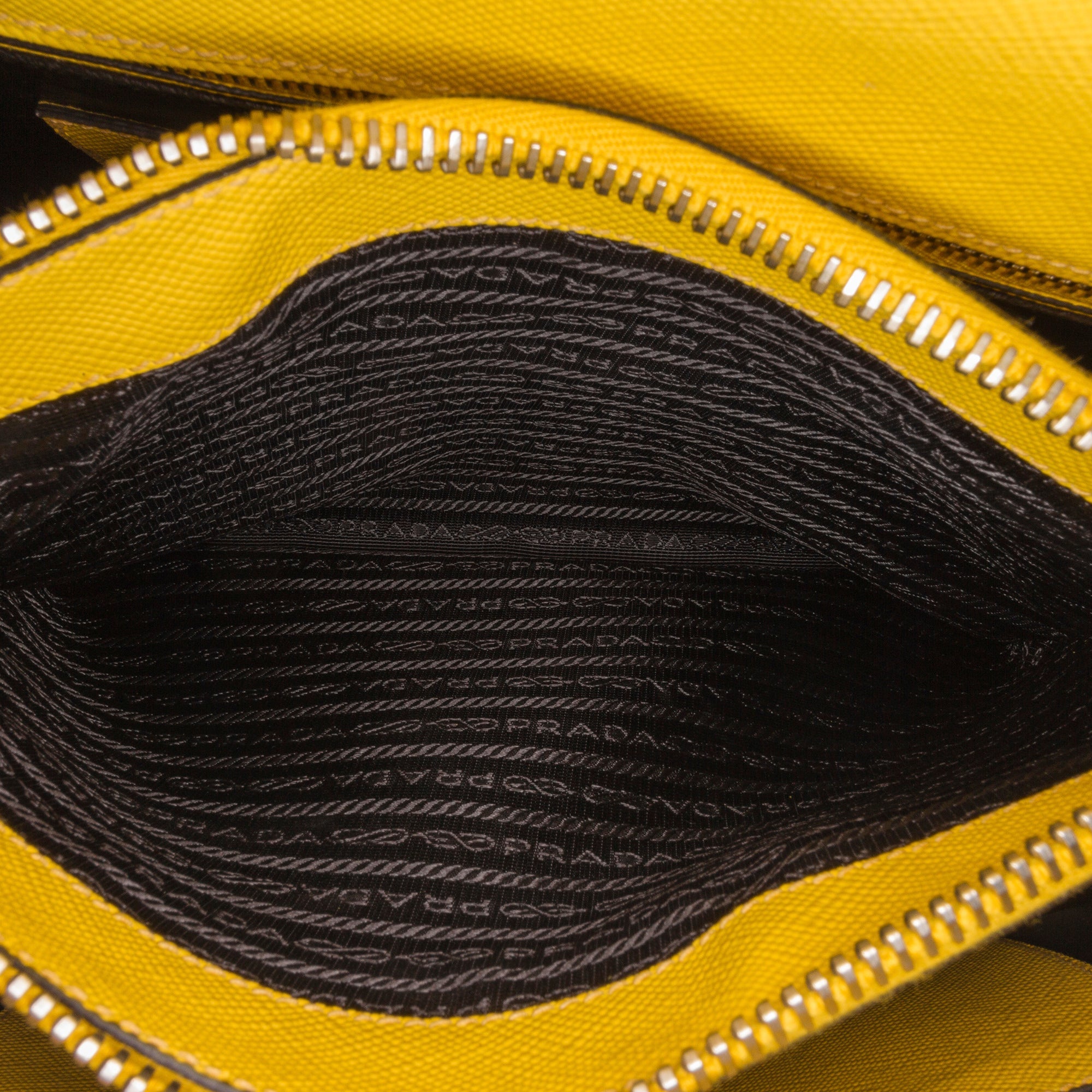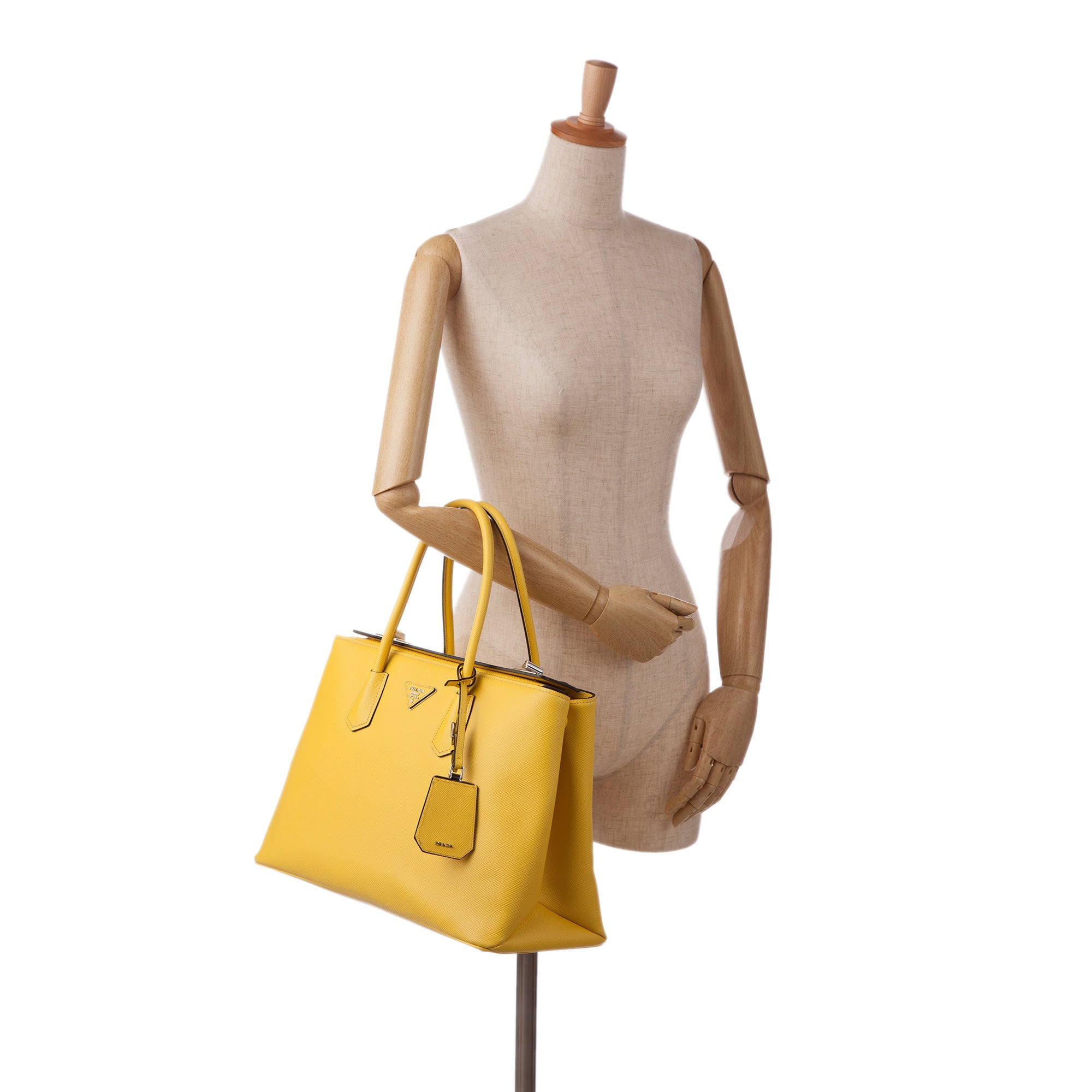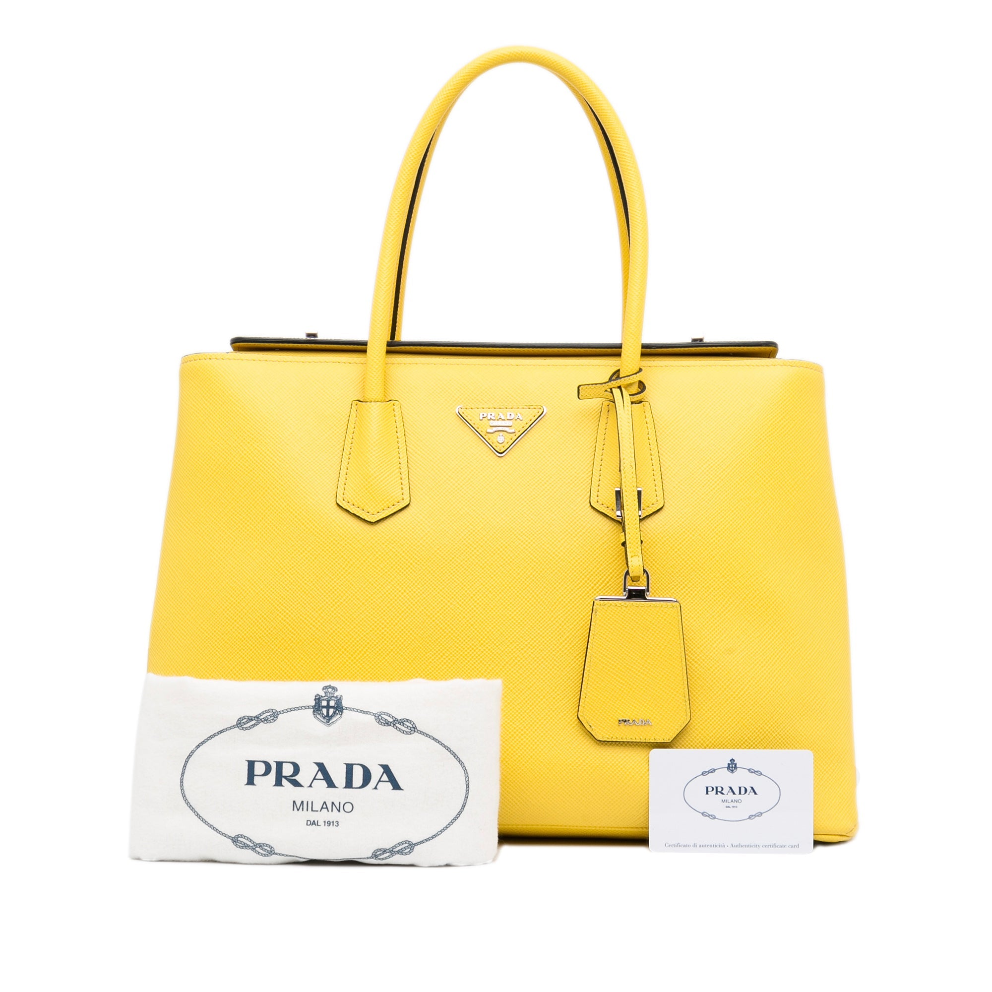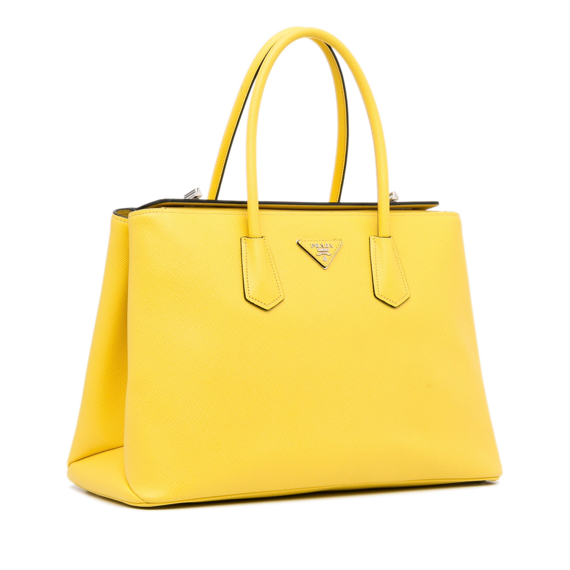 This beautiful Prada Double Cuir Tote is made of yellow Saffiano leather. The Bag features silver-tone details, rolled leather handles, an open top and interior pockets. A very elegant companion and goes with any outfit.