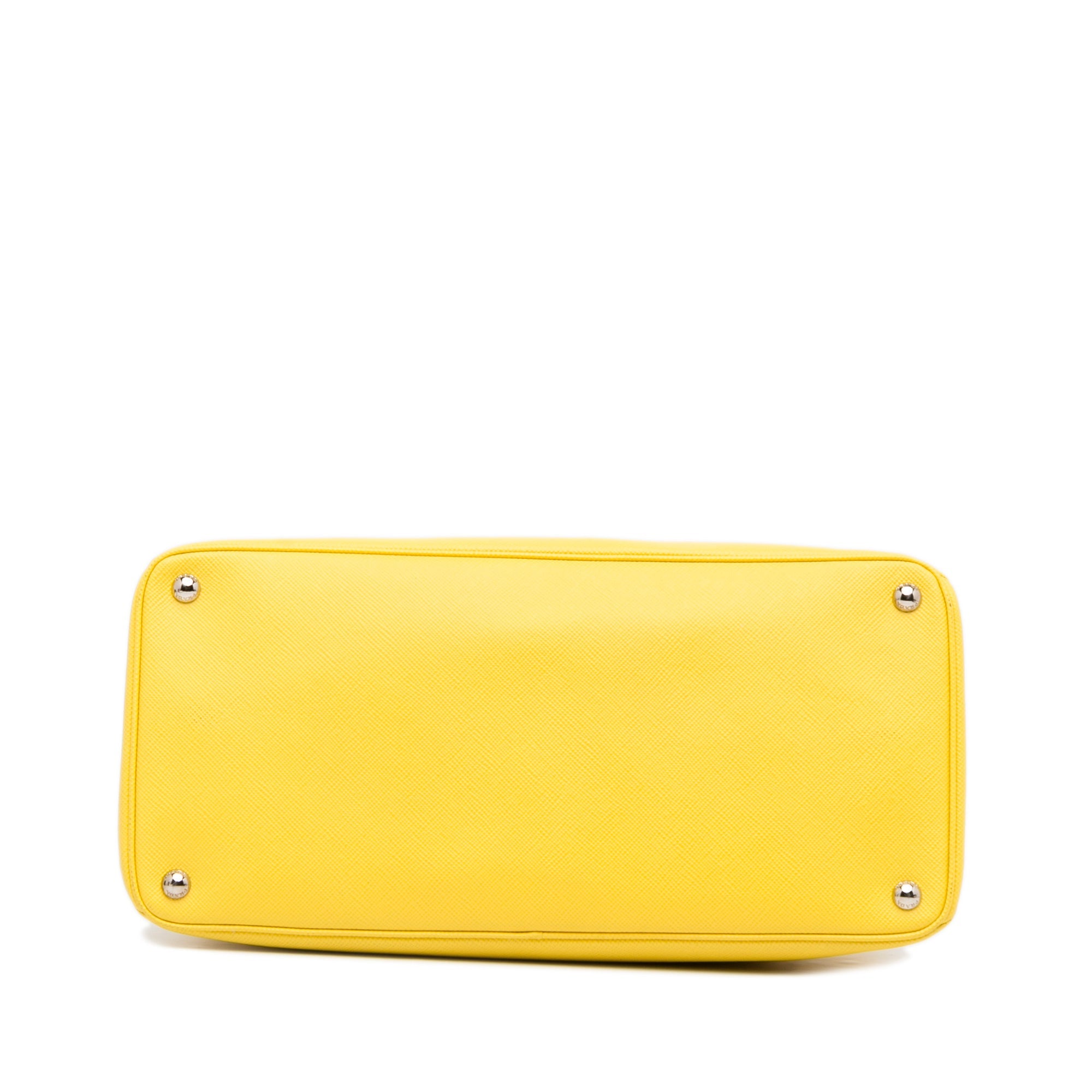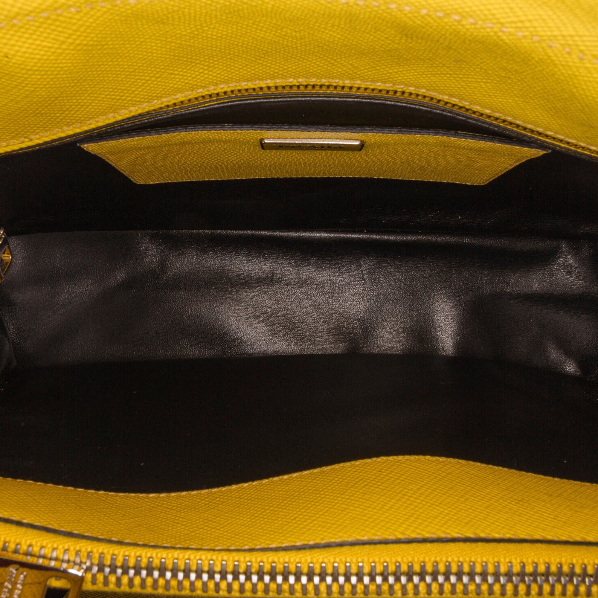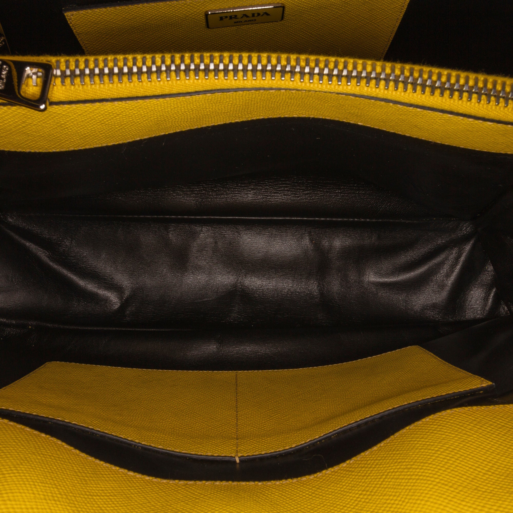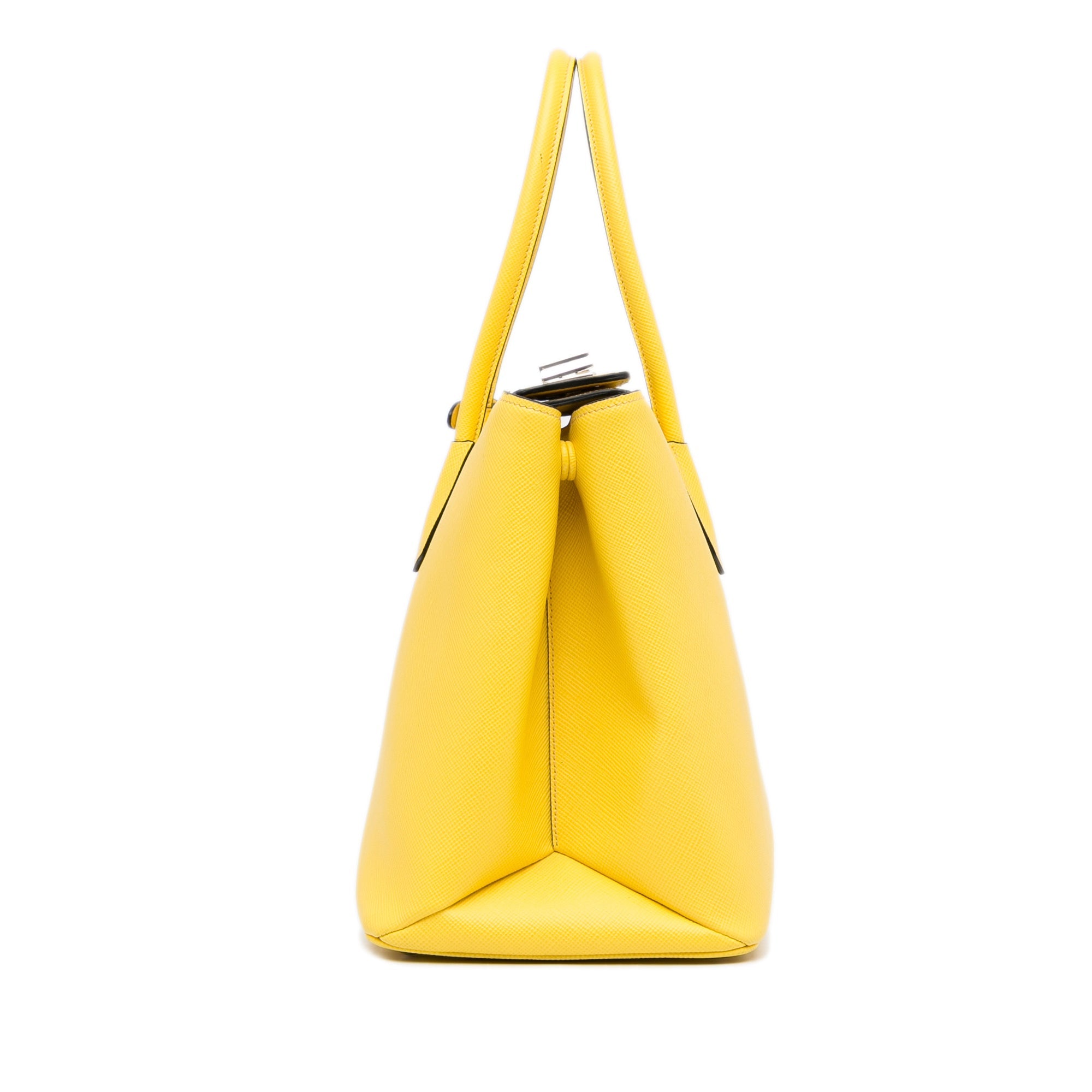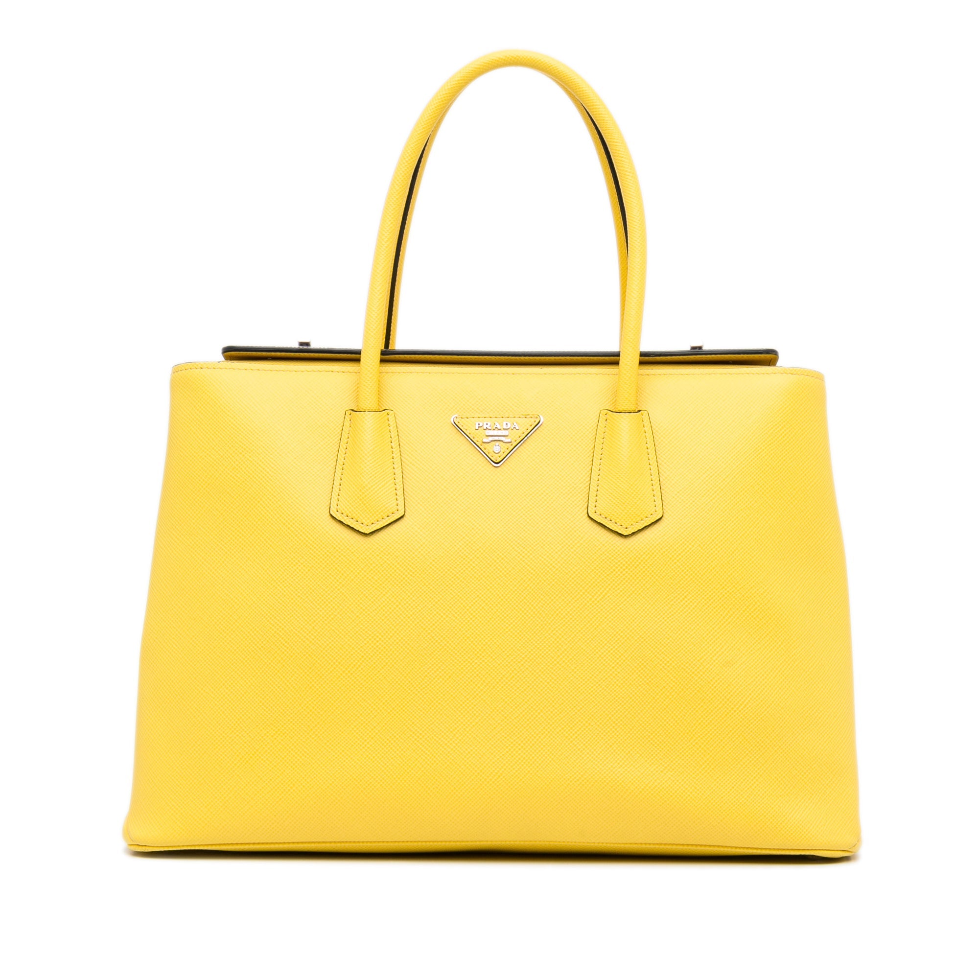 This beautiful Prada Double Cuir Tote is made of yellow Saffiano leather. The Bag features silver-tone details, rolled leather handles, an open top and interior pockets. A very elegant companion and goes with any outfit.