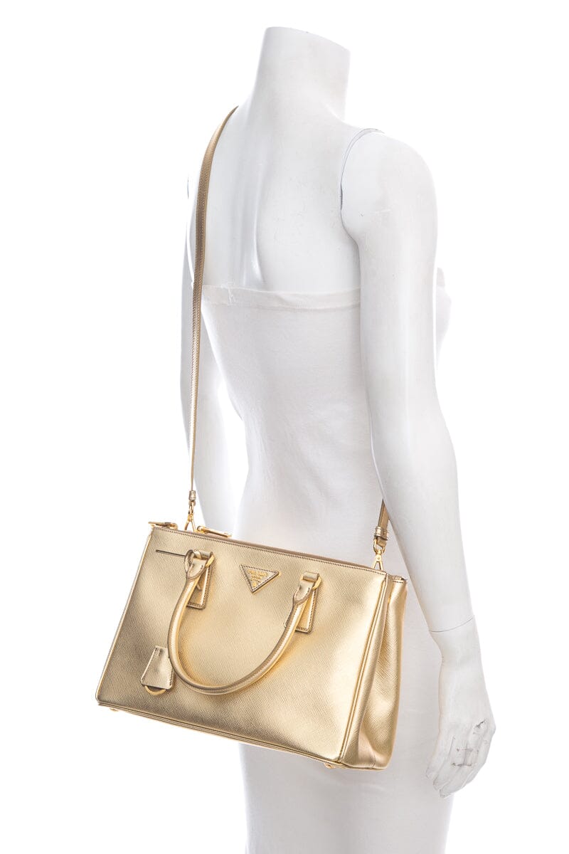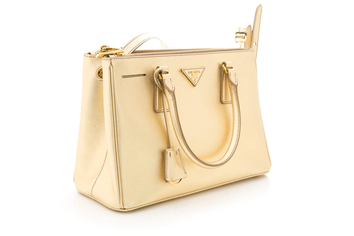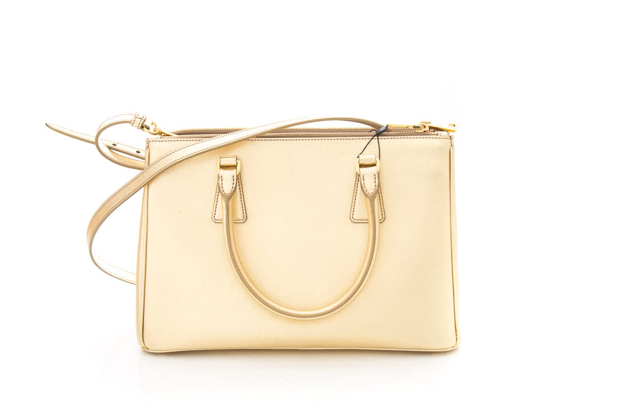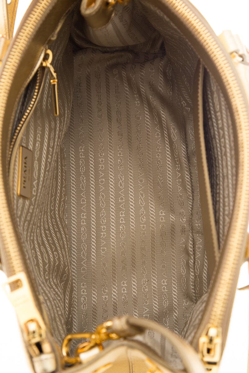 Prada Gold Metallic Saffiano Leather Double Zip Handbag. This item is in very good condition; some slight wear on leather.
