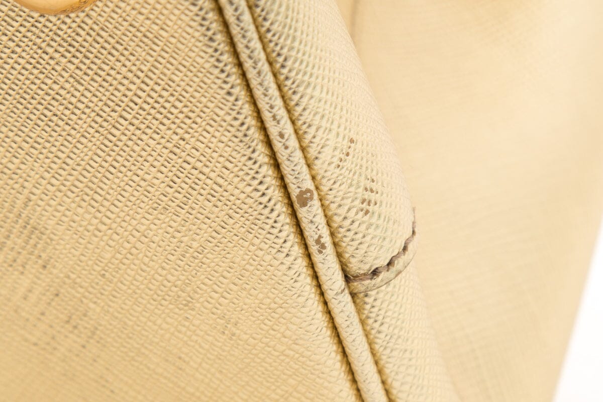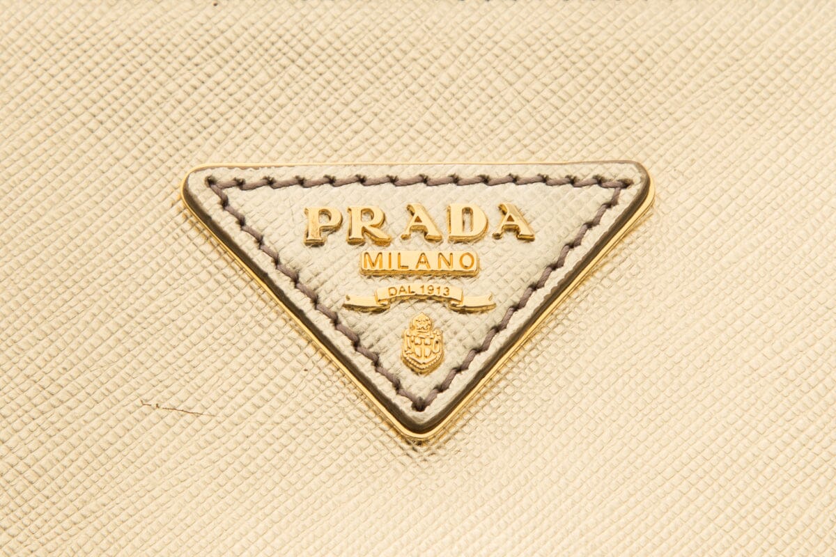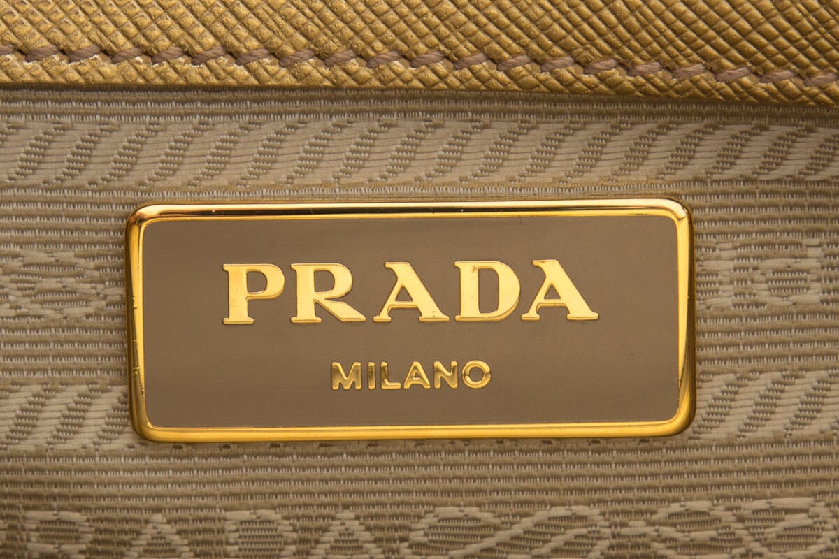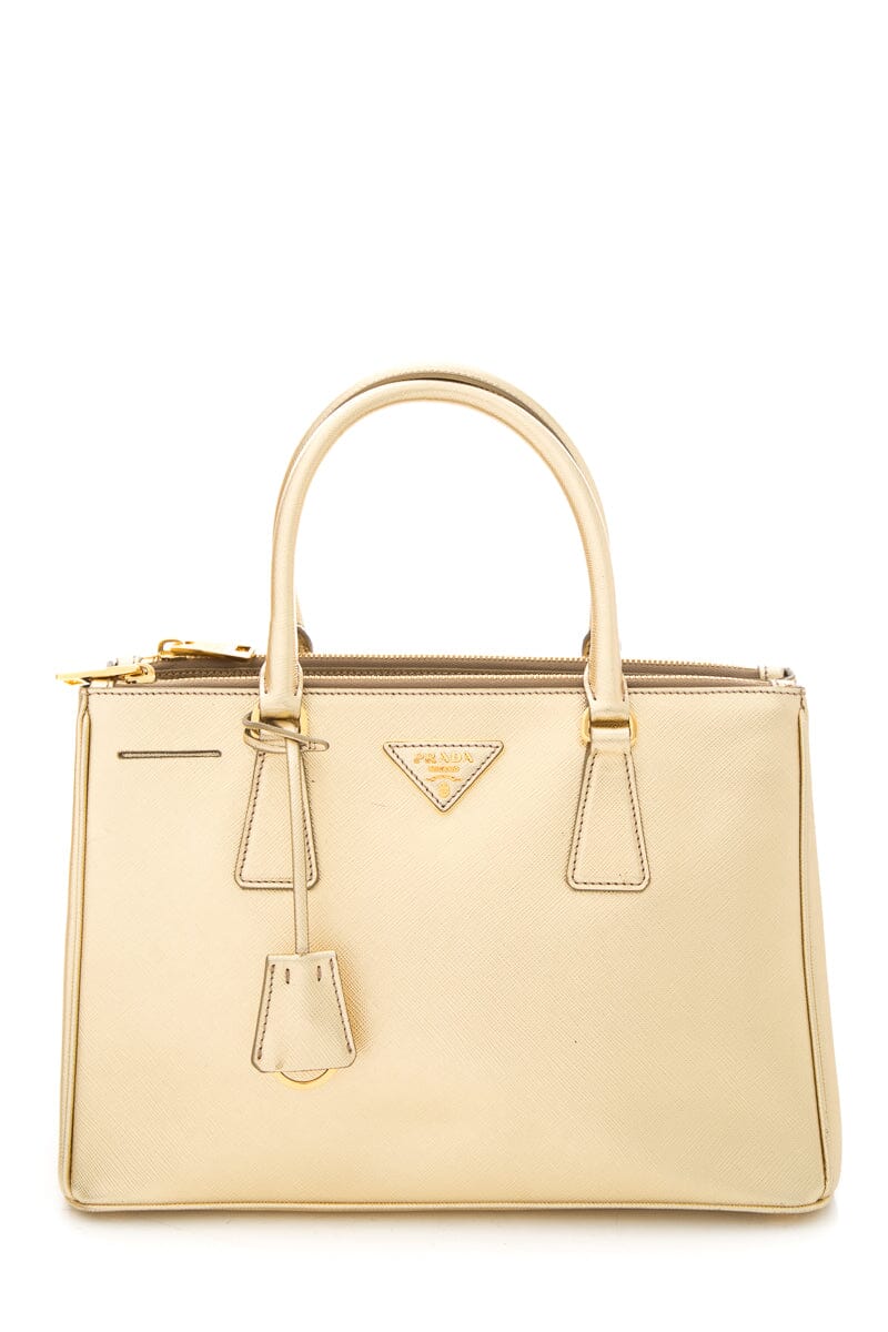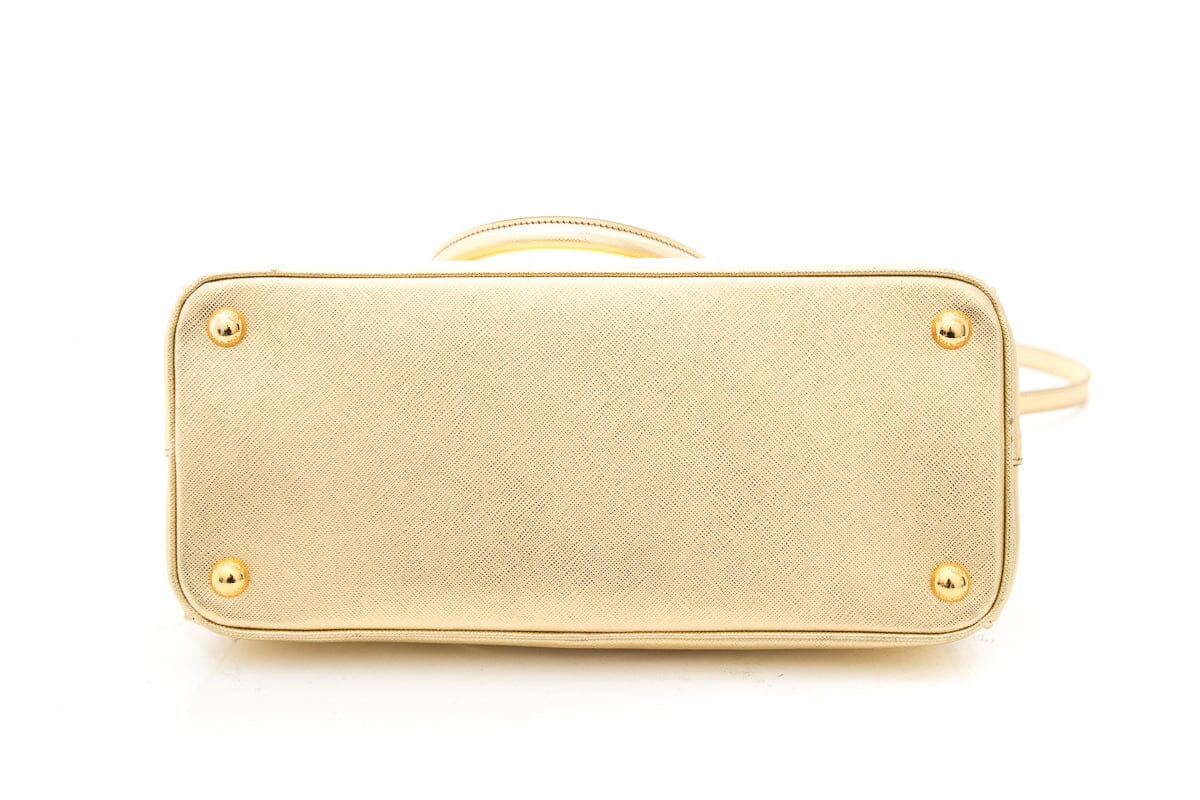 Prada Gold Metallic Saffiano Leather Double Zip Handbag. This item is in very good condition; some slight wear on leather.