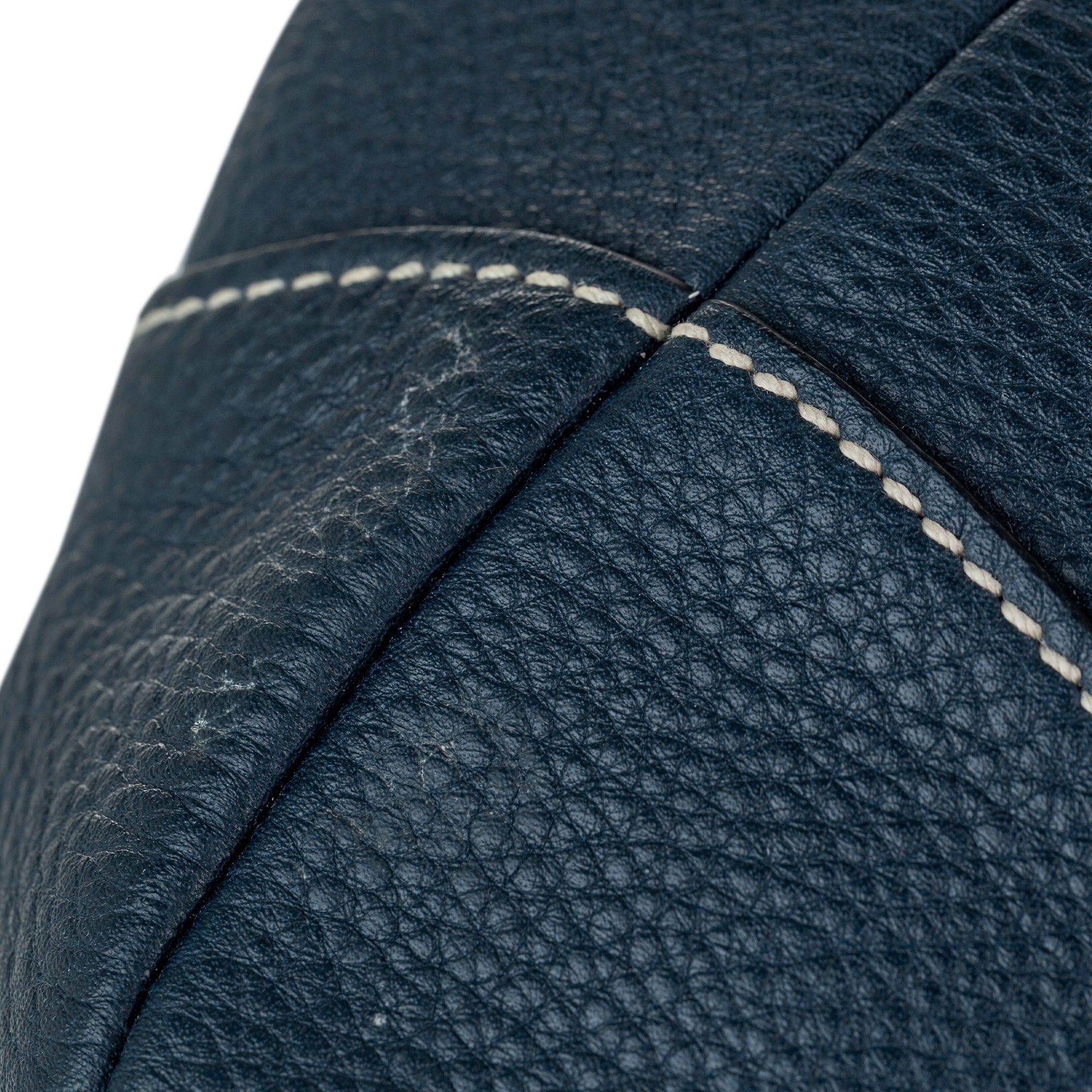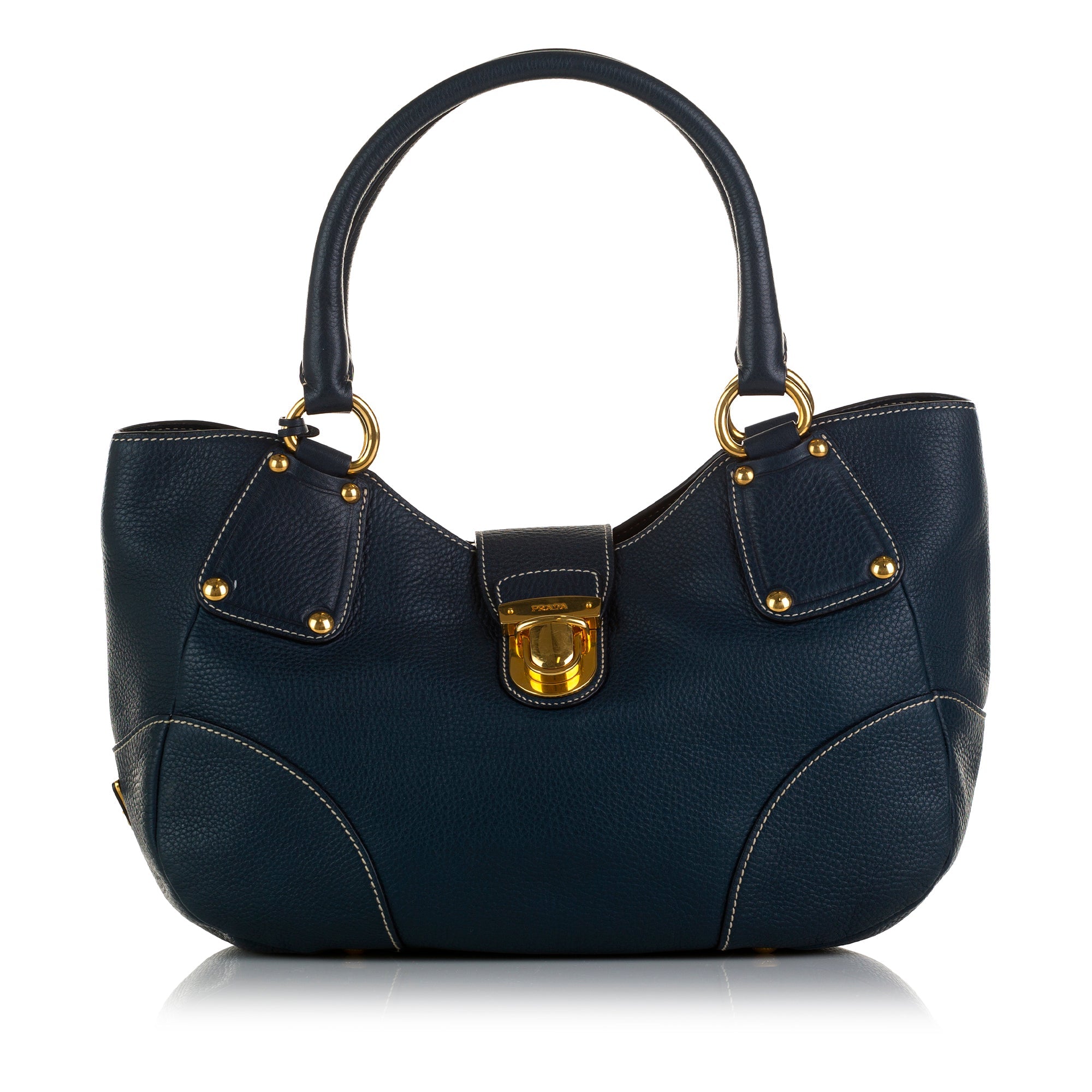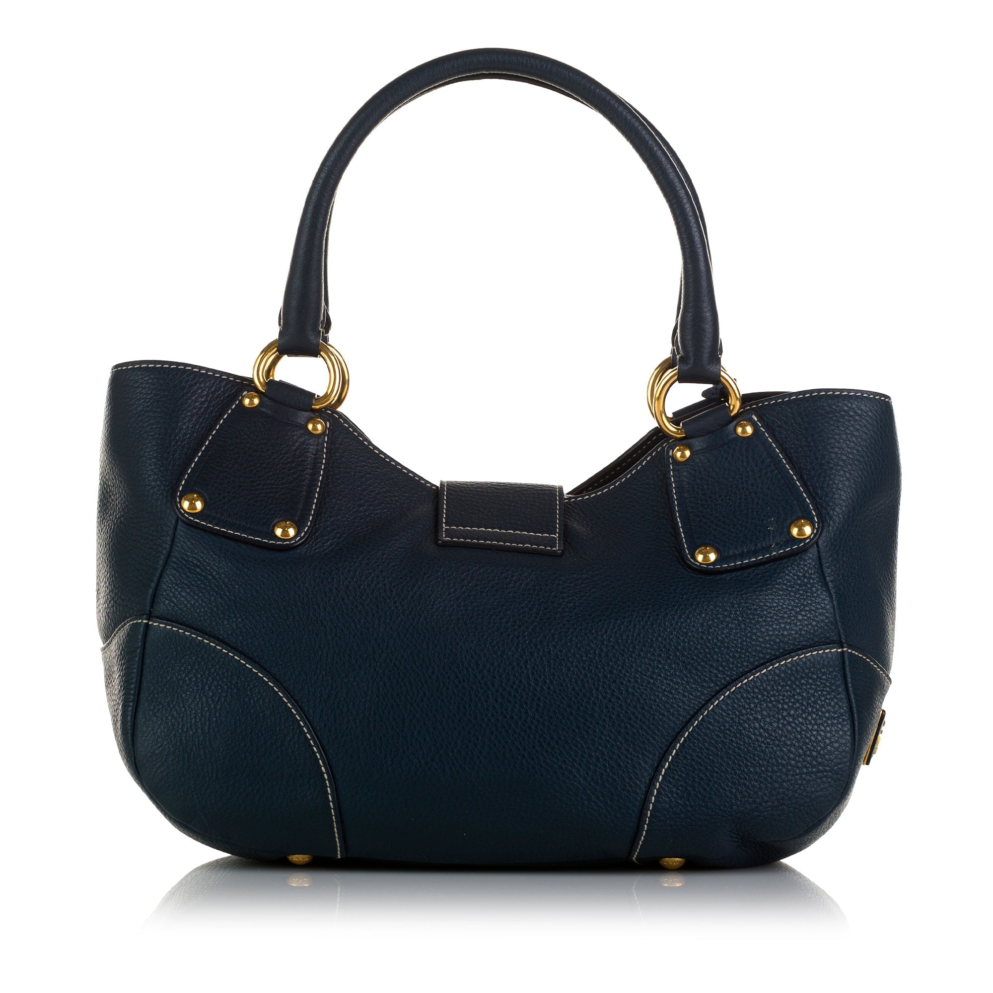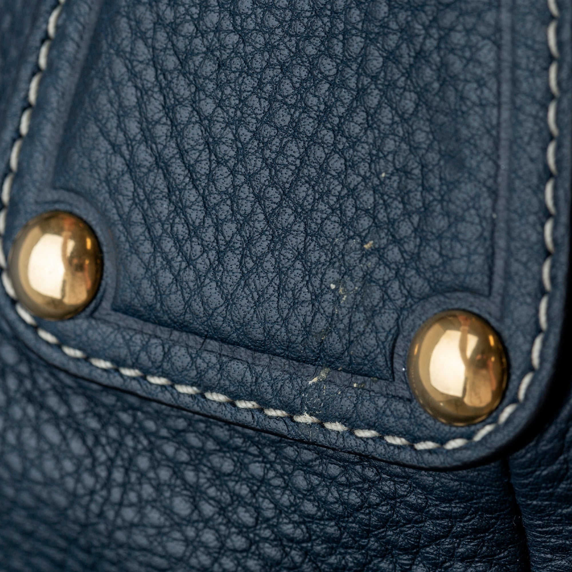 This was made from claw grained leather and features gold studs underneath, a strap with a gold slide closure over the top opening, rolled leather handles, and zippered and slip pockets inside. The Bag is best worn in the arm or hand.