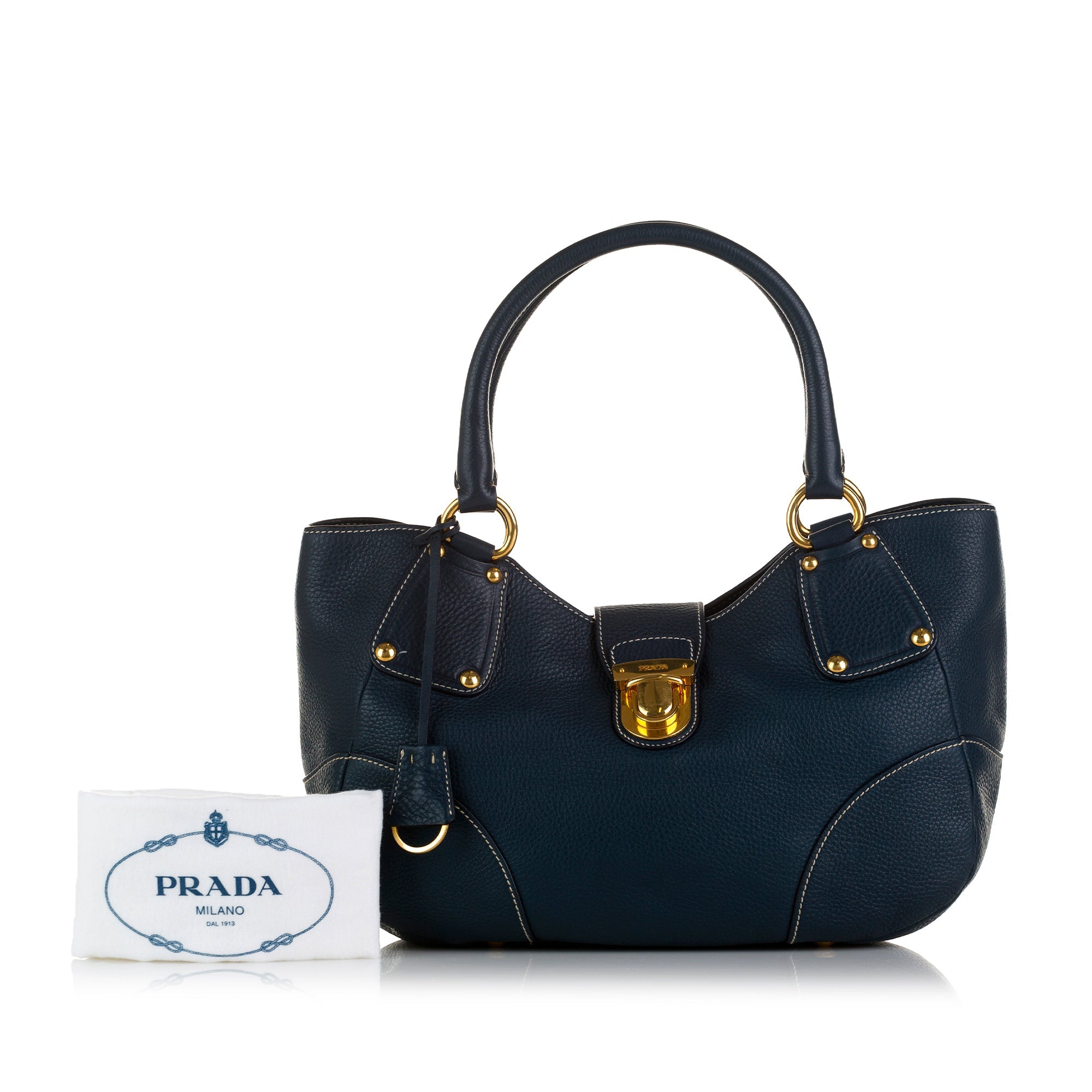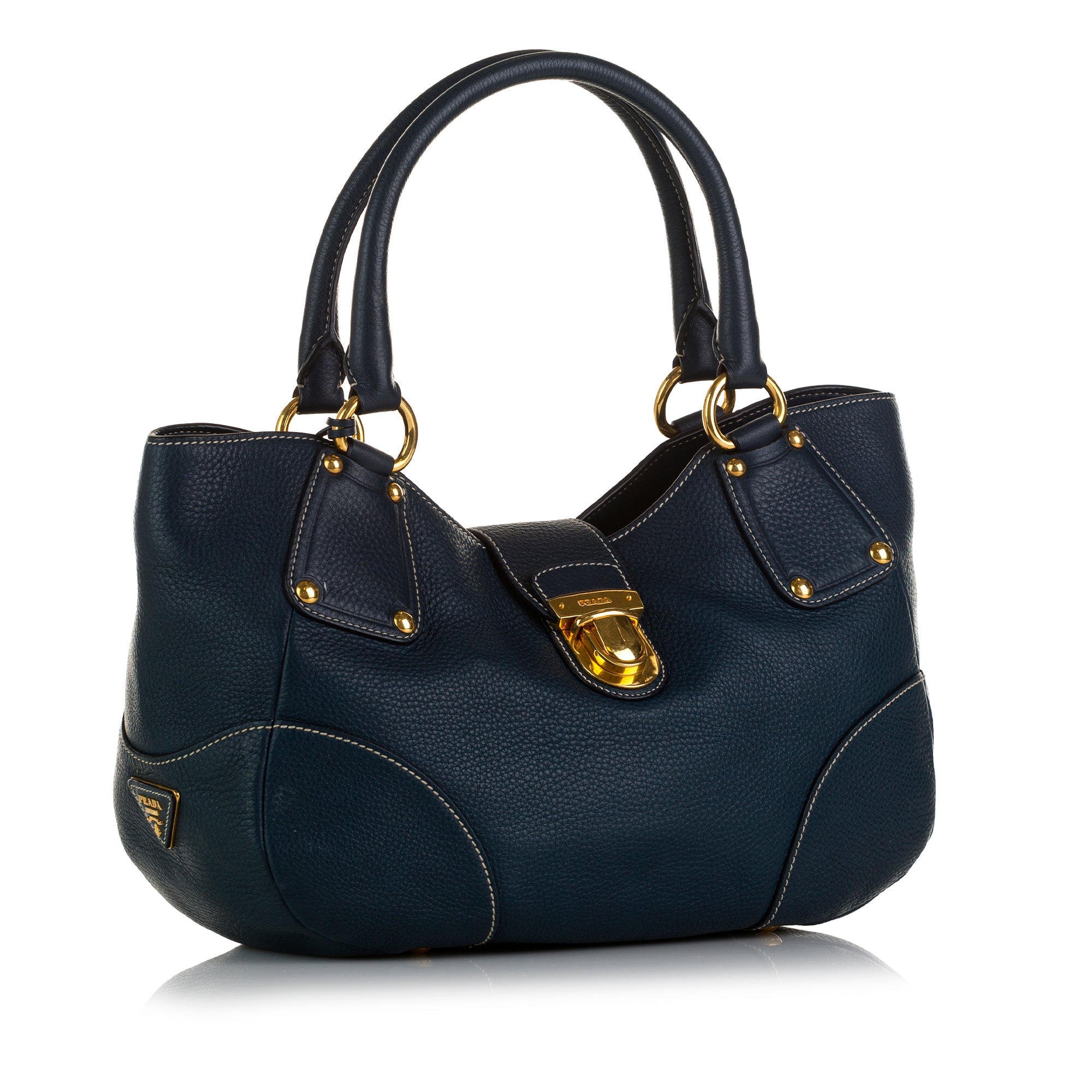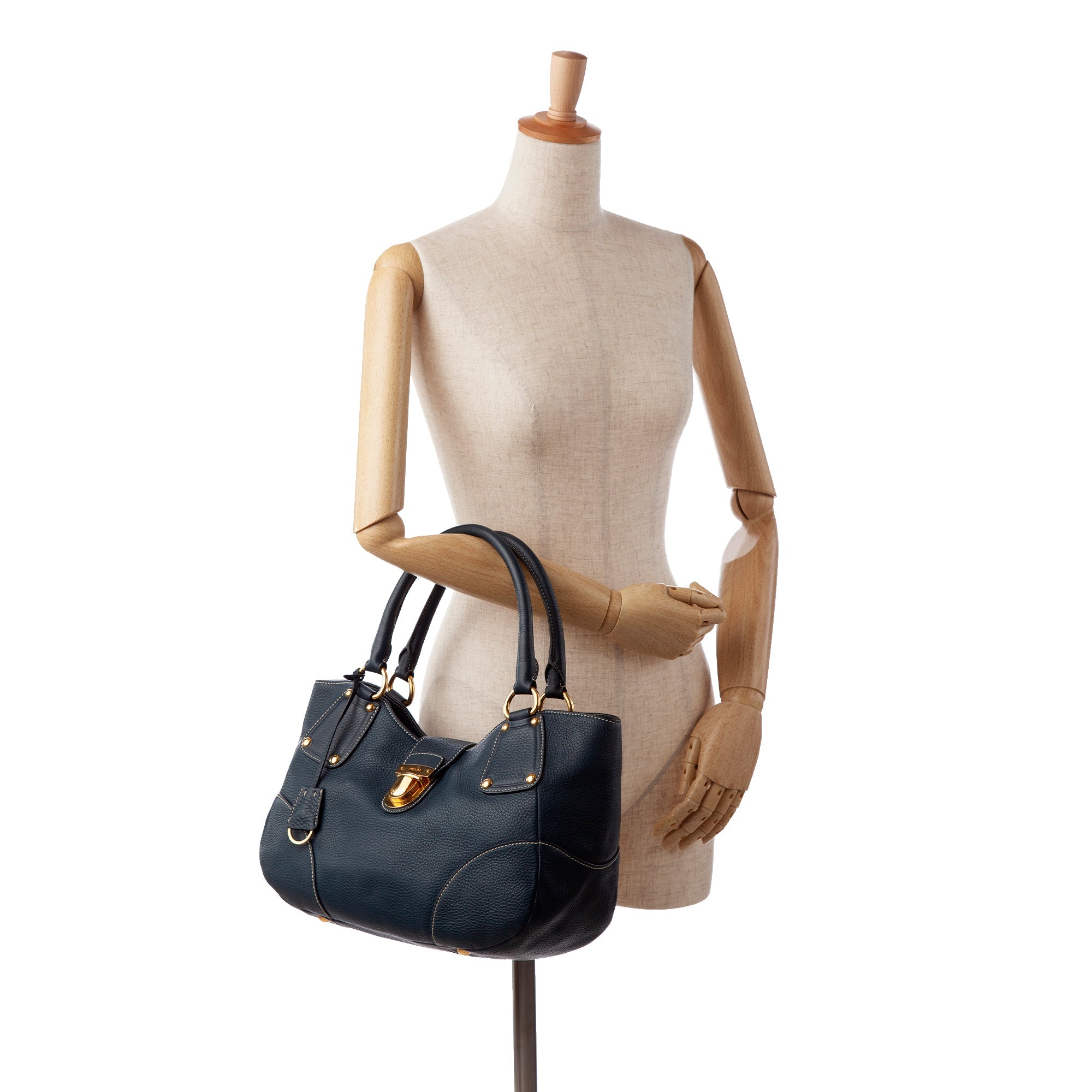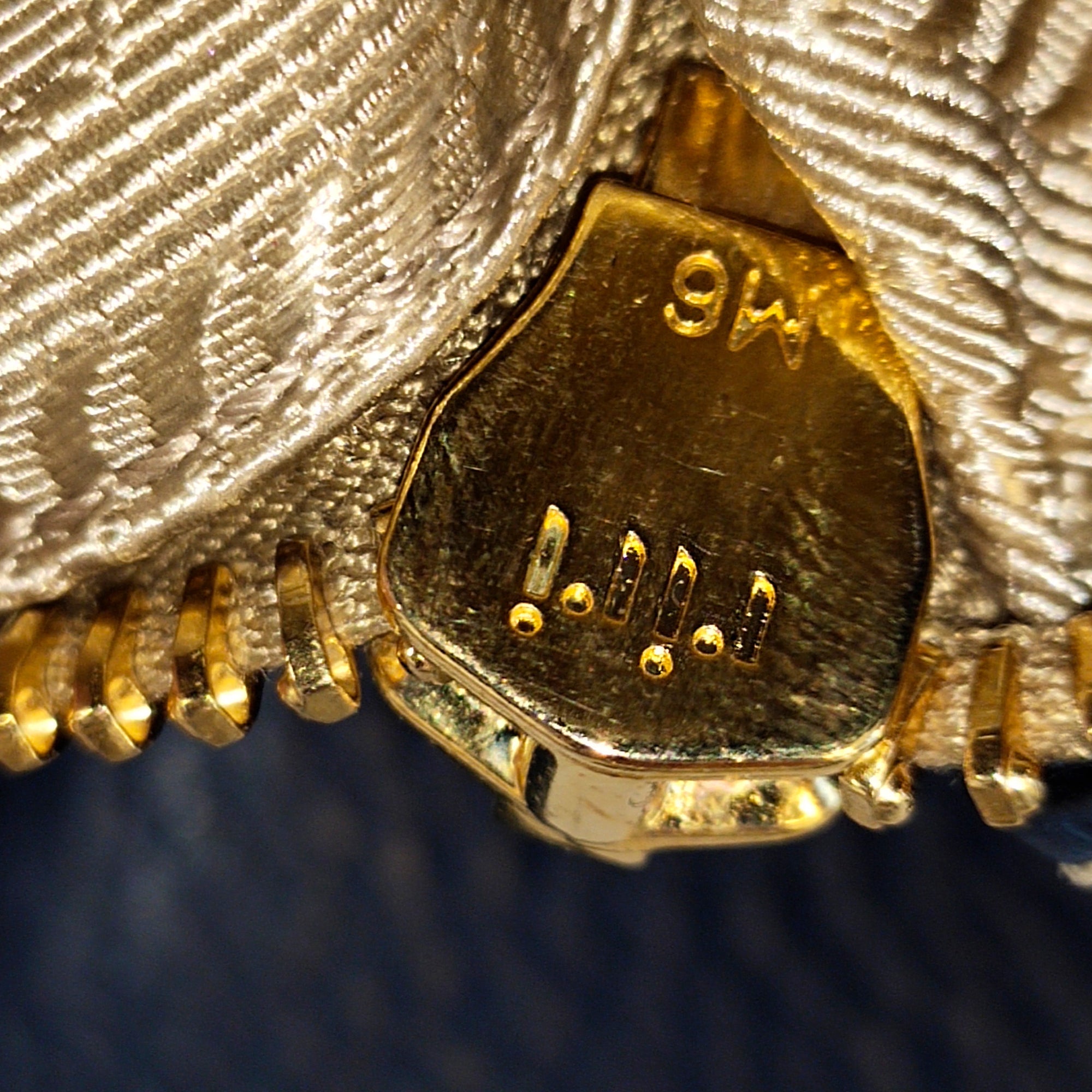 This was made from claw grained leather and features gold studs underneath, a strap with a gold slide closure over the top opening, rolled leather handles, and zippered and slip pockets inside. The Bag is best worn in the arm or hand.