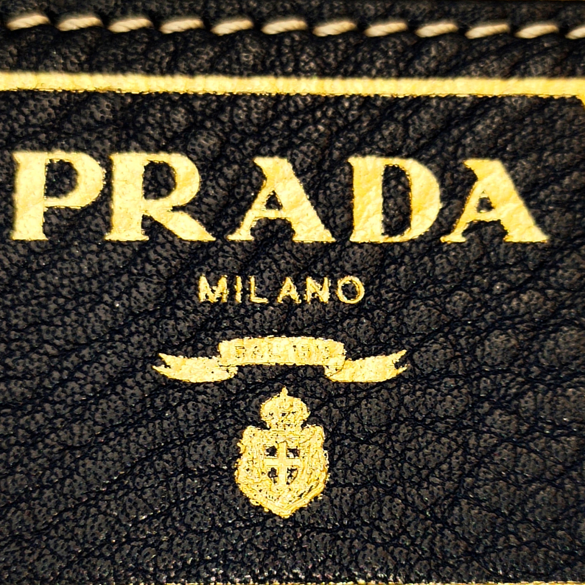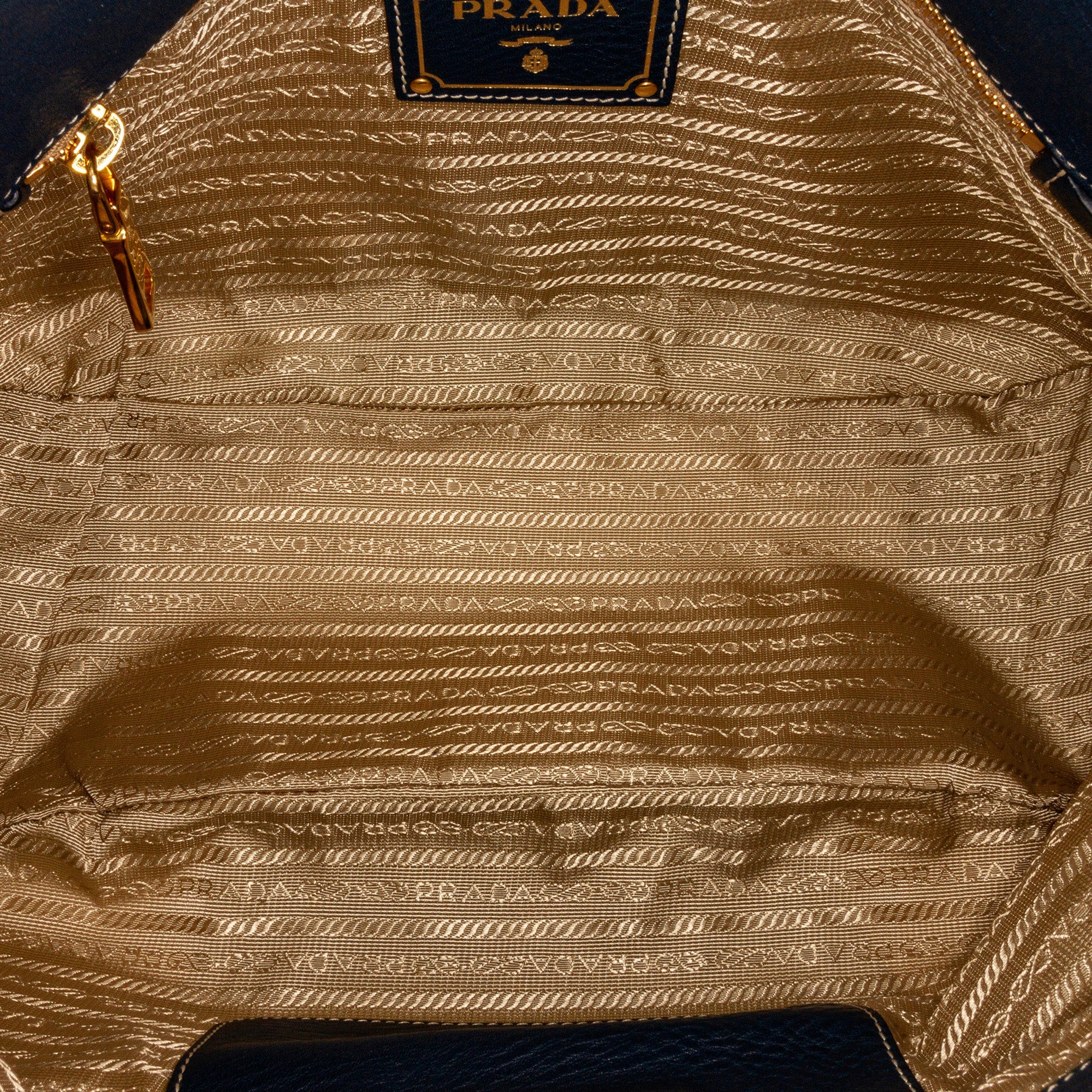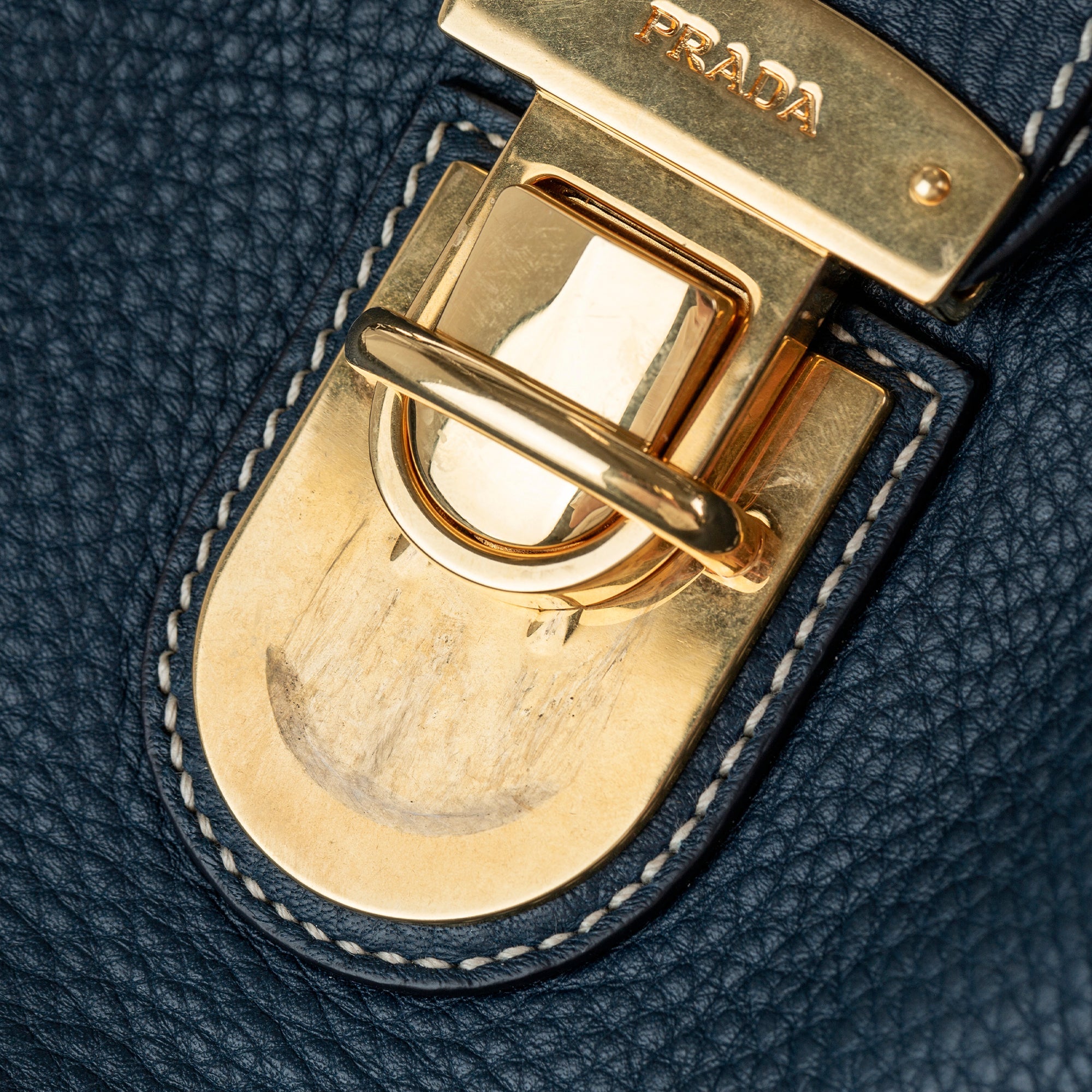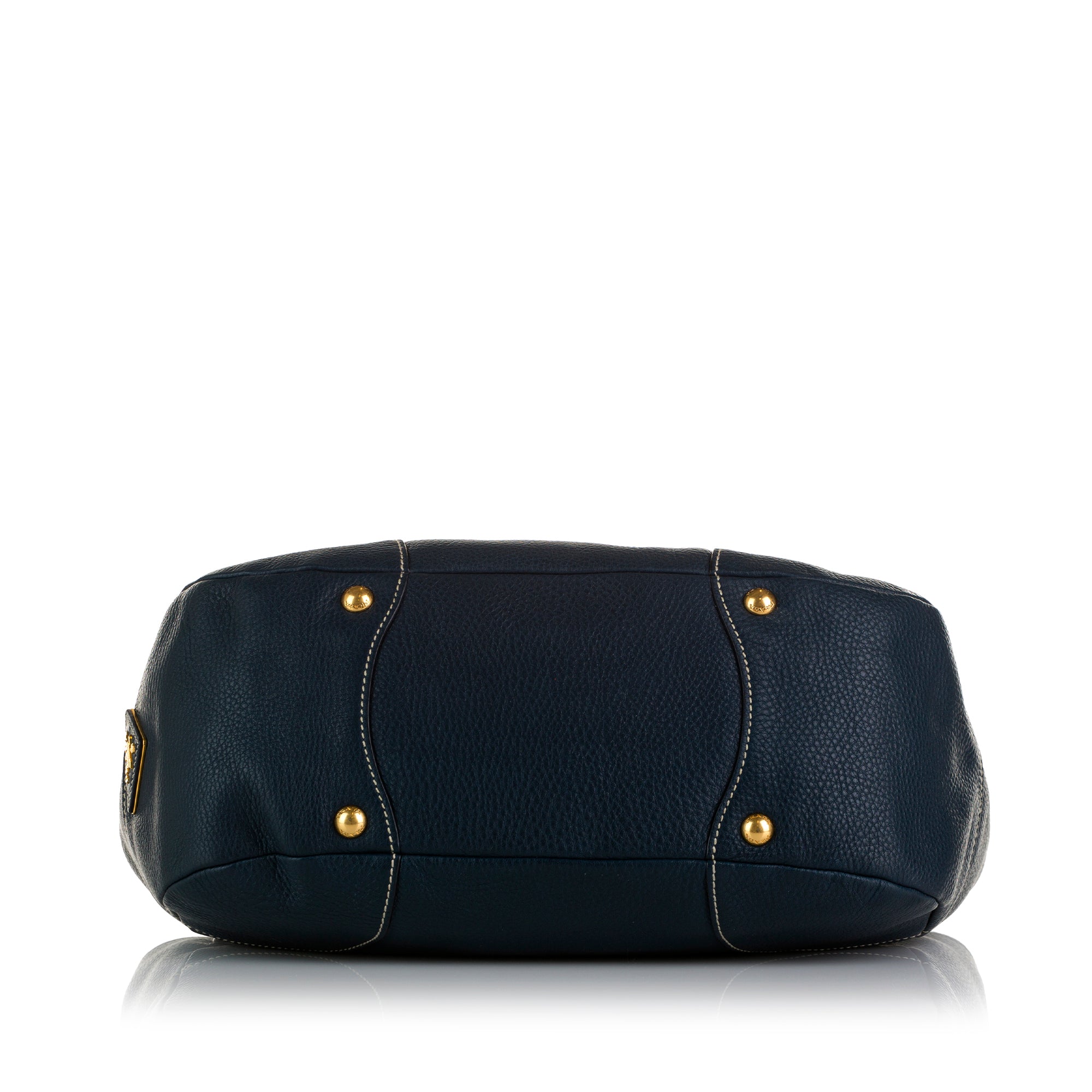 This was made from claw grained leather and features gold studs underneath, a strap with a gold slide closure over the top opening, rolled leather handles, and zippered and slip pockets inside. The Bag is best worn in the arm or hand.