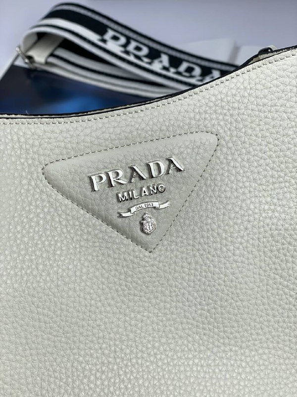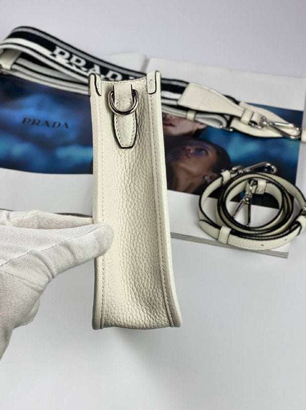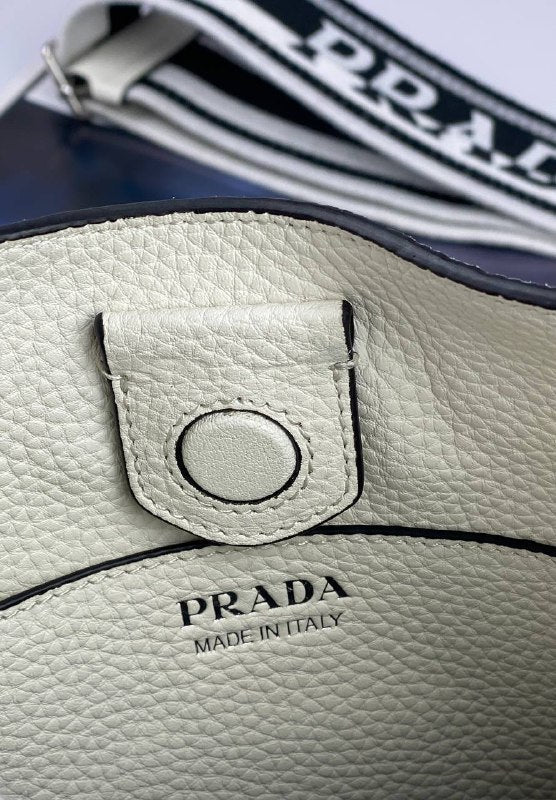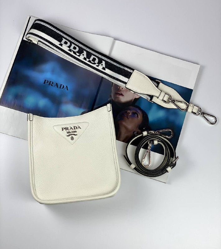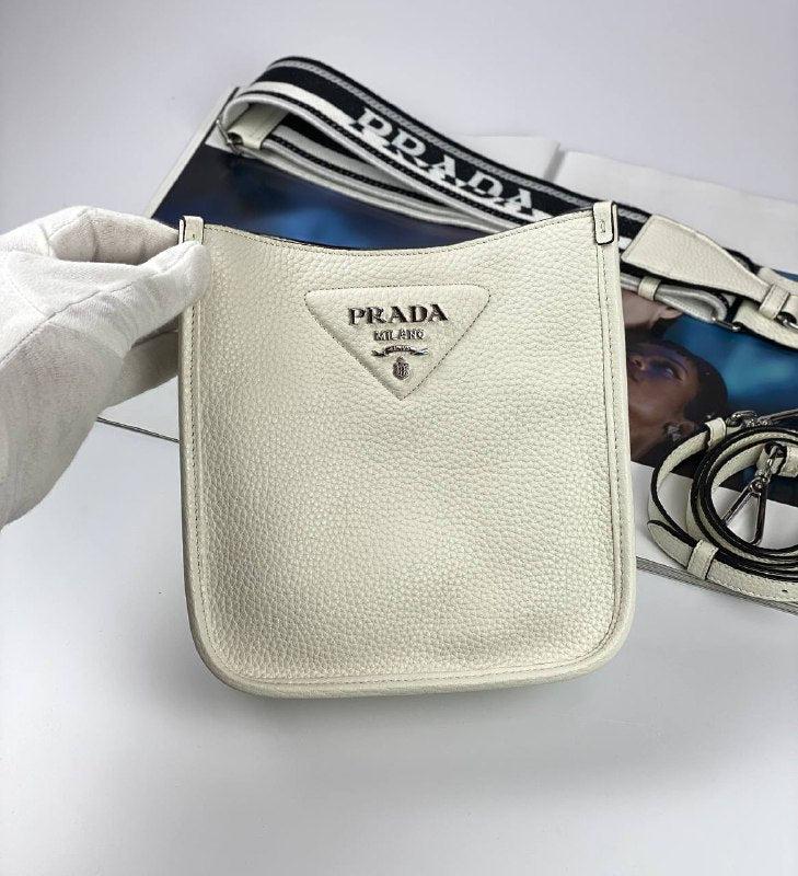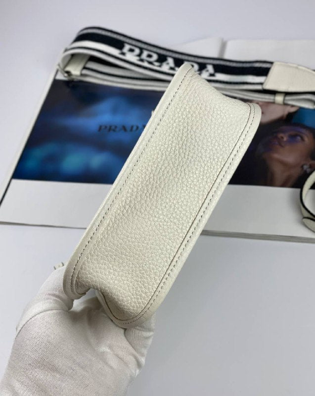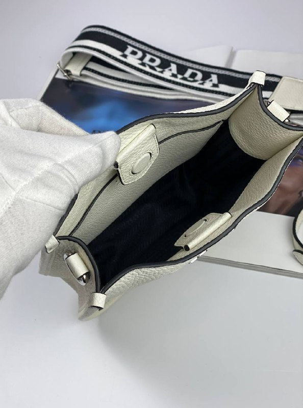 The sleek design of this leather mini shoulder bag is emphasized on the front by the metal triangle logo that adds an iconic note. The detachable logo-print woven tape shoulder strap emphasizes the contemporary character of the accessory.