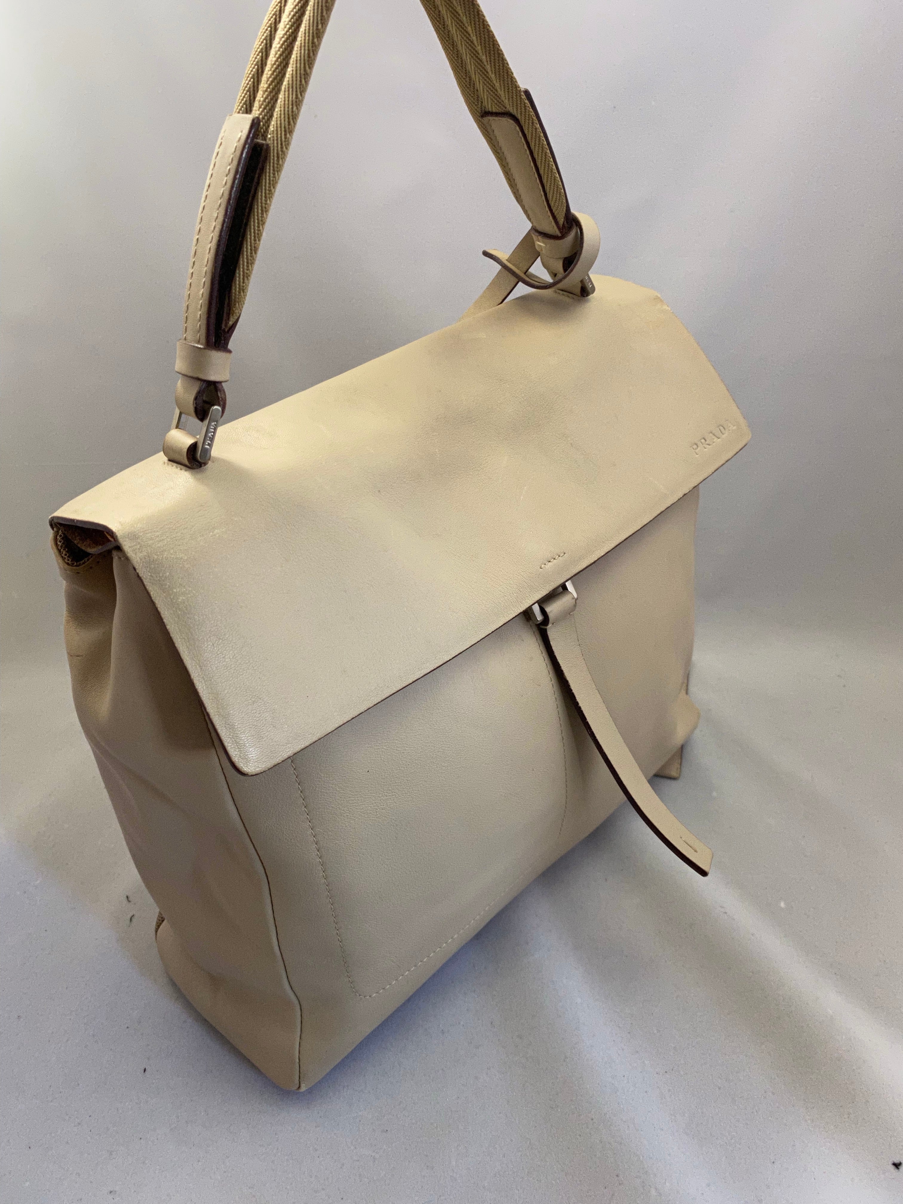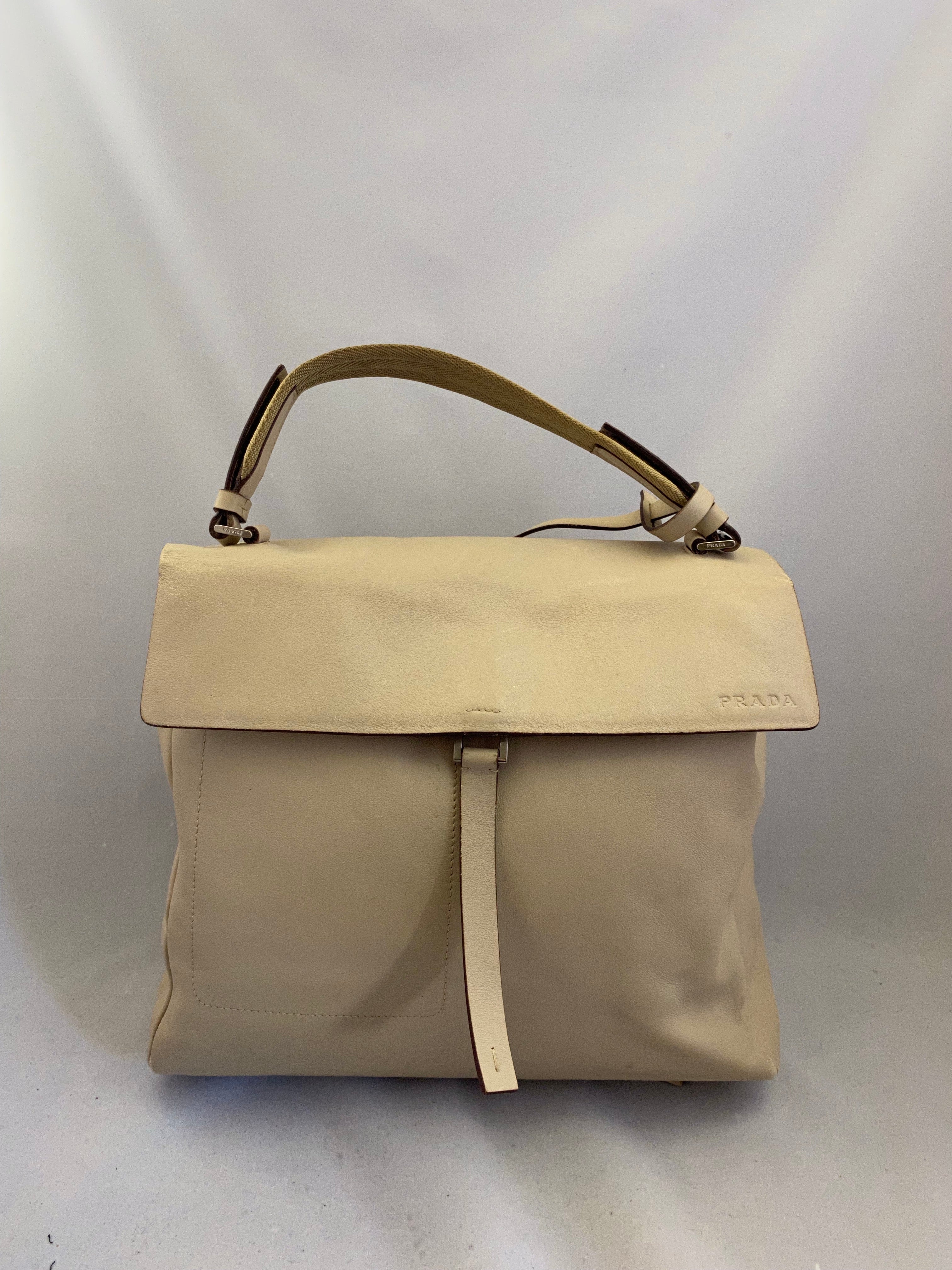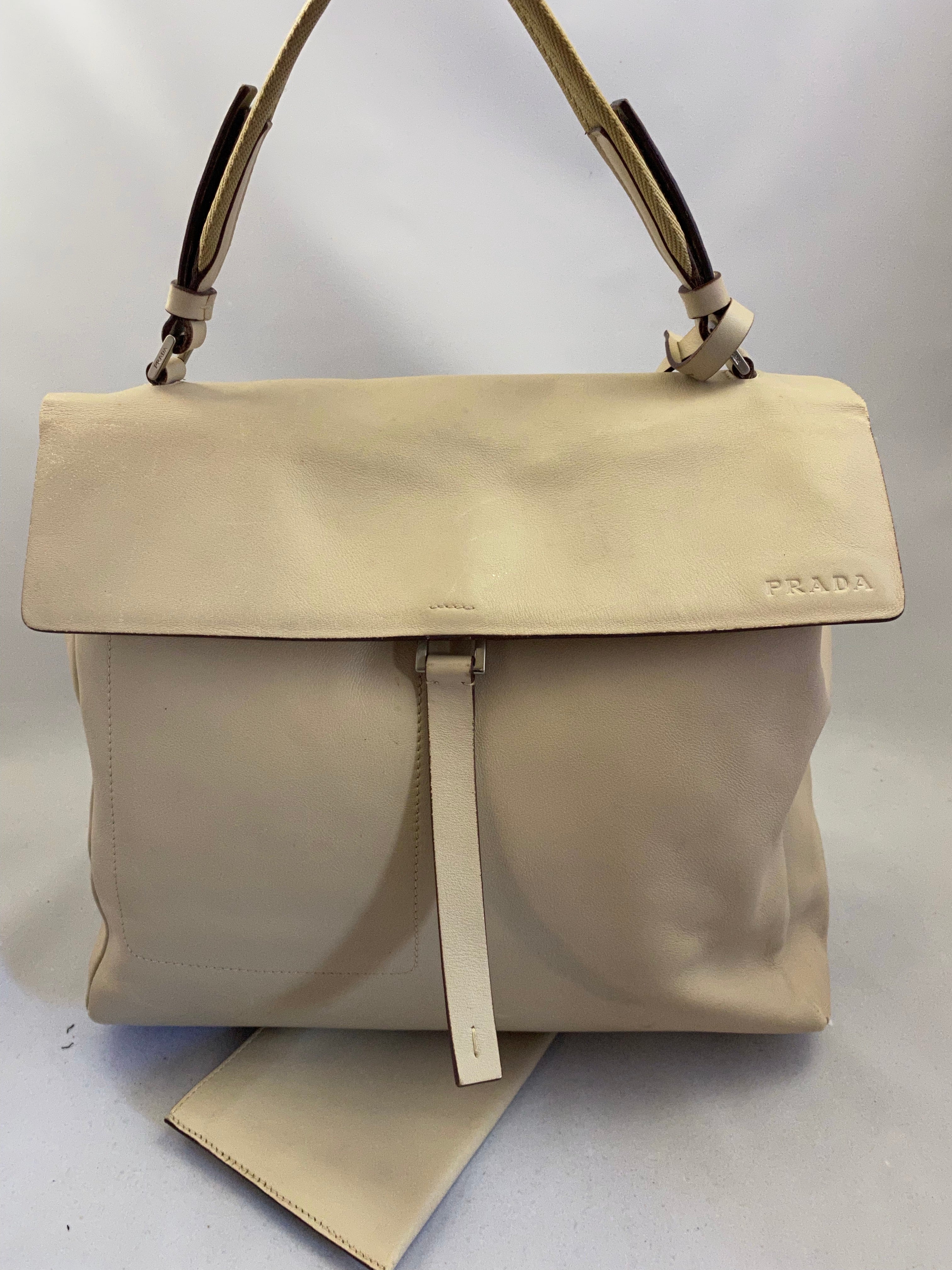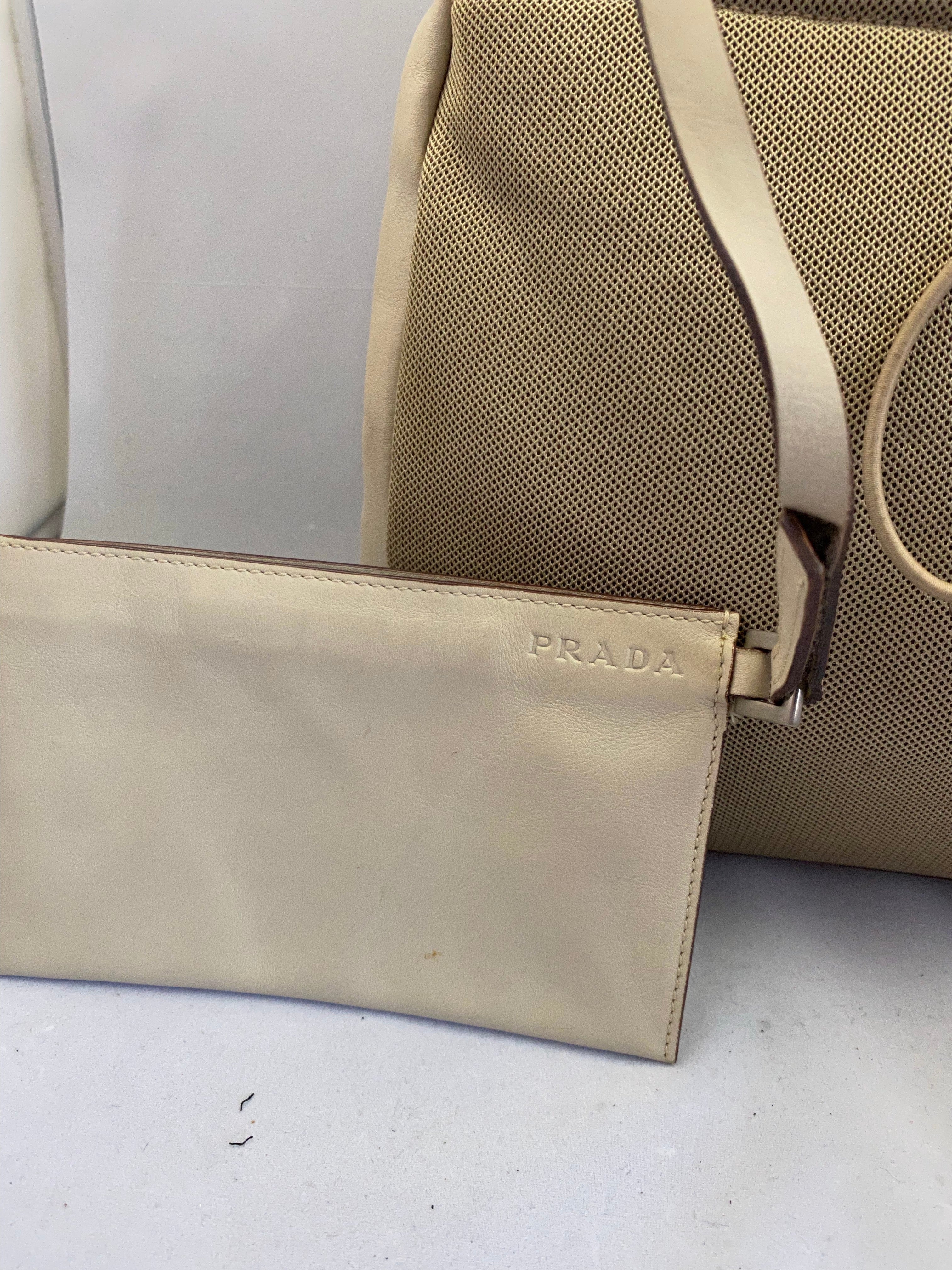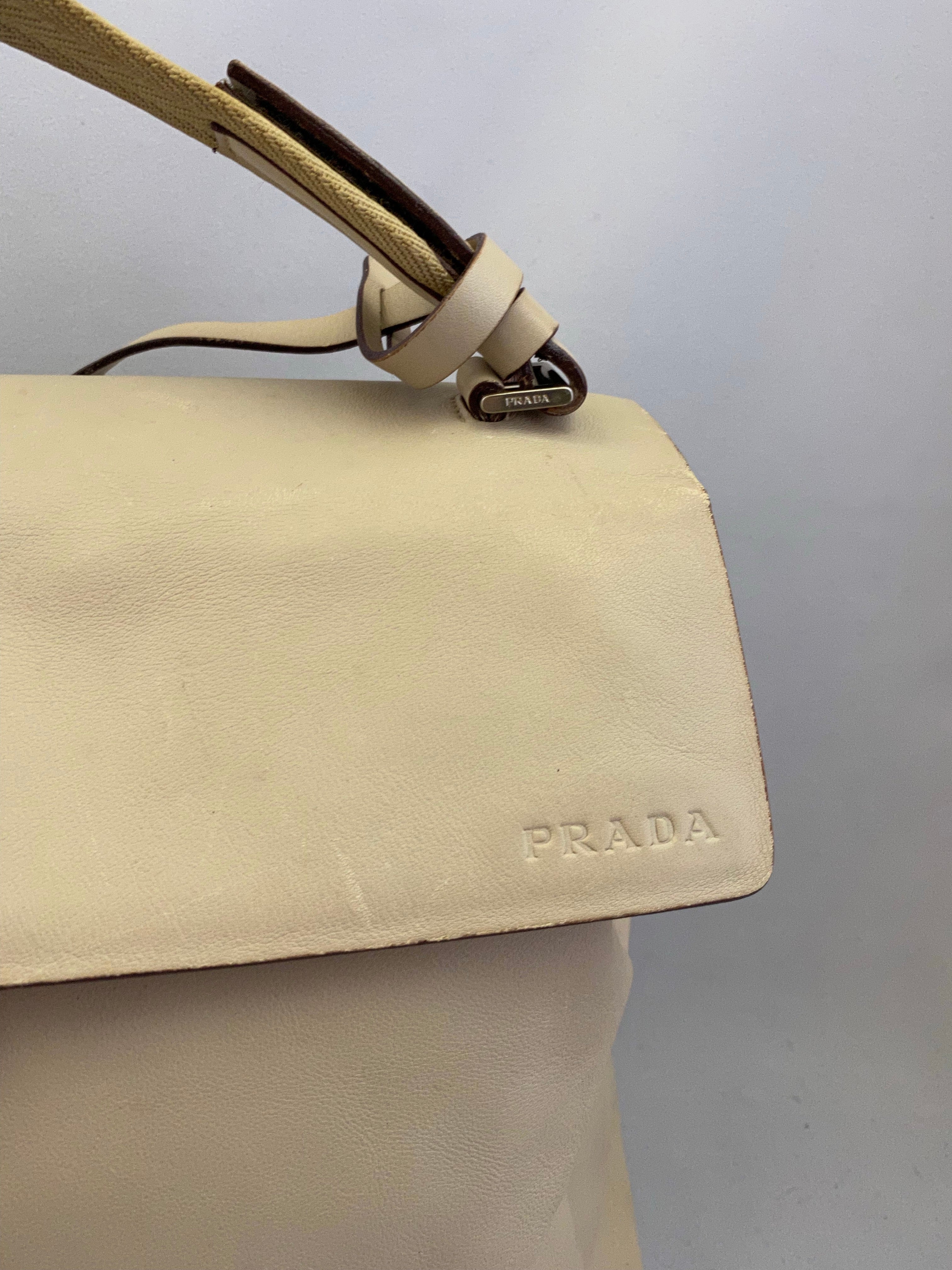 Prada skuldertaske i cremefarvet kalveskind og indbygget Prada clutch lomme. Tasken har nogle få brugsspor og har mindre plet på bagsiden. Derudover er tasken i super flot stand med begrænsede brugsspor.