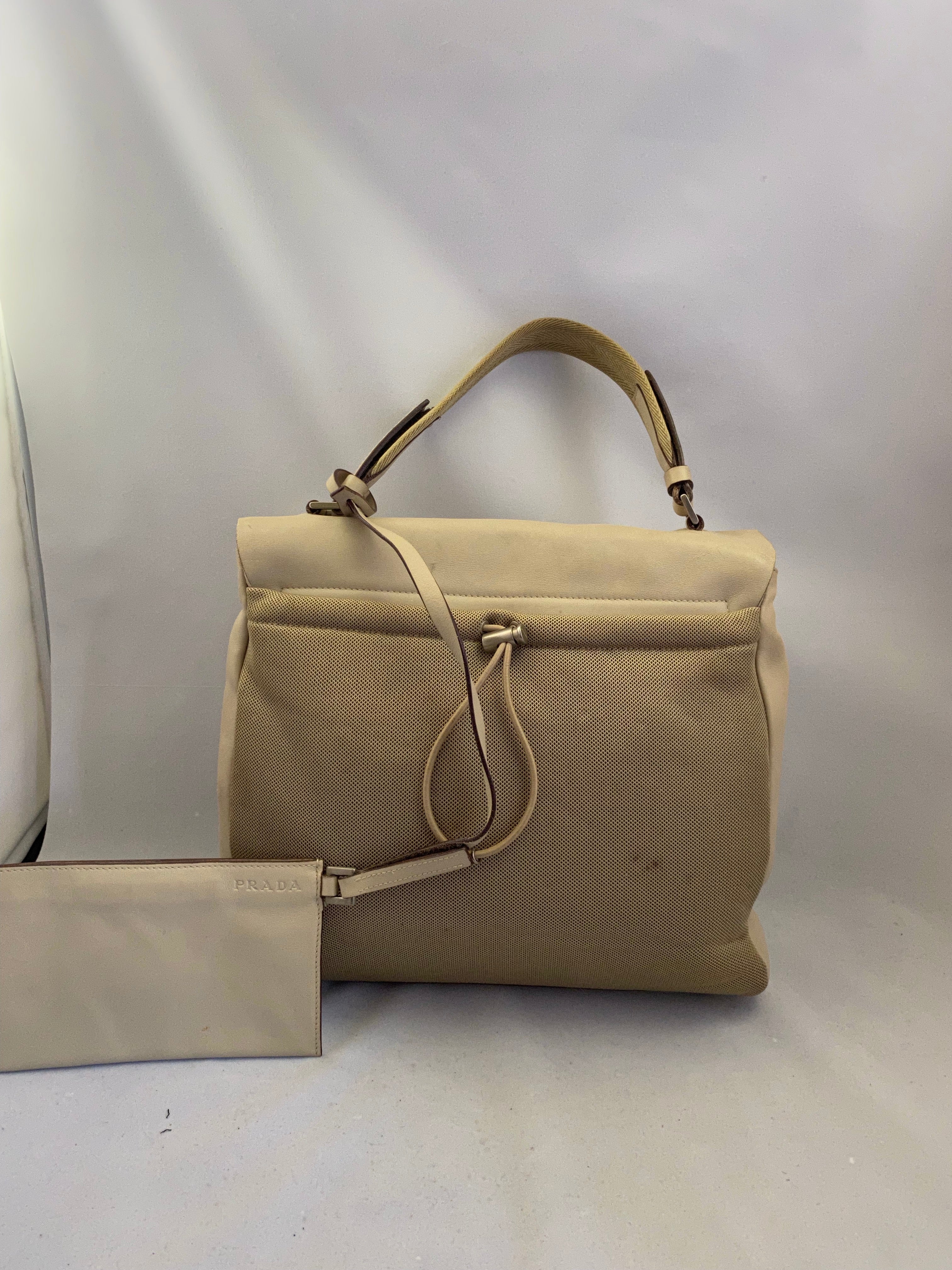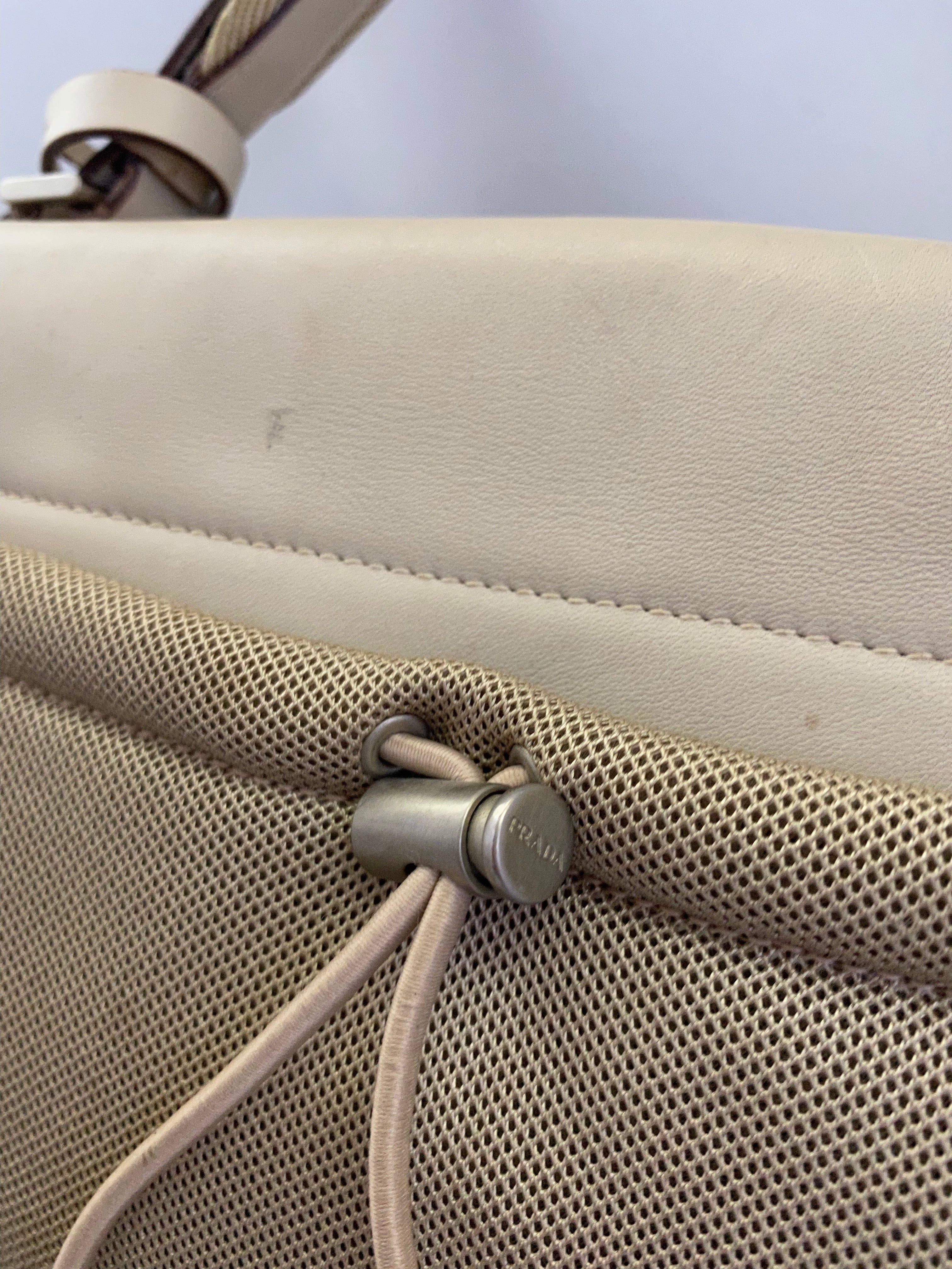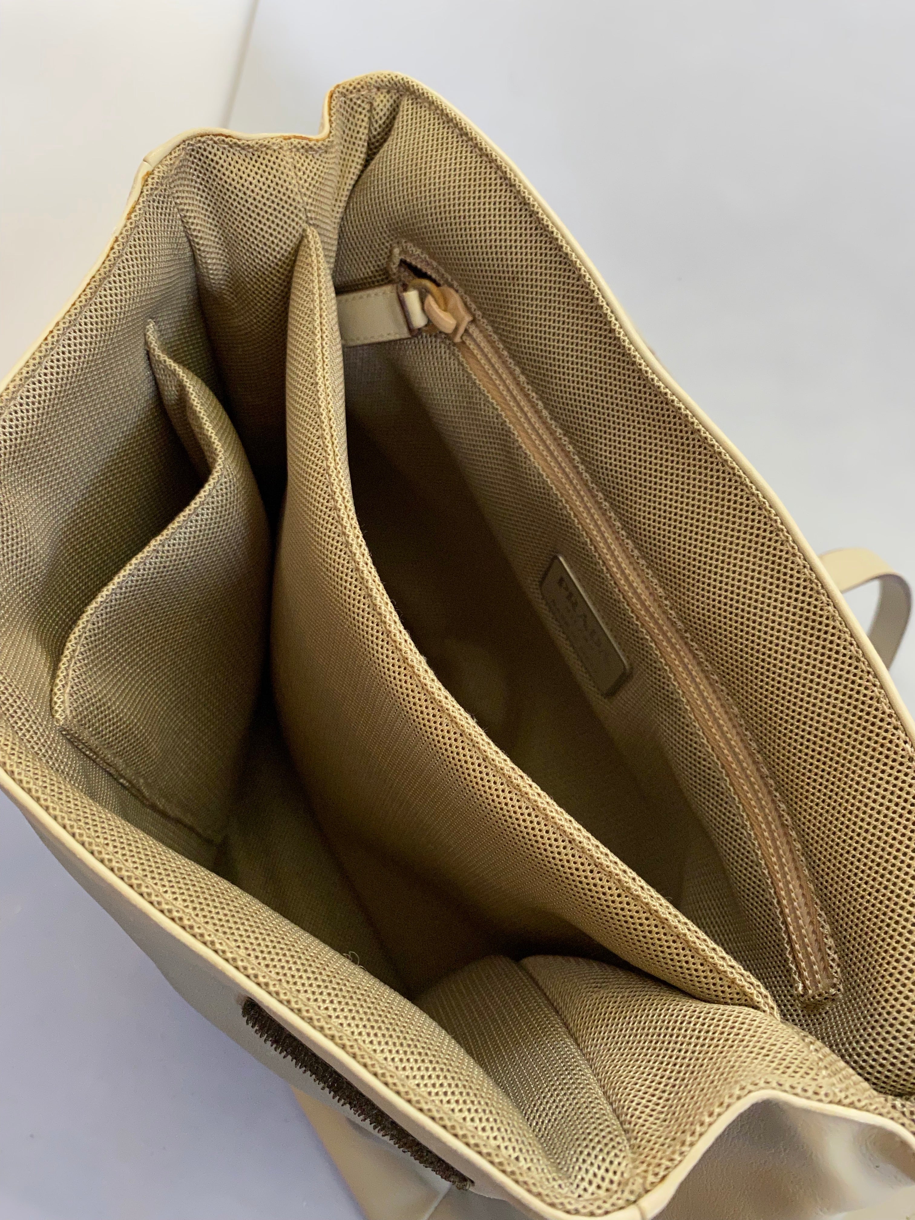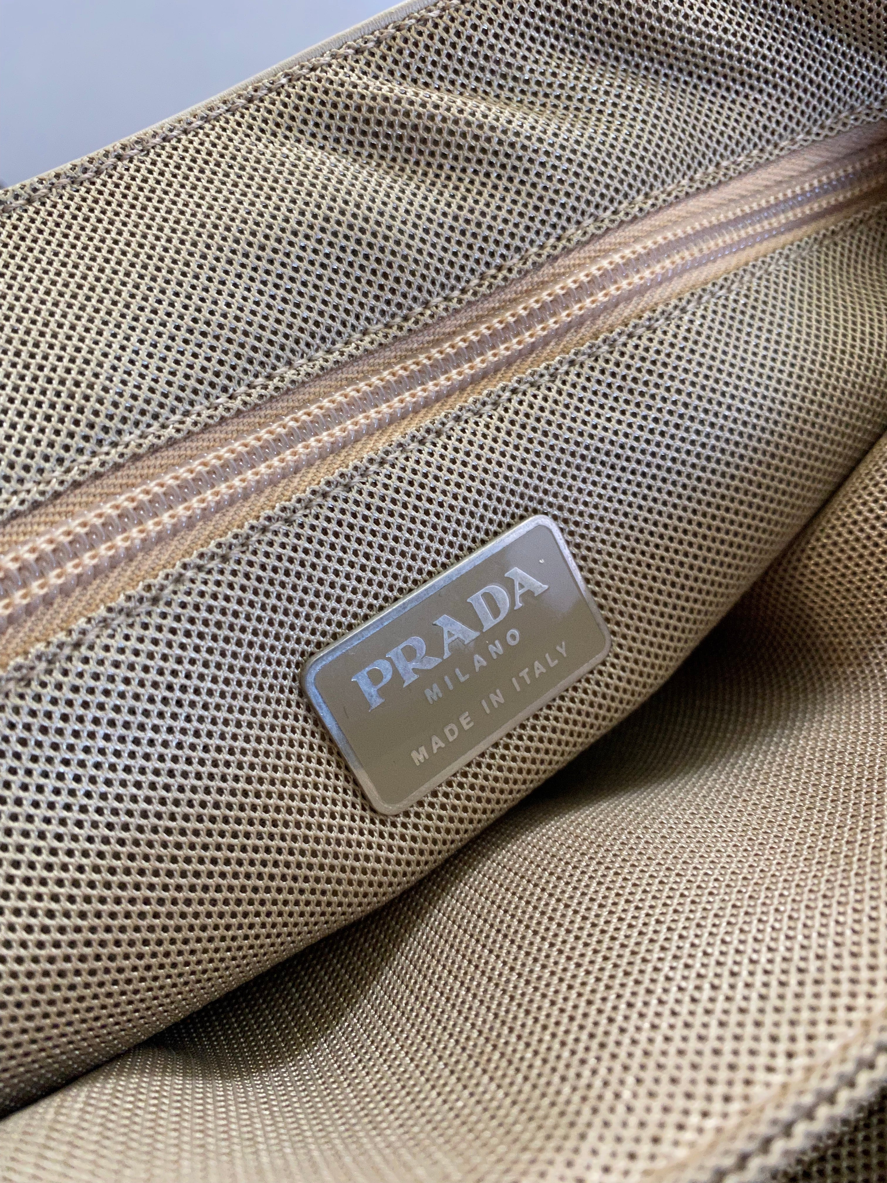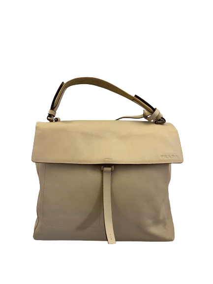 Prada skuldertaske i cremefarvet kalveskind og indbygget Prada clutch lomme. Tasken har nogle få brugsspor og har mindre plet på bagsiden. Derudover er tasken i super flot stand med begrænsede brugsspor.