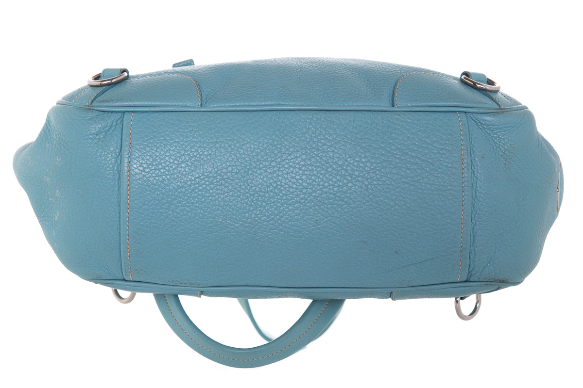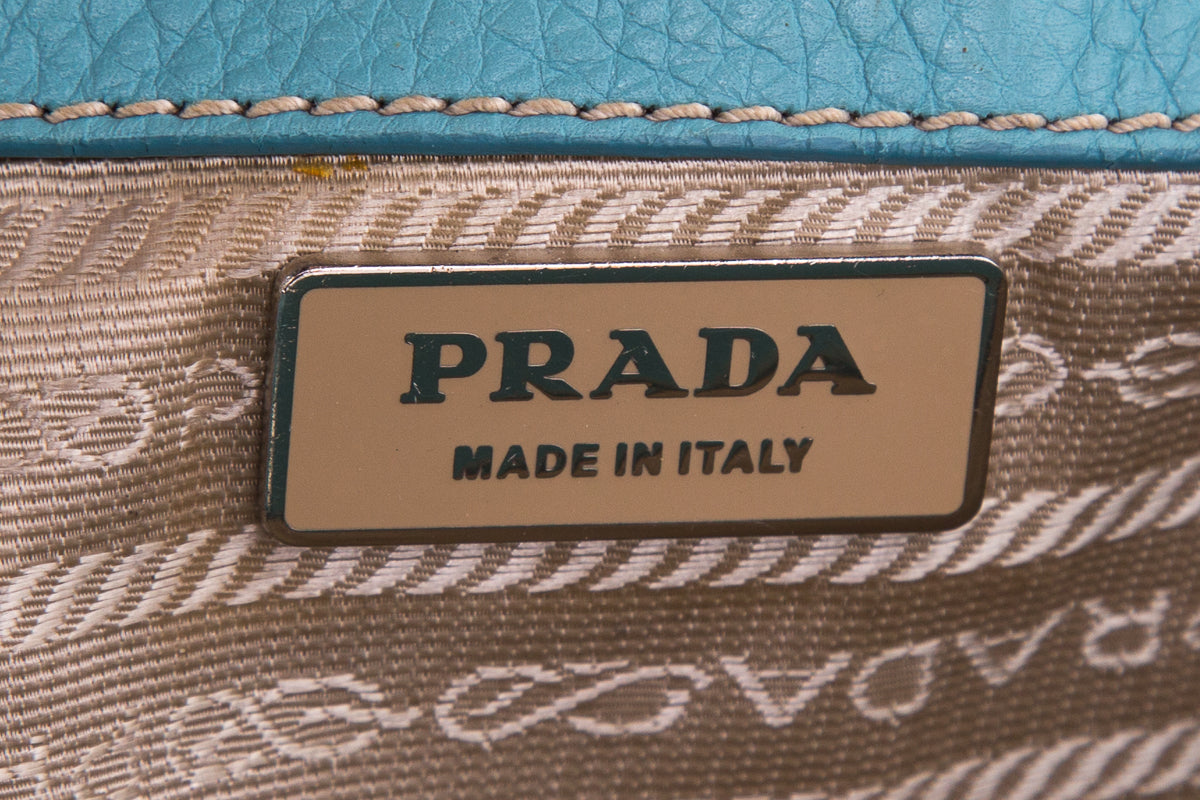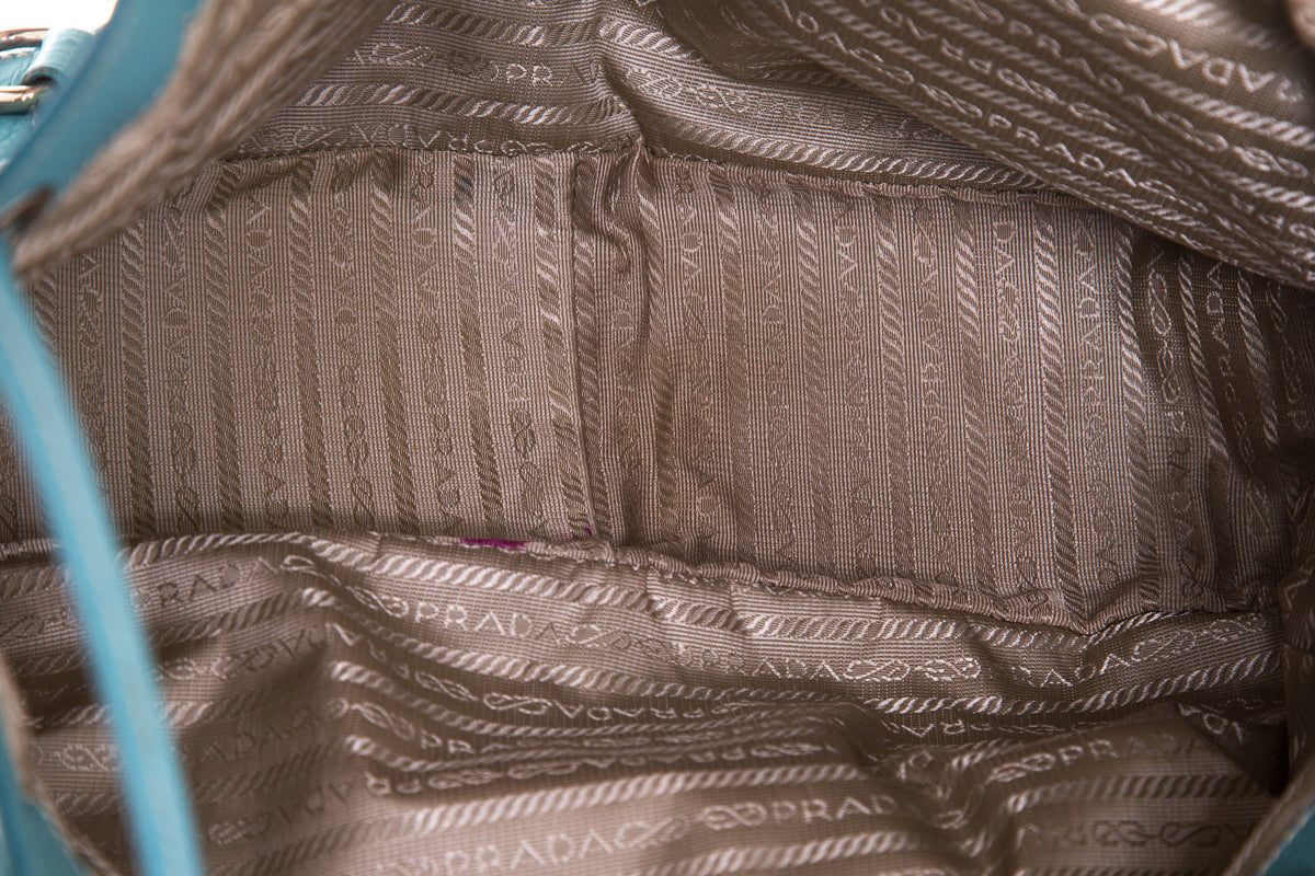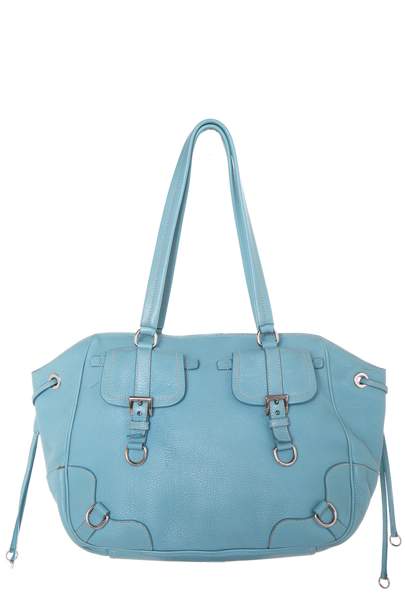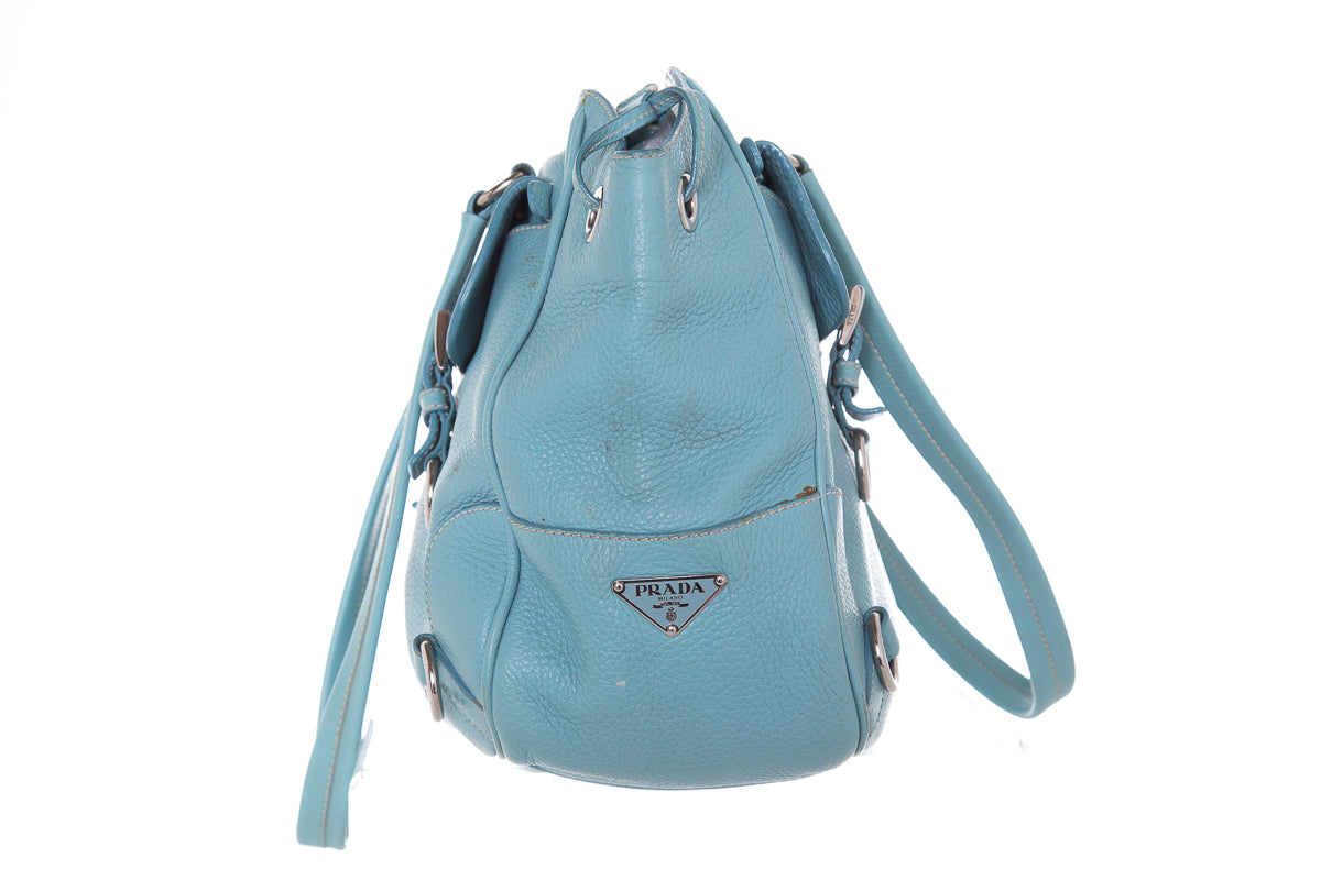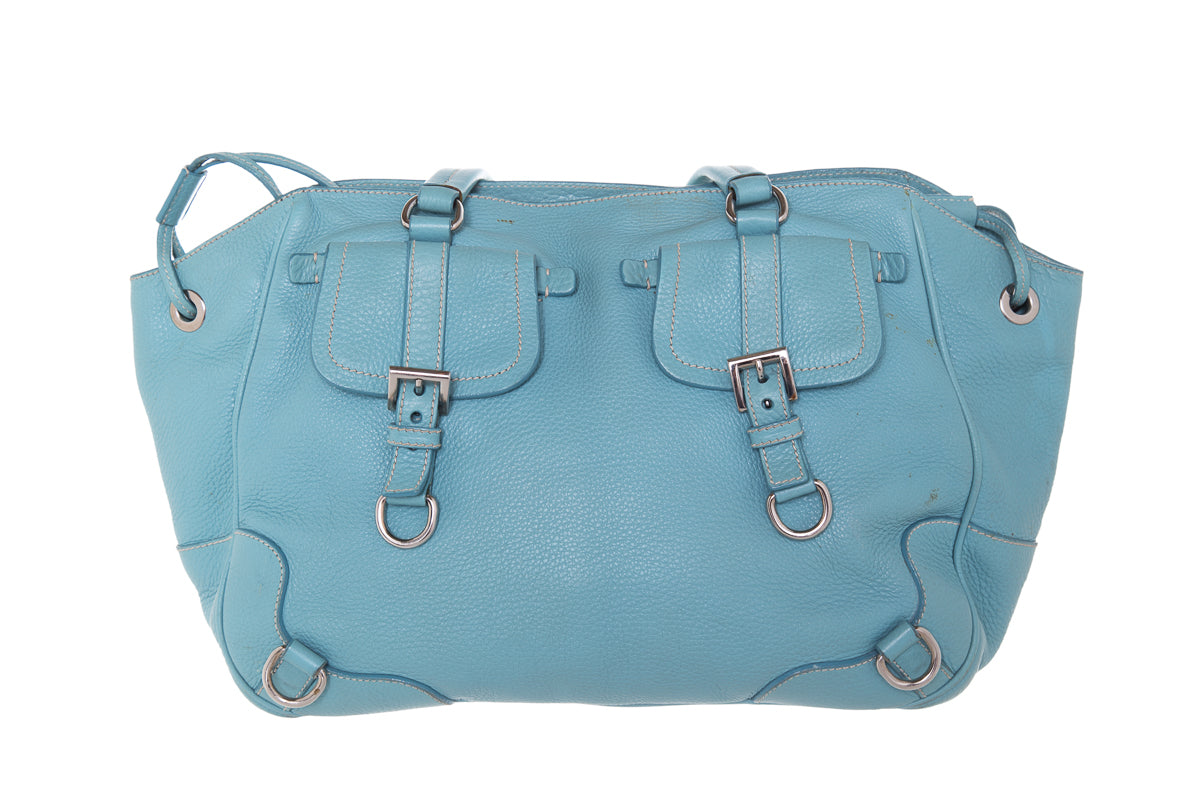 Prada Light Blue Shoulder Bag with dual front pockets on both side, dual shoulder straps and silver hardware. This item is in good condition; some wear/discoloring to exterior and interior.
