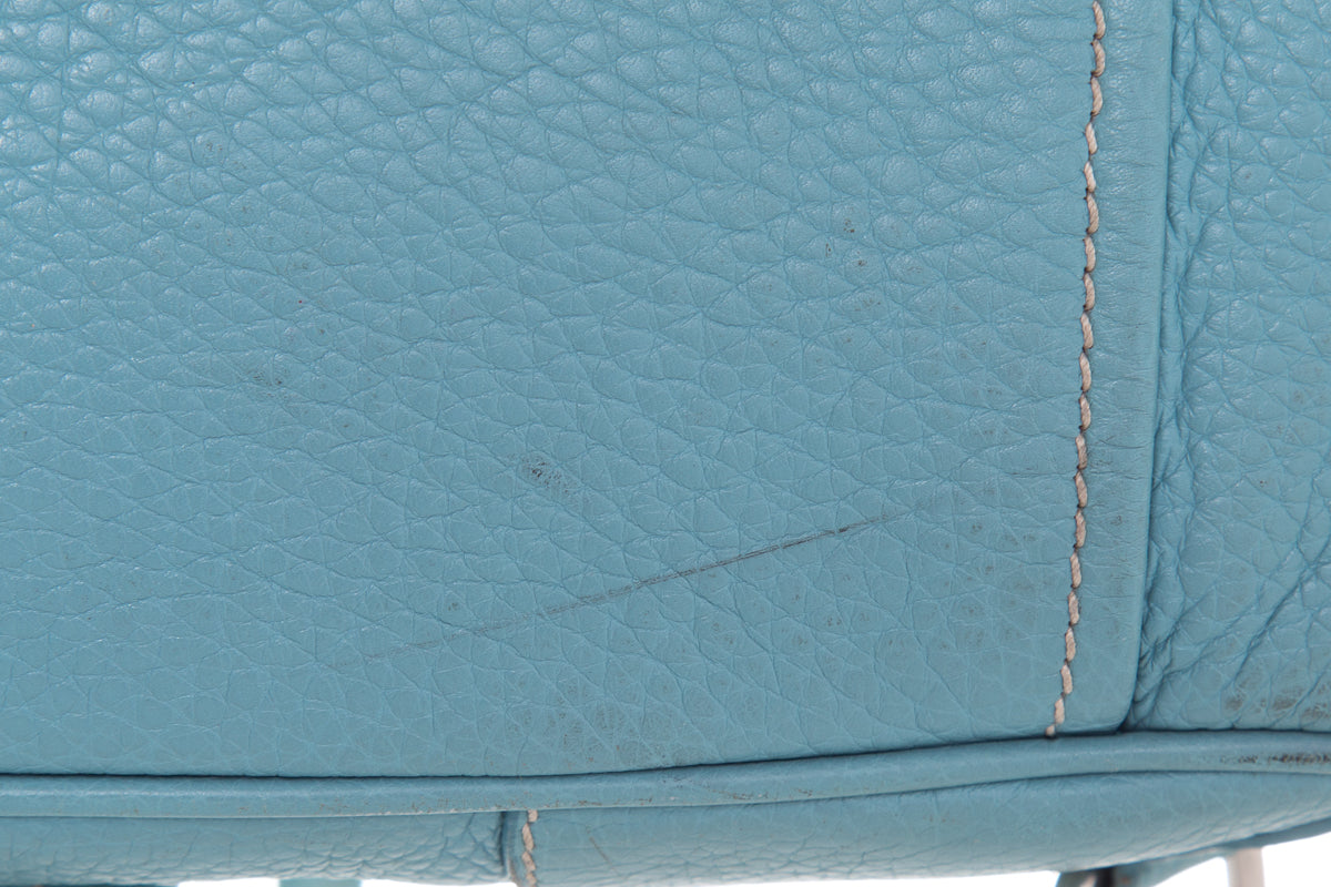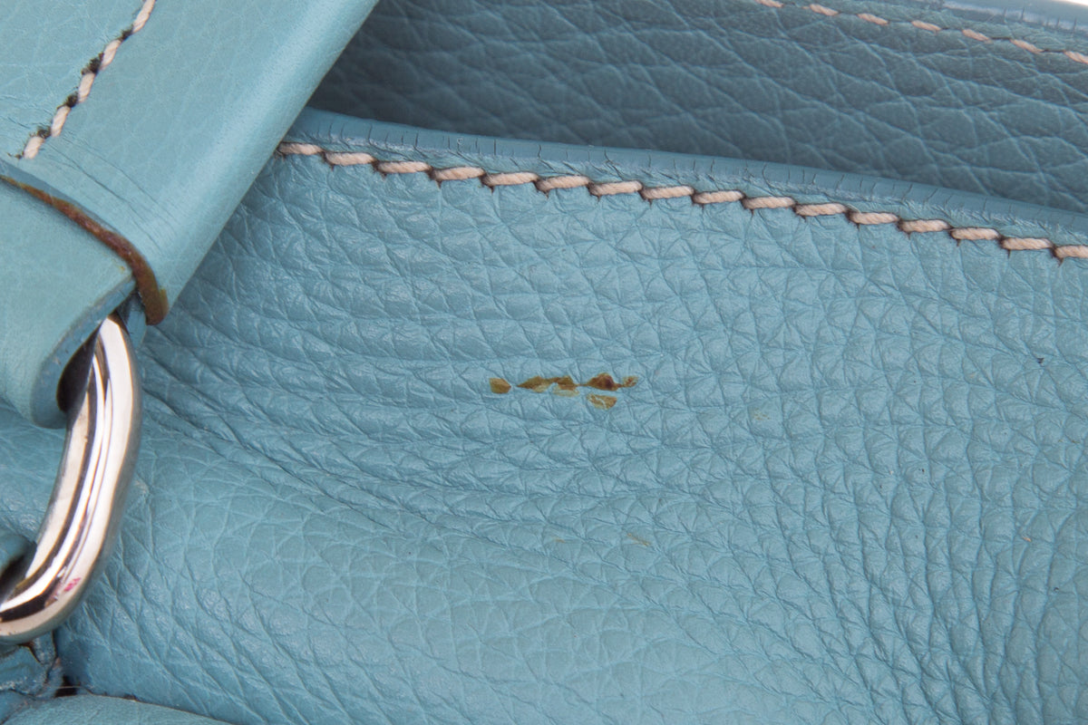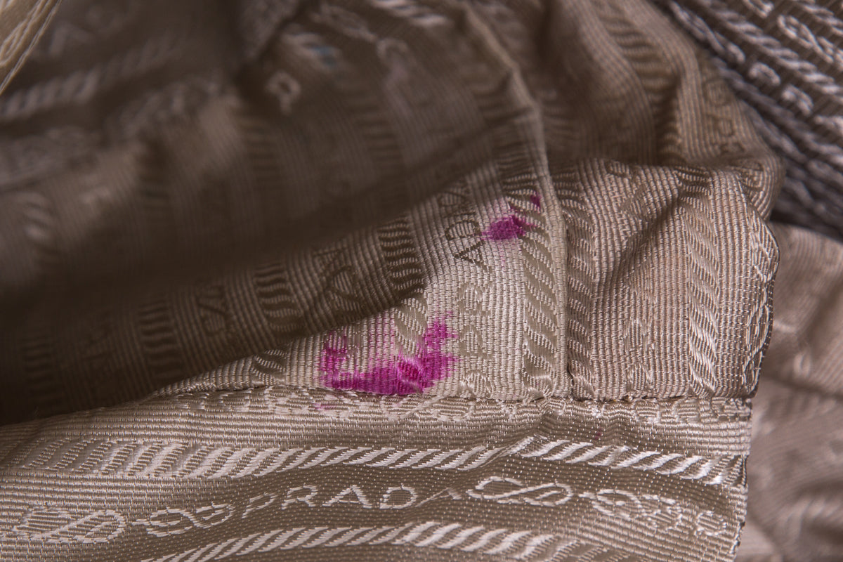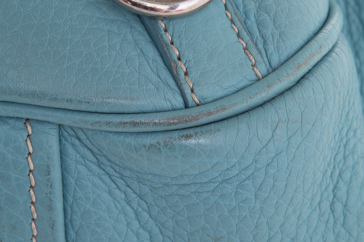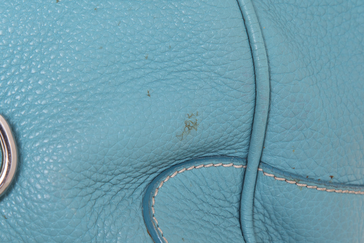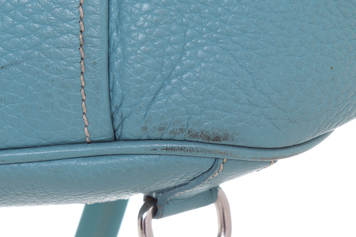 Prada Light Blue Shoulder Bag with dual front pockets on both side, dual shoulder straps and silver hardware. This item is in good condition; some wear/discoloring to exterior and interior.