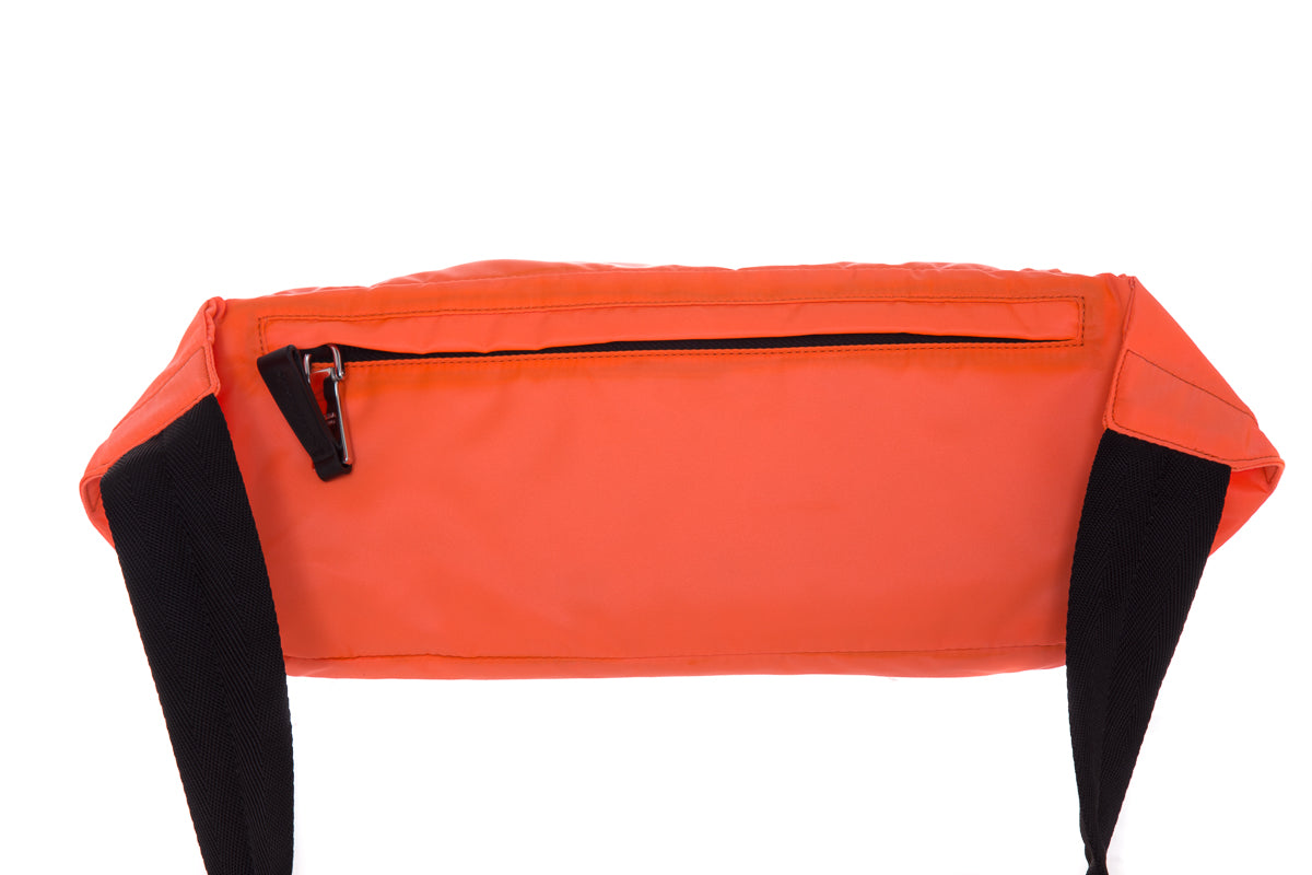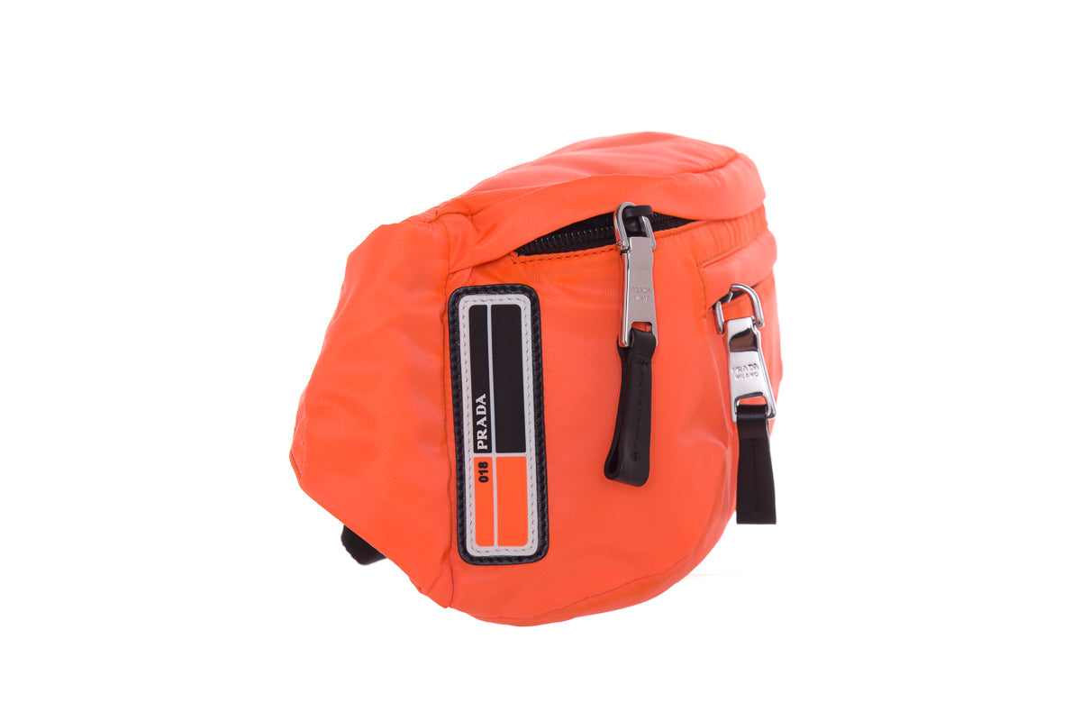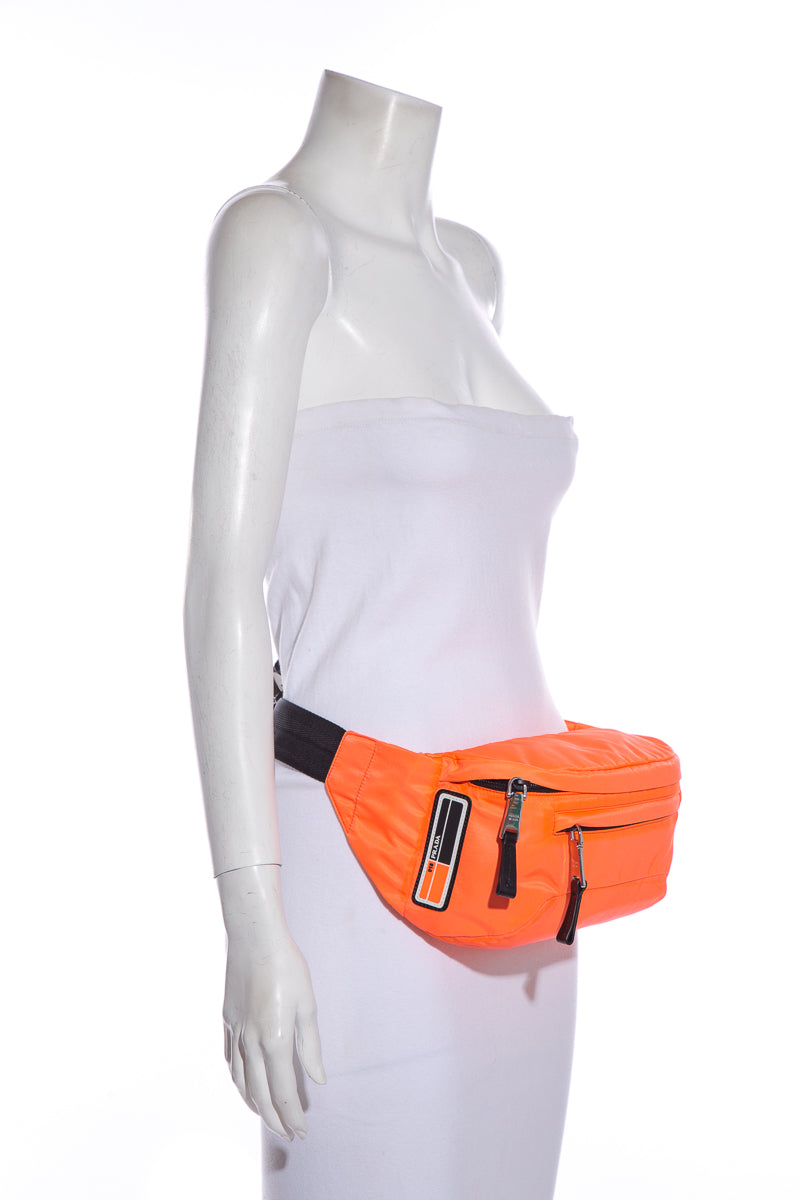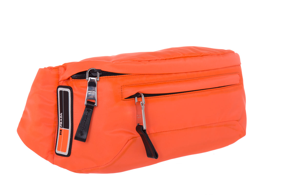 Prada Neon Coral Technical Front Tessuto Fanny Pack with silver hardware, multi functional zippers. This item is in good condition; some discoloring on edges.
