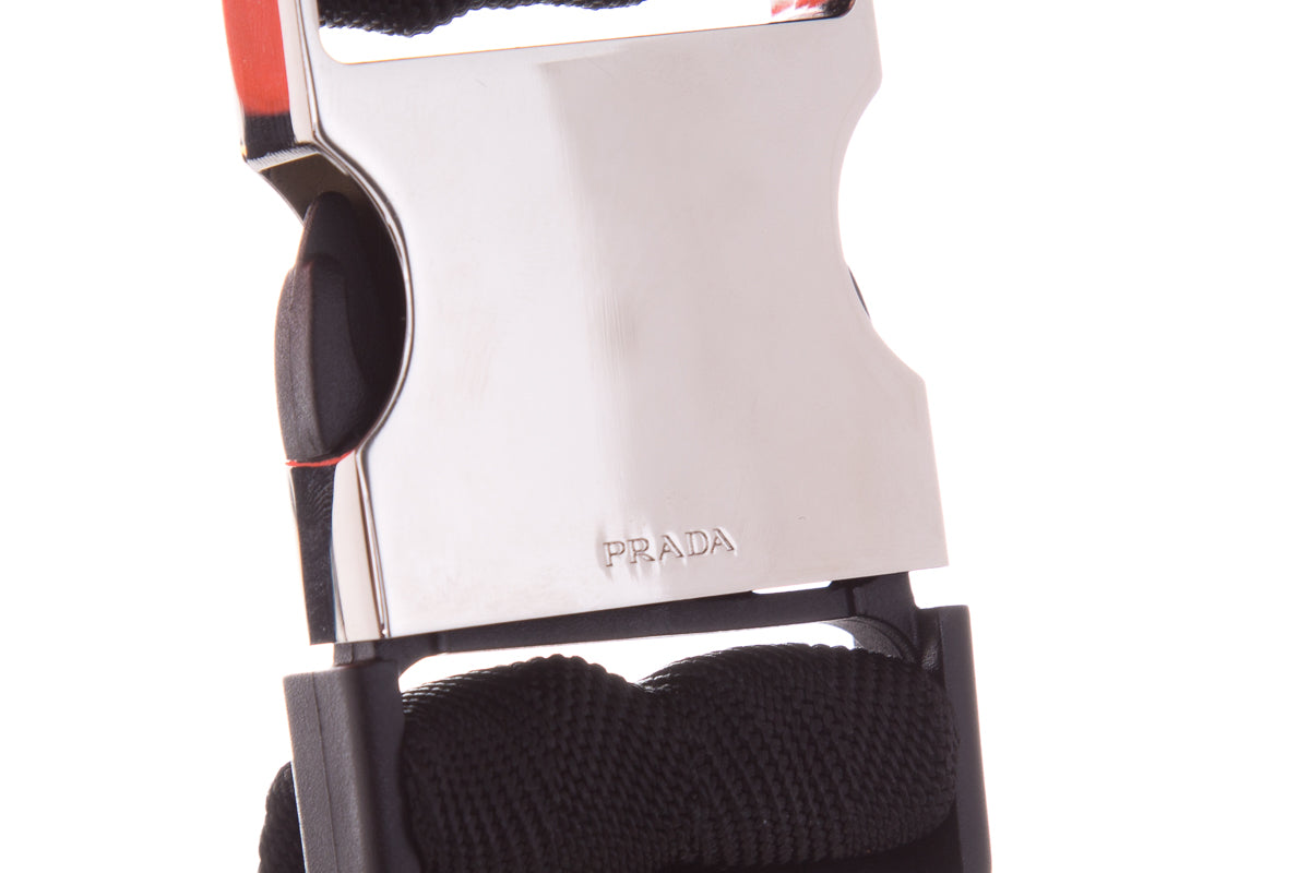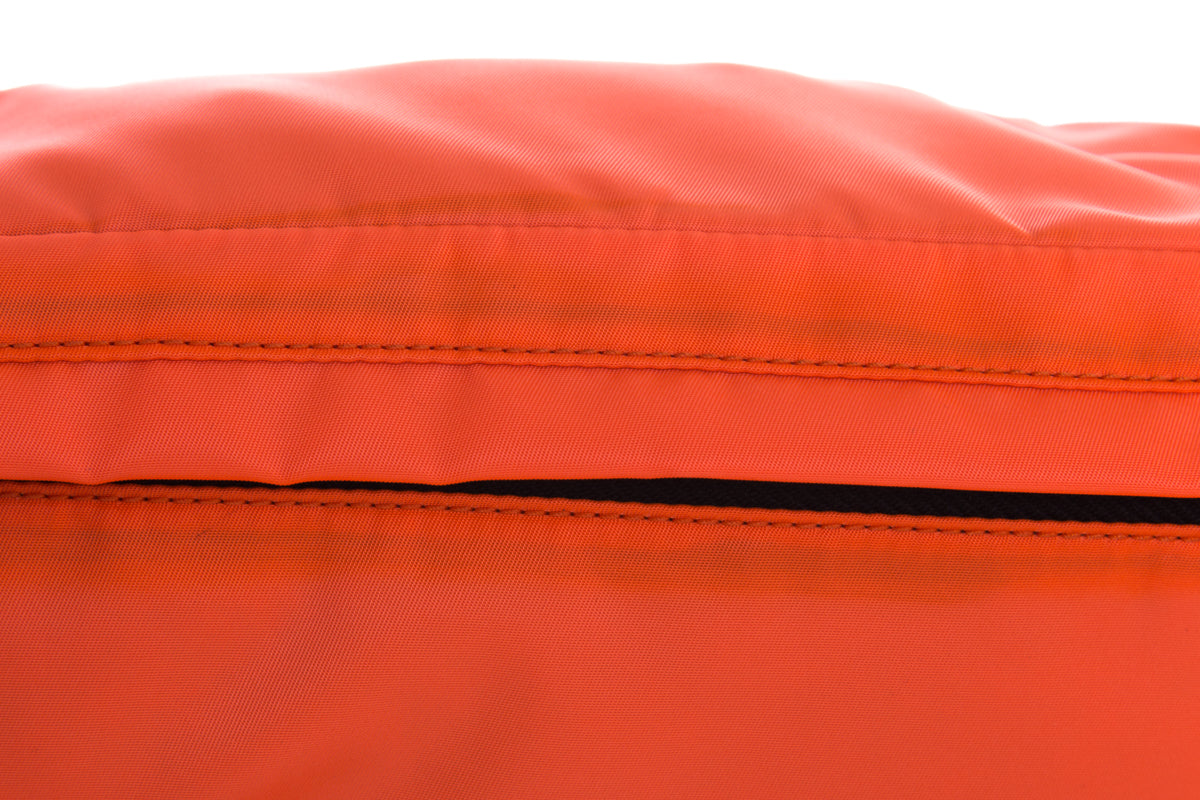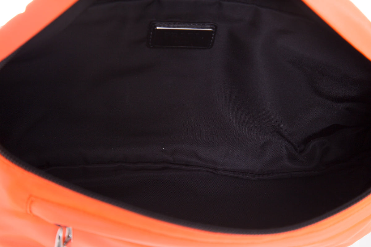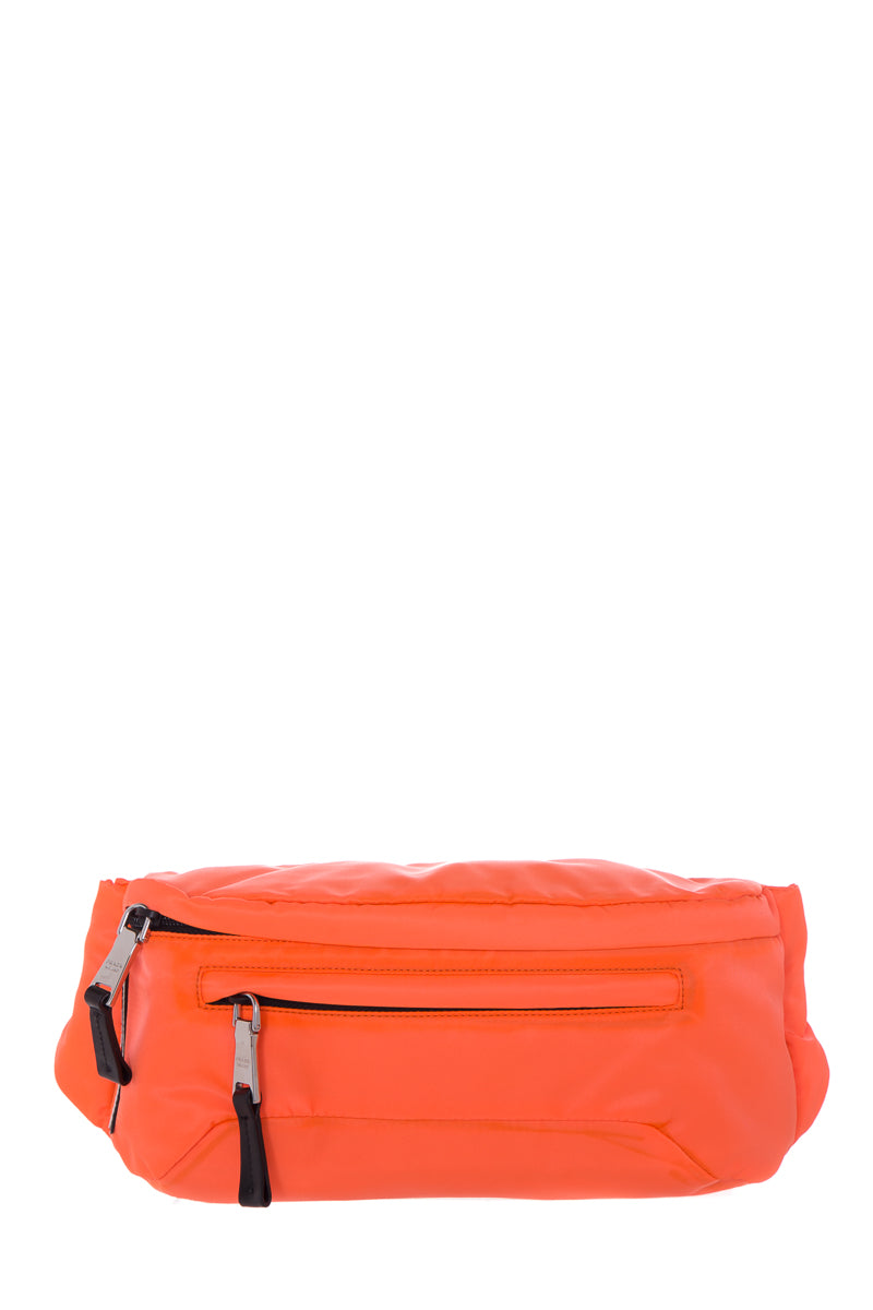 Prada Neon Coral Technical Front Tessuto Fanny Pack with silver hardware, multi functional zippers. This item is in good condition; some discoloring on edges.