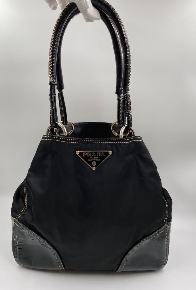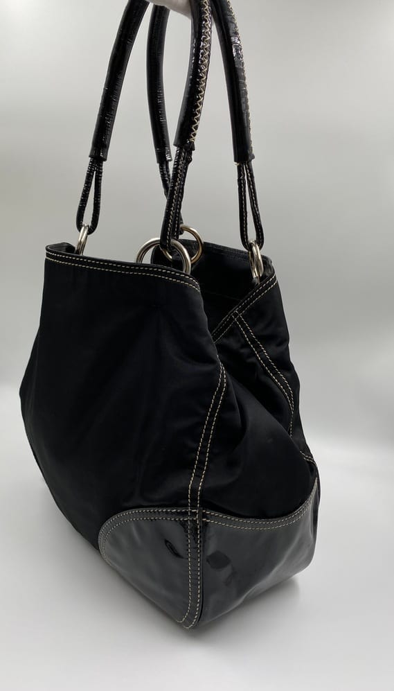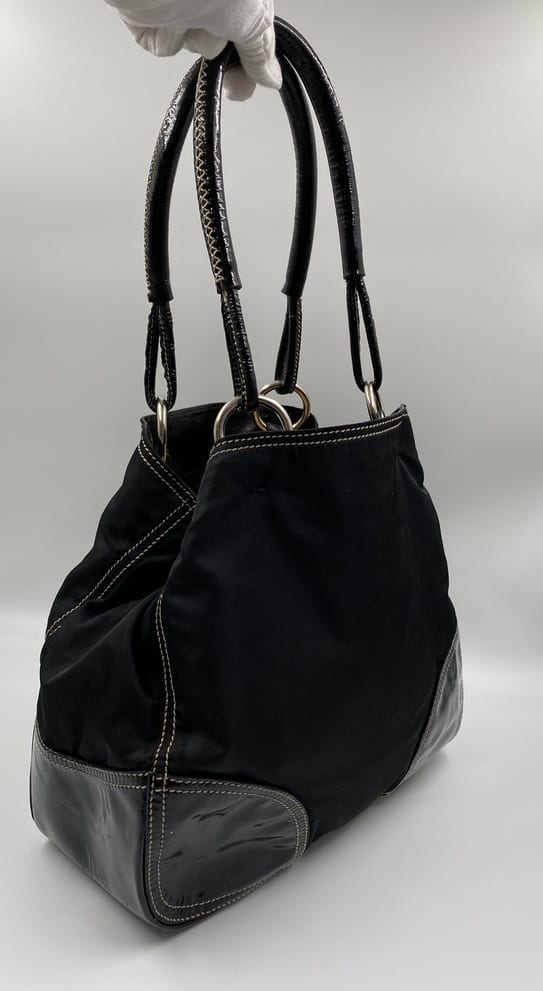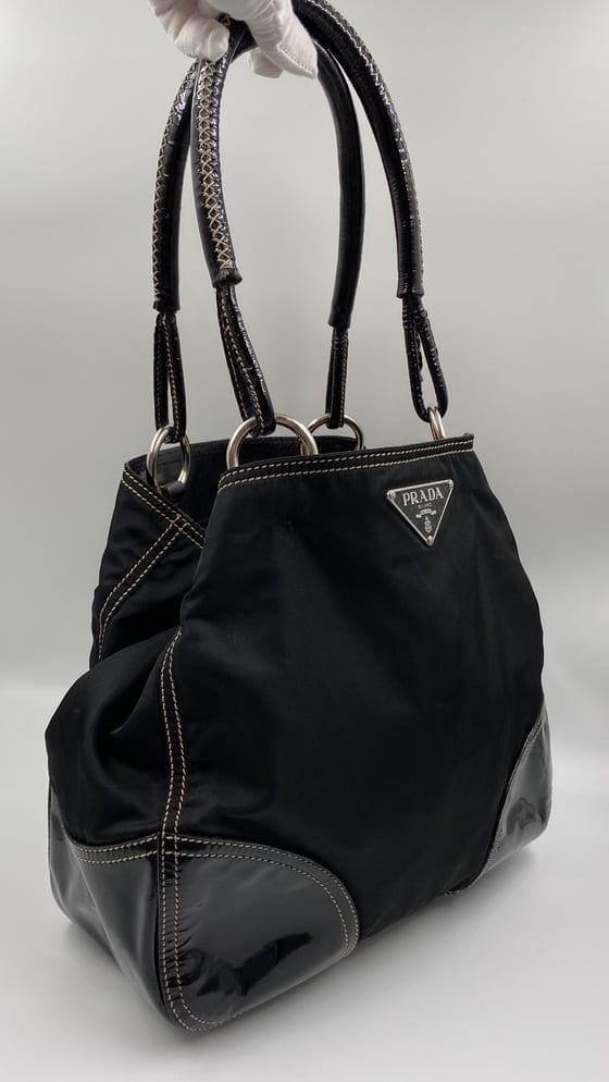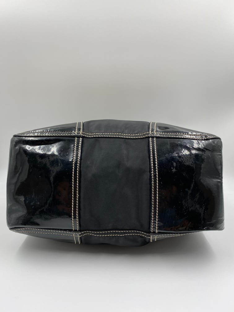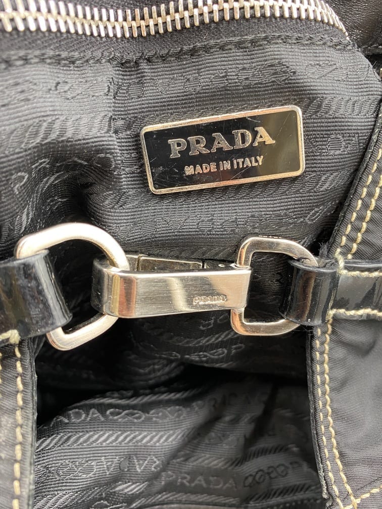 Prada nylon and patent leather tote. Nylon main body with patent leather bottom corners and handles with contrast stitch. Inside the bag is lined with the famous Prada logo lining and has a zipped pocket for valuables. The bag can be fastened with a Prada branded silver clip, a great everyday Prada bag. The Prada enamel plaque can be seen on the outside and inside of the bag. The Prada ‘factory code’ can be found in the internal pocket.