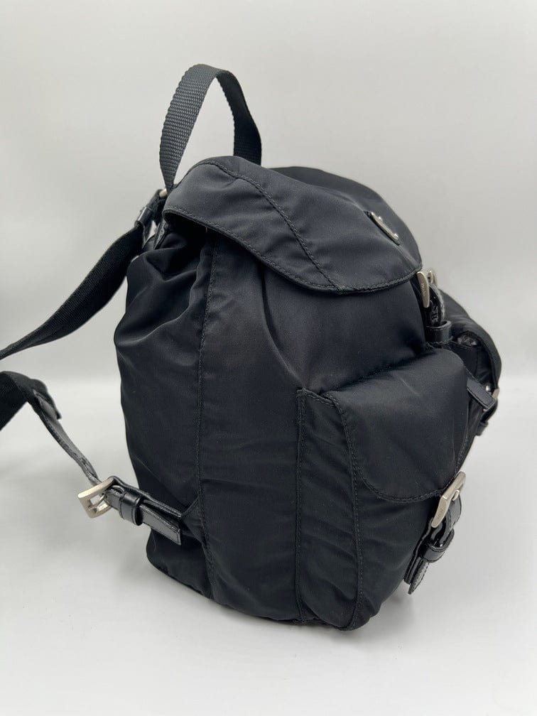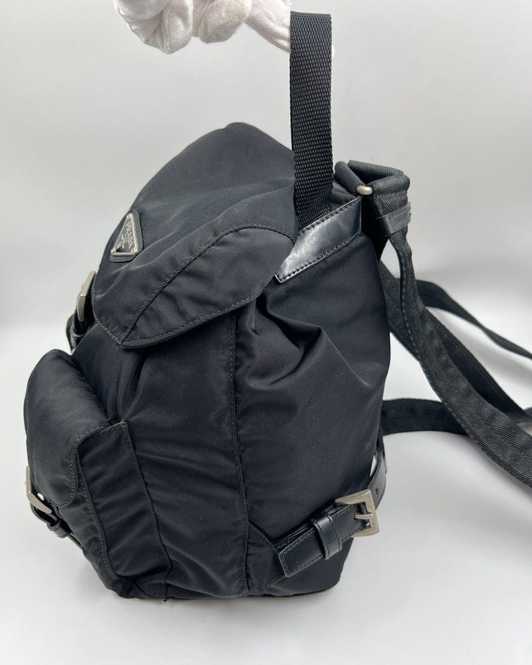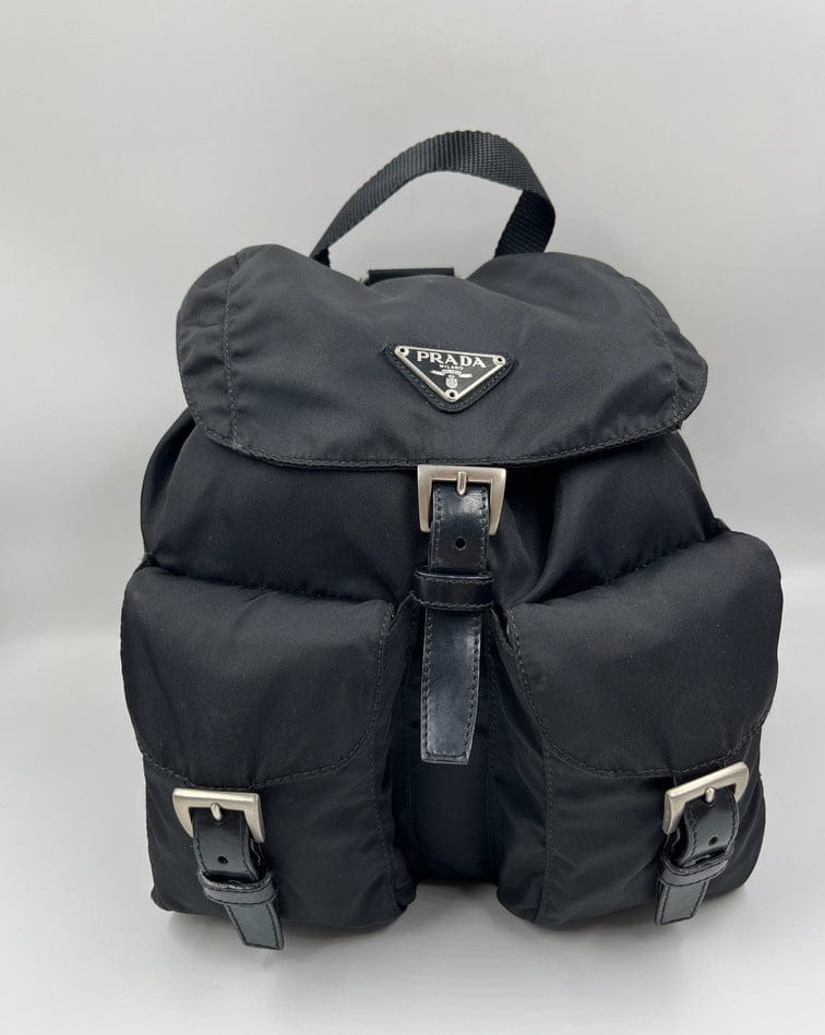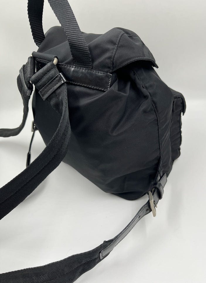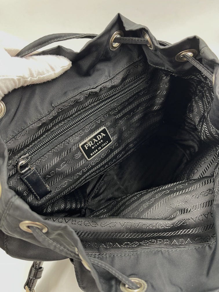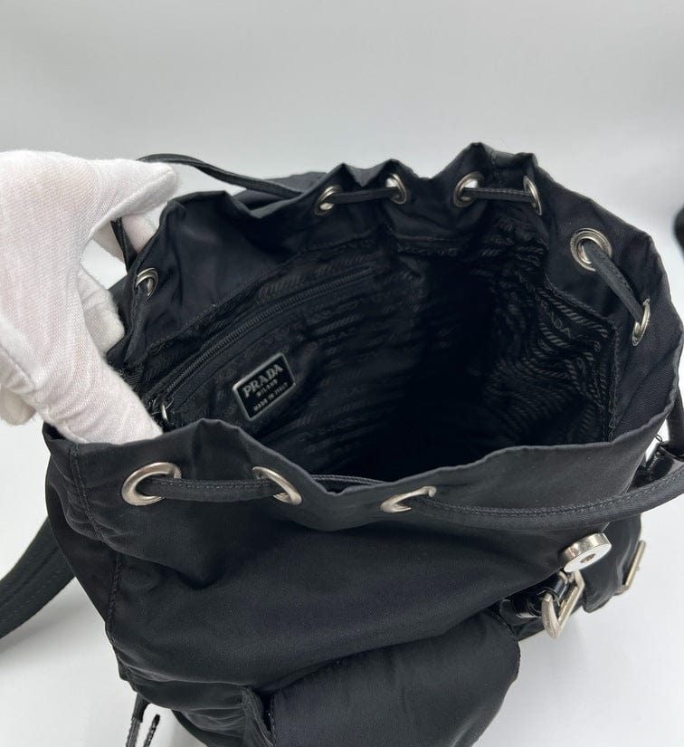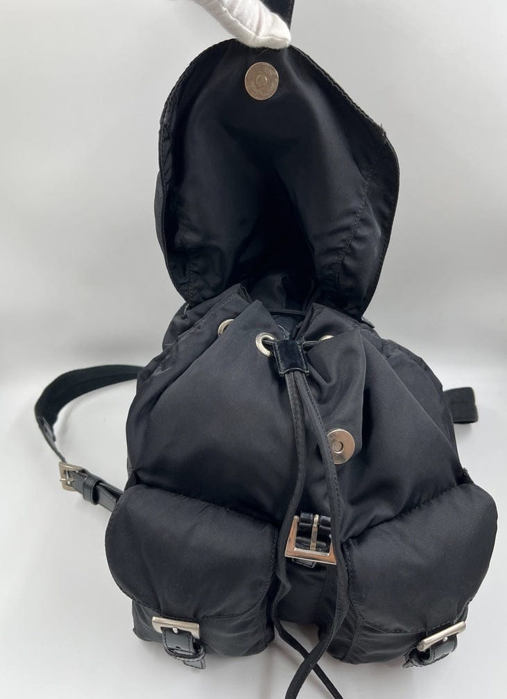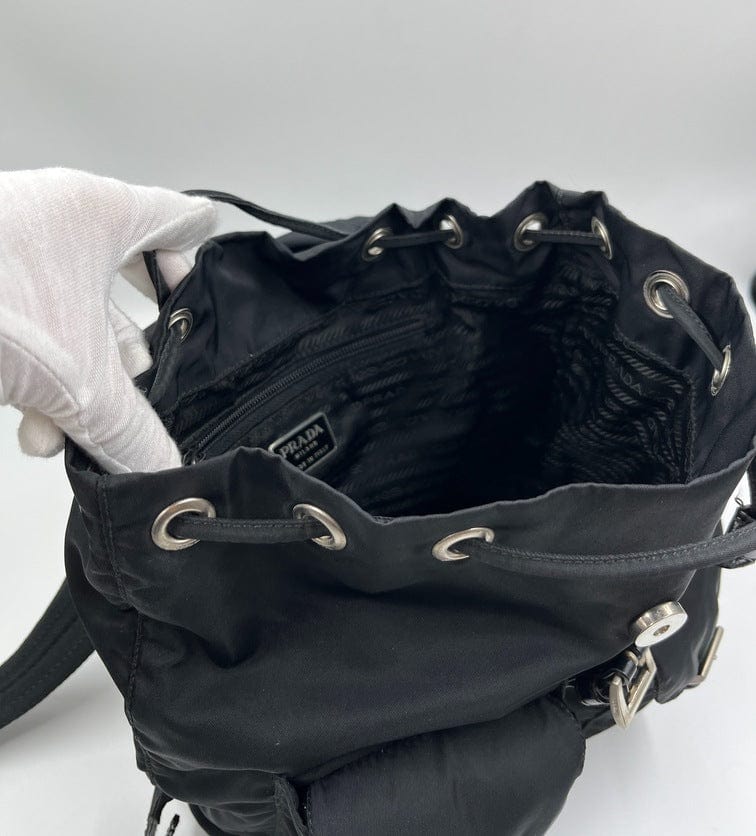 When Prada released its original nylon backpack in 1984 it was an instant hit. This nylon backpack with a modern, minimalist design is decorated with the Prada enamel triangle logo. Underneath the flap with a leather strap and buckle, is a drawstring closure.
