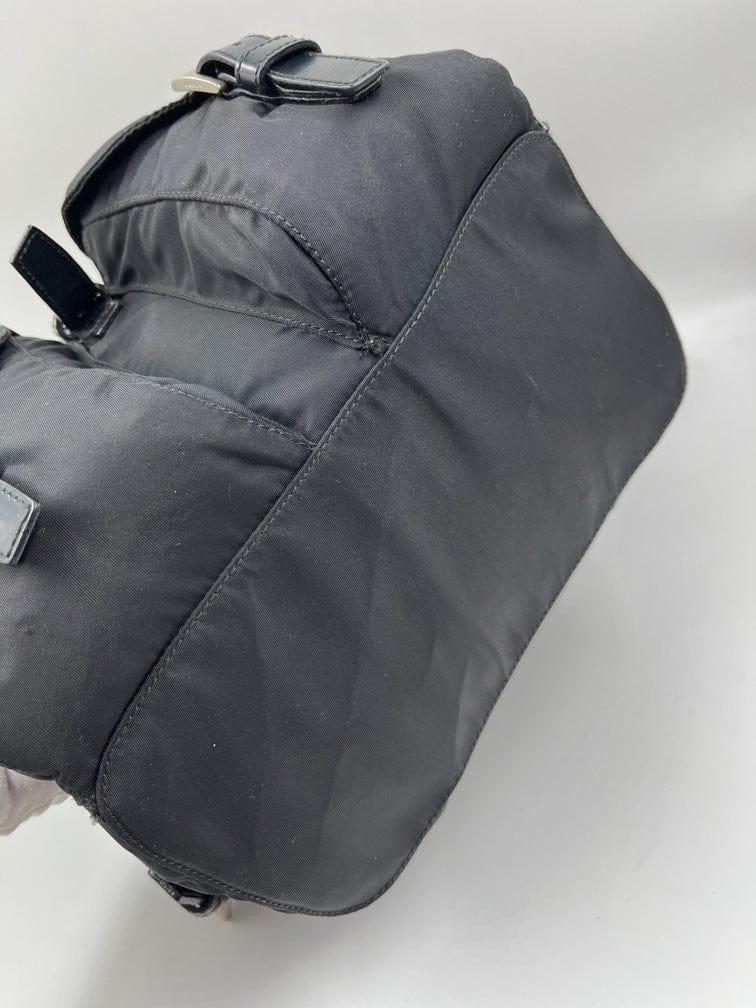 There are two adjustable webbing shoulder straps with Prada branded buckles and leather trim.