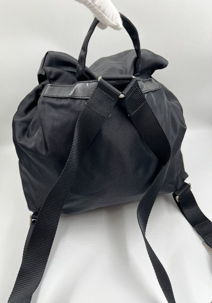 This nylon backpack with a modern, minimalist design is decorated with the Prada enamel triangle logo. Underneath the flap with a leather strap and buckle, is a drawstring closure. There are two adjustable webbing shoulder straps with Prada branded buckles.
