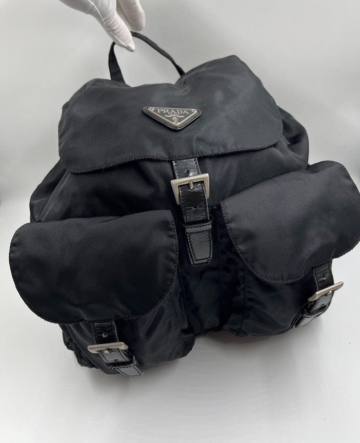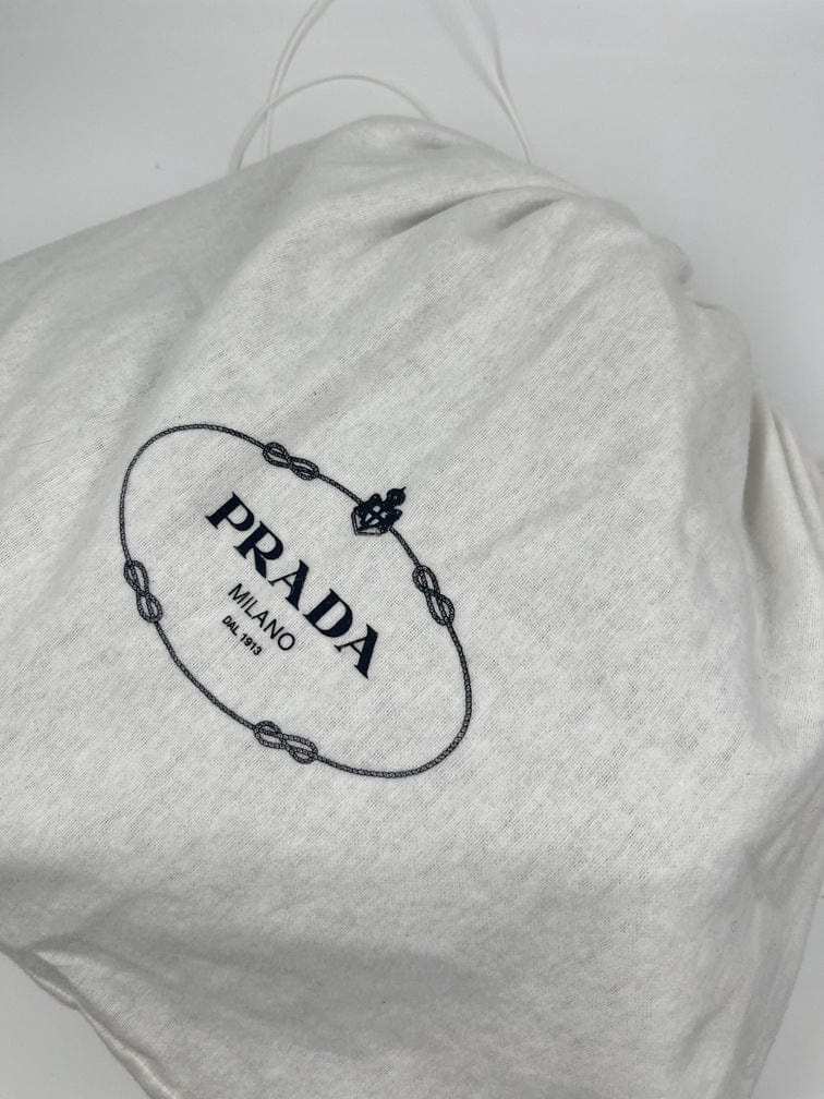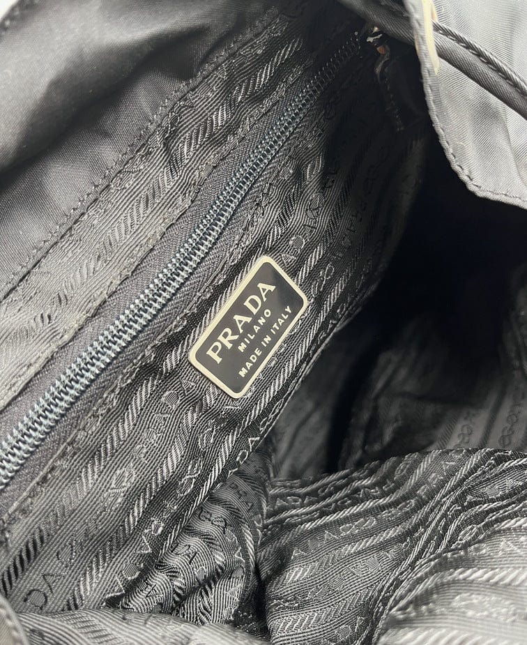 There are two buckled pockets on the front. Inside features the iconic Prada logo lining and an interior zipped pocket for valuables.