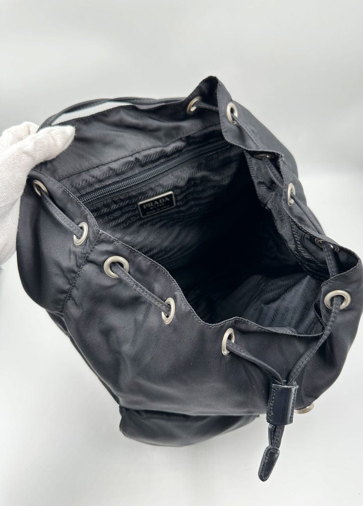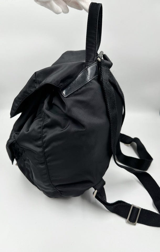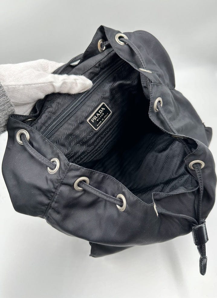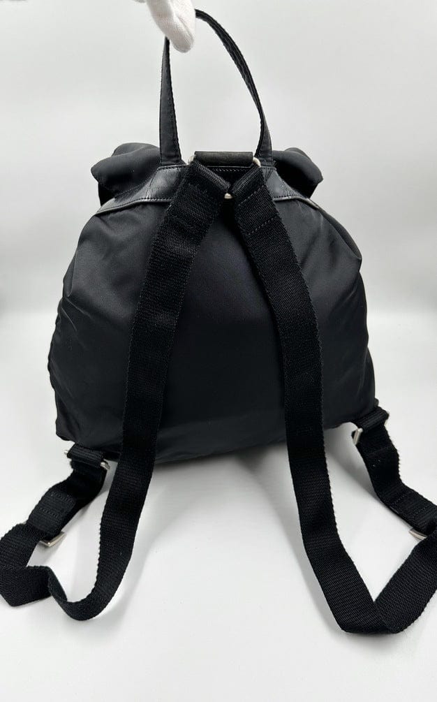 This nylon backpack with a modern, minimalist design is decorated with the Prada enamel triangle logo. Underneath the flap with a leather strap and buckle, is a drawstring closure. There are two adjustable webbing shoulder straps with Prada branded buckles.