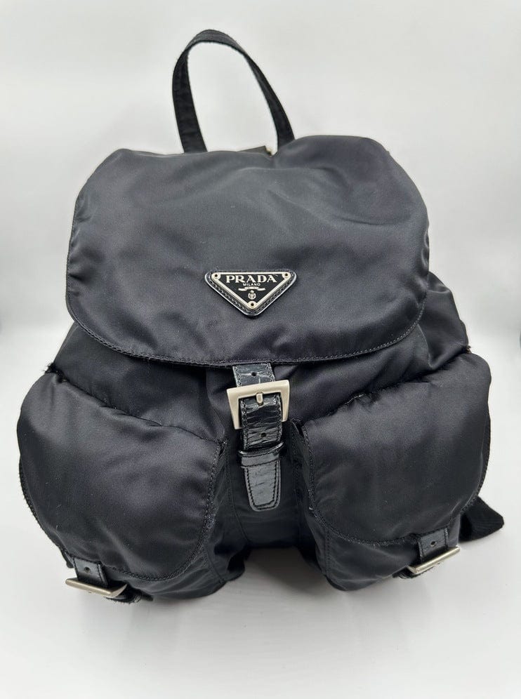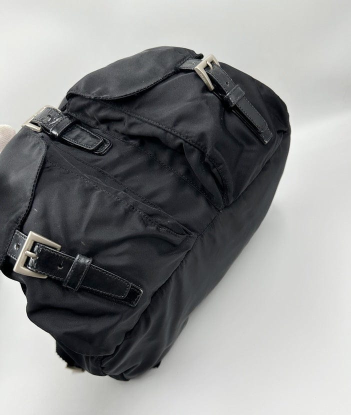 There are two buckled pockets on the front. Inside features the iconic Prada logo lining and an interior zipped pocket for valuables.