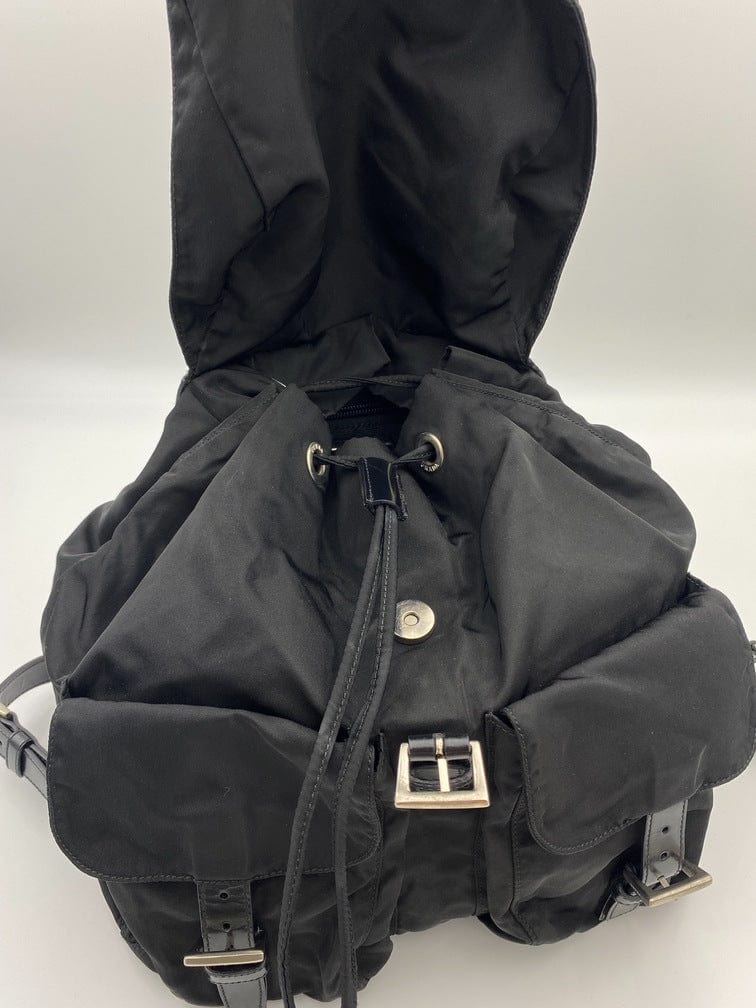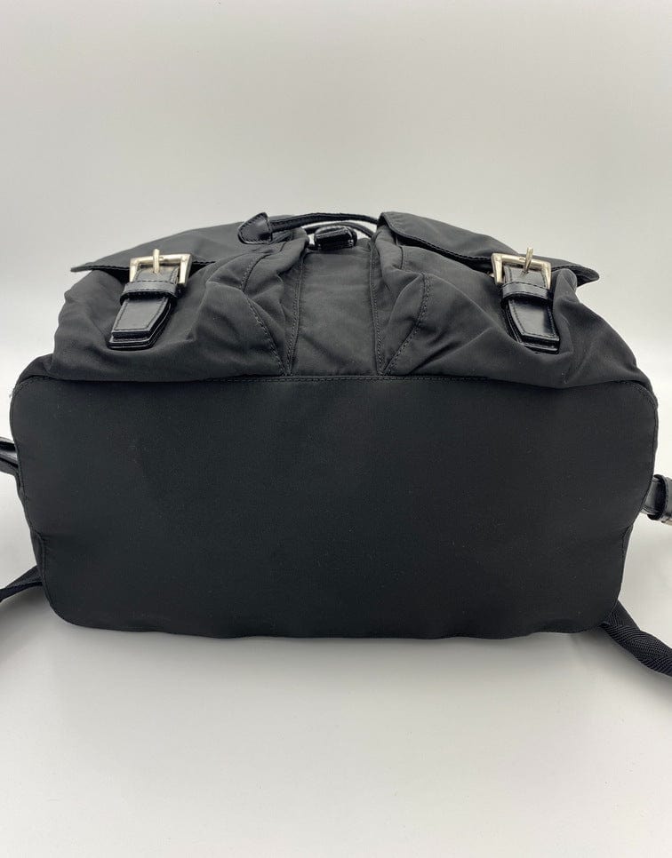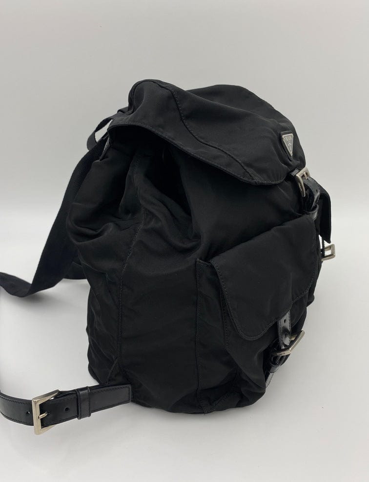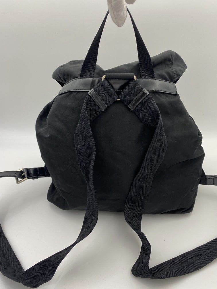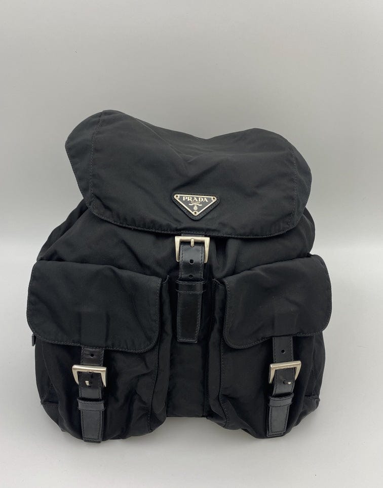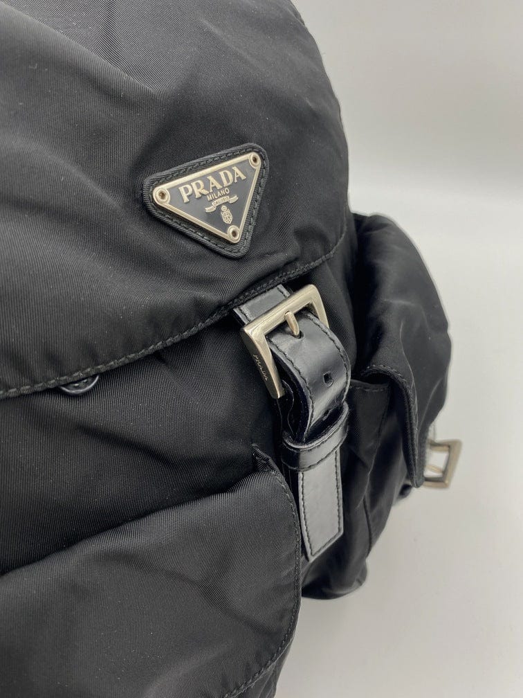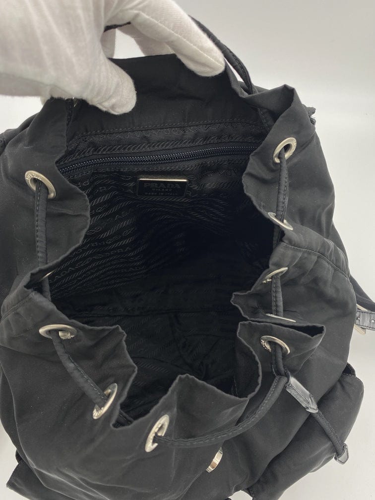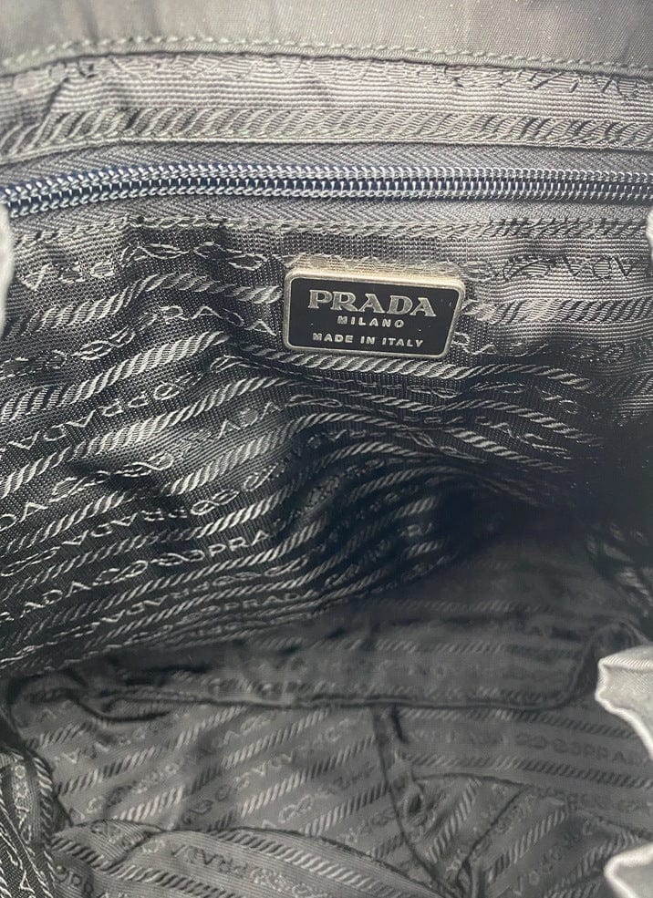 This vintage cult backpack from Prada is the ultimate throwback bag. When Prada released its original nylon backpack in 1984 it was an instant hit. This nylon backpack with a modern, minimalist design is decorated with the Prada enamel triangle logo. Underneath the flap with a leather strap and buckle, is a drawstring closure. There are two adjustable webbing shoulder straps with leather trim and Prada branded buckles. There are two front buckled pockets on the outside, again with leather trim and Prada branded hardware. Inside features the iconic Prada logo lining and an interior zipped pocket for valuables. Lightweight, super cool yet durable and easy to wipe down!