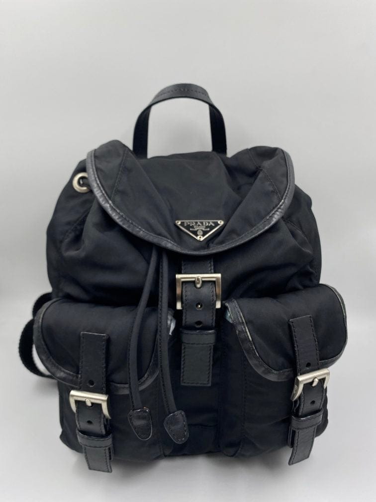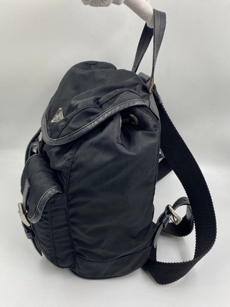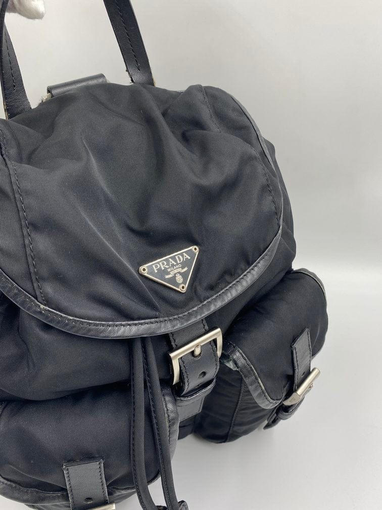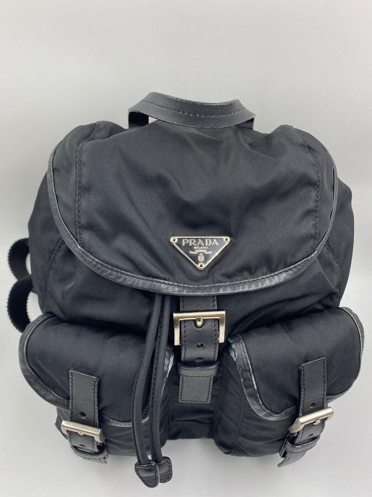 This vintage cult backpack from Prada is the ultimate throwback bag. When Prada released its original nylon backpack in 1984 it was an instant hit. This nylon backpack with a modern, minimalist design is decorated with the Prada enamel triangle logo. Underneath the flap with a leather strap and buckle, is a drawstring closure. There are two adjustable webbing shoulder straps with Prada branded buckles. There are two buckled pockets on the front. Inside features the iconic Prada logo lining and an interior zipped pocket for valuables. Lightweight, super cool yet durable and easy to wipe down!