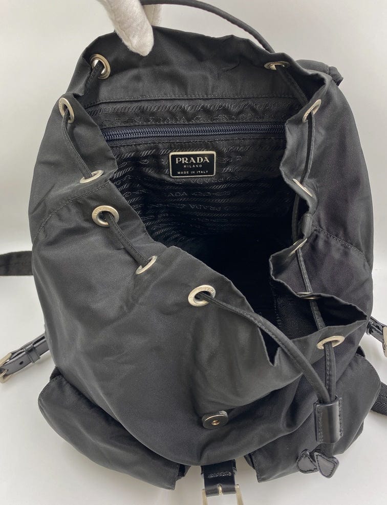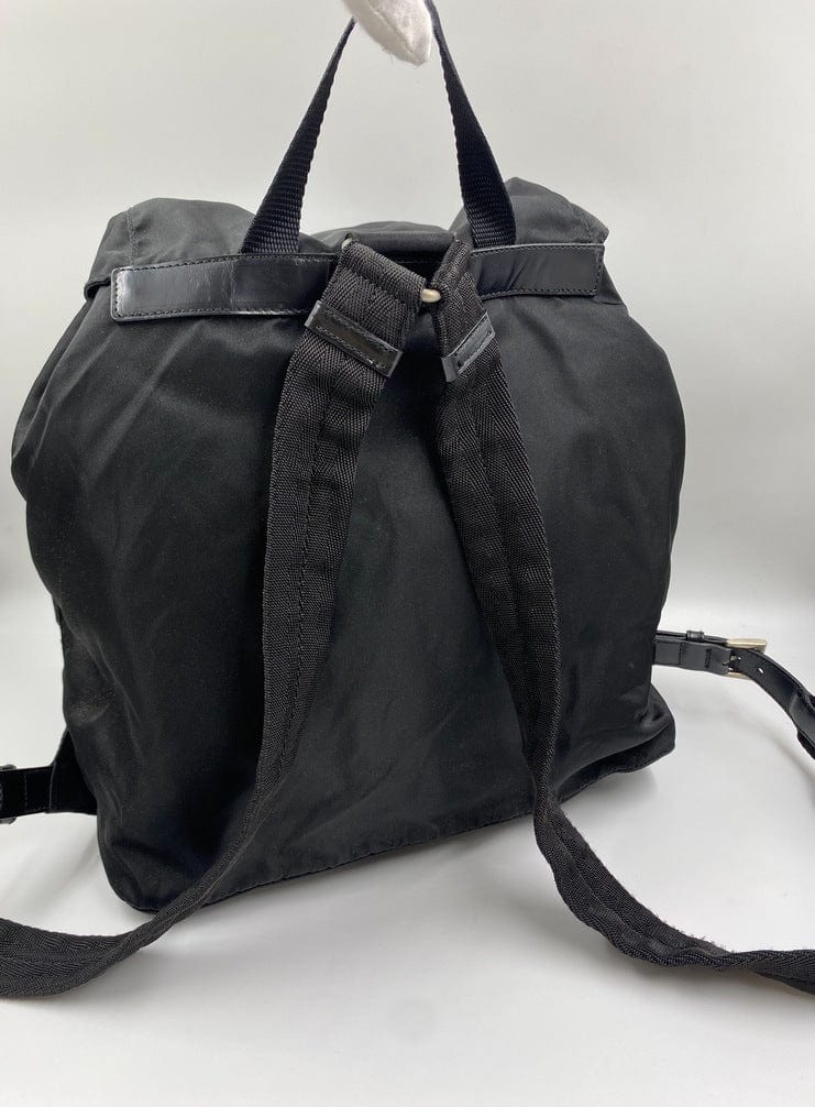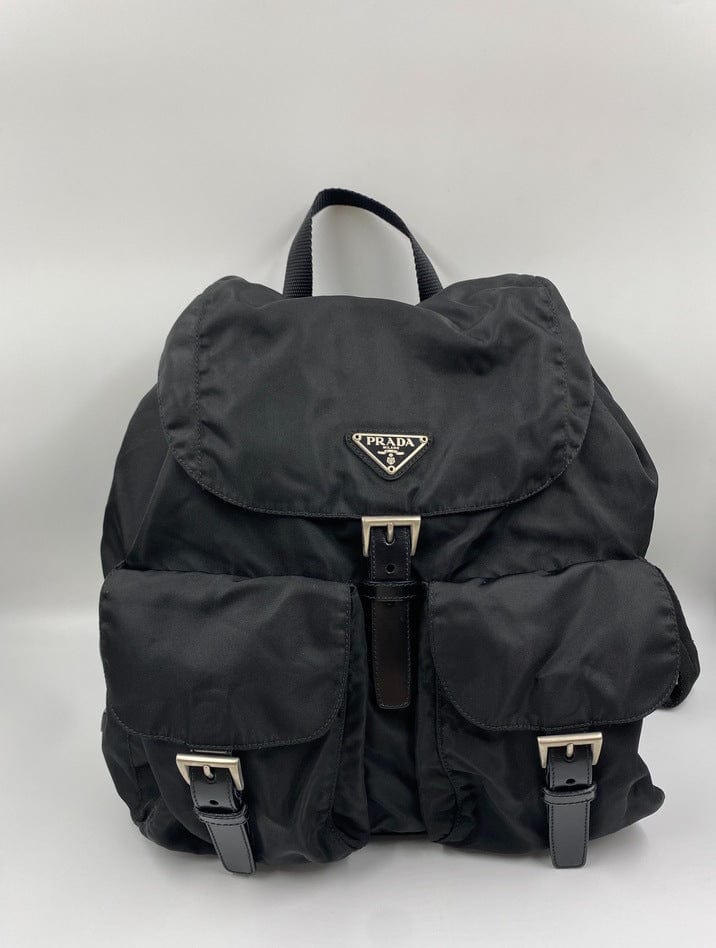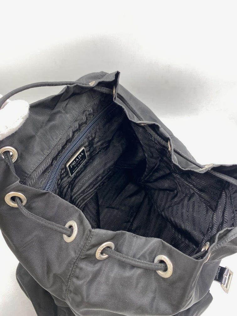 This vintage cult backpack from Prada is the ultimate throwback bag. When Prada released its original nylon backpack in 1984 it was an instant hit. This nylon backpack with a modern, minimalist design is decorated with the Prada enamel triangle logo. Underneath the flap with a leather strap and buckle, is a drawstring closure. There are two adjustable webbing shoulder straps with Prada branded buckles. There are two buckled pockets on the front. Inside features the iconic Prada logo lining and an interior zipped pocket for valuables. Lightweight, super cool yet durable and easy to wipe down!