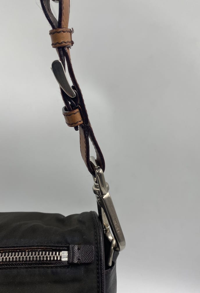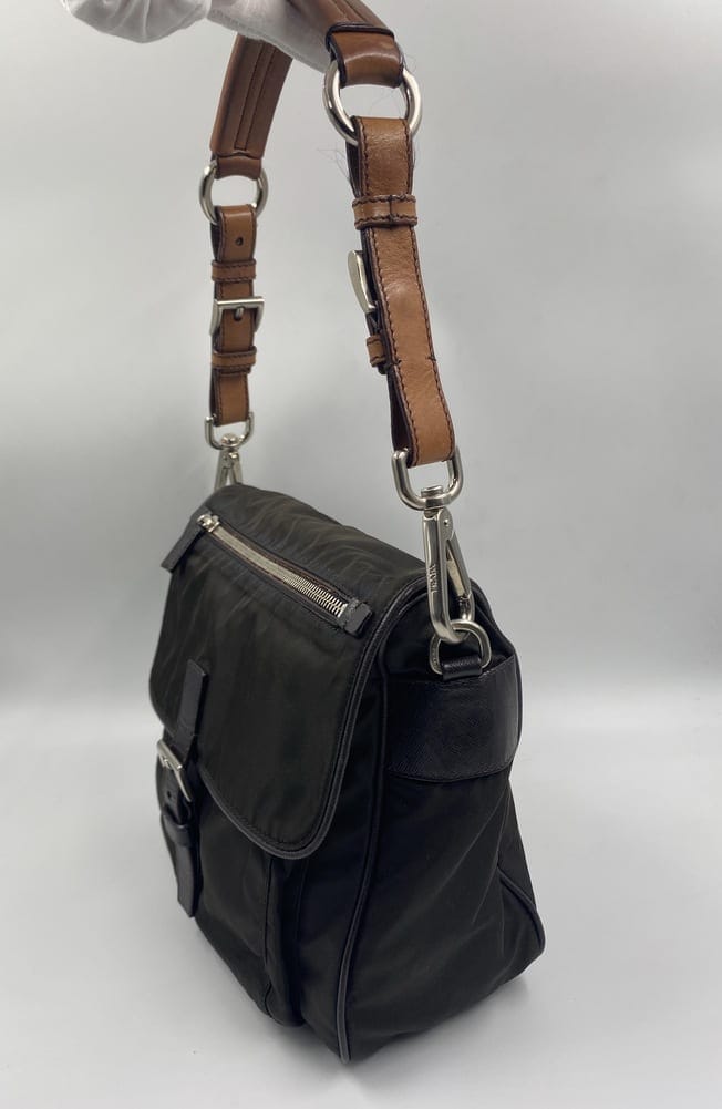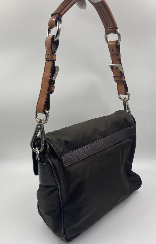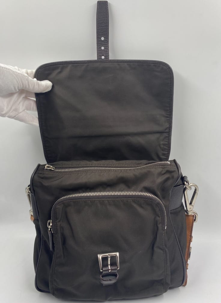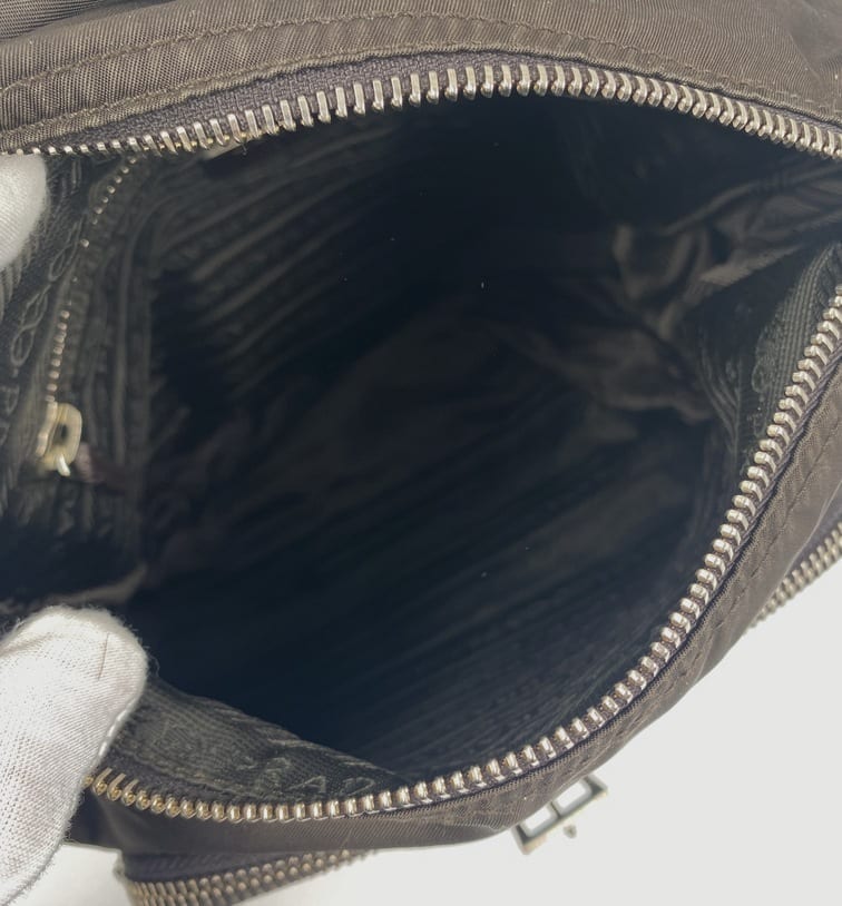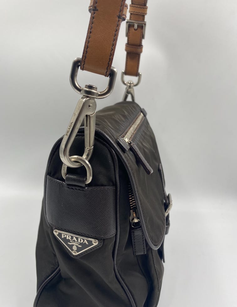 A brown utility Prada nylon bag with silver Prada branded hardware and a tan leather strap to be worn over the shoulder. This bag has multiple pockets. Inside the bag is lined with the famous Prada logo nylon lining, plus there is an interior zipped pocket for valuables.