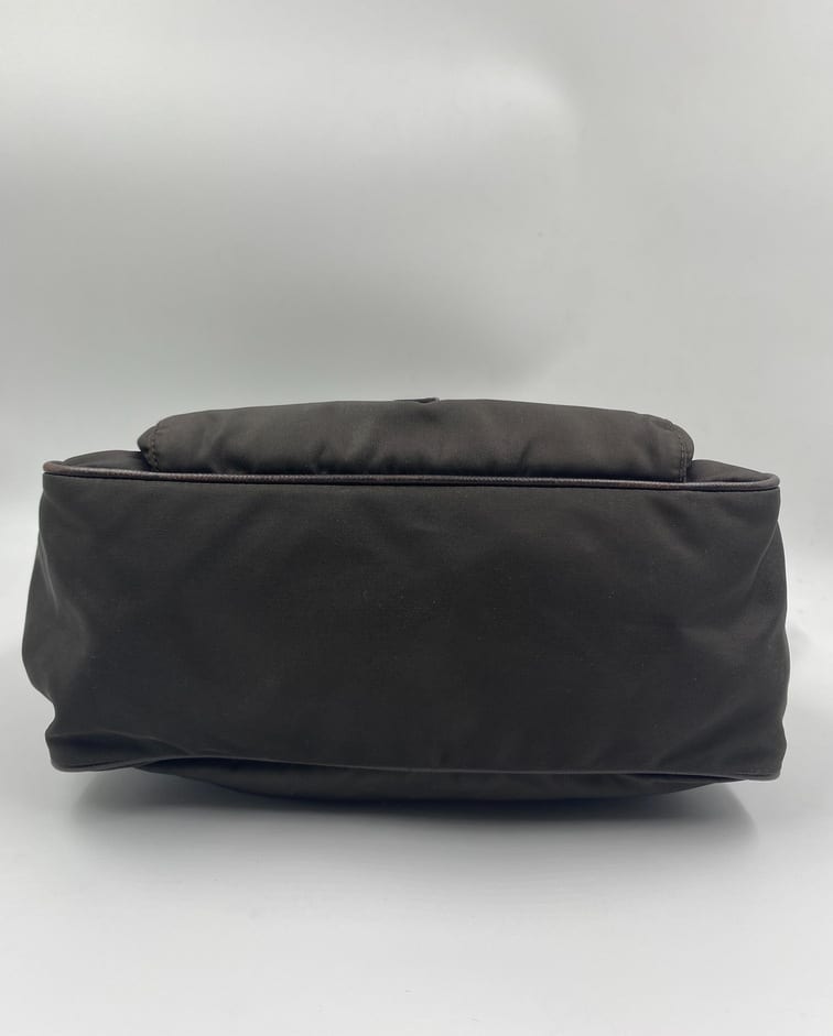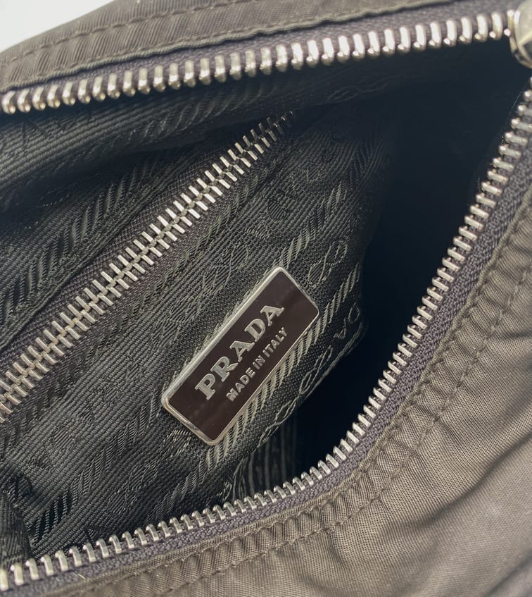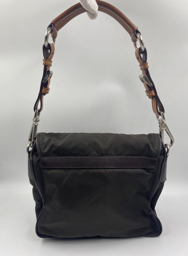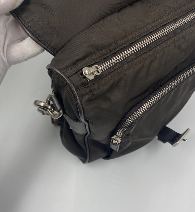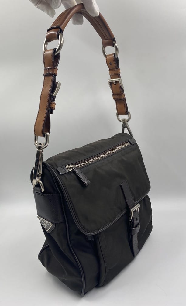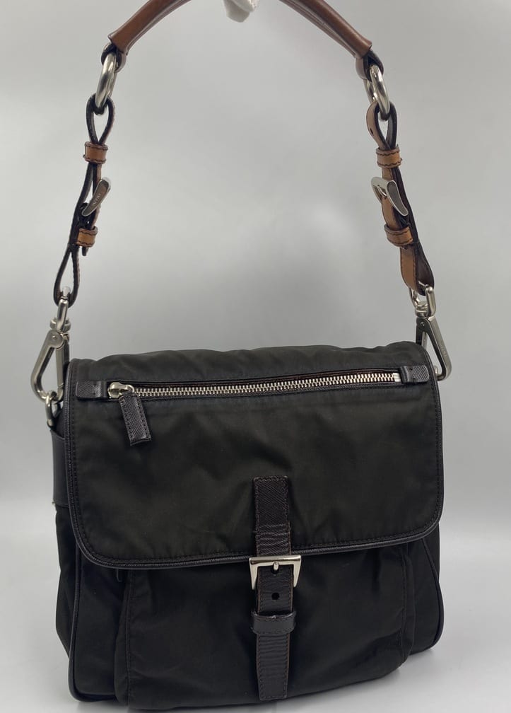 A brown utility Prada nylon bag with silver Prada branded hardware and a tan leather strap to be worn over the shoulder. This bag has multiple pockets. Inside the bag is lined with the famous Prada logo nylon lining, plus there is an interior zipped pocket for valuables.