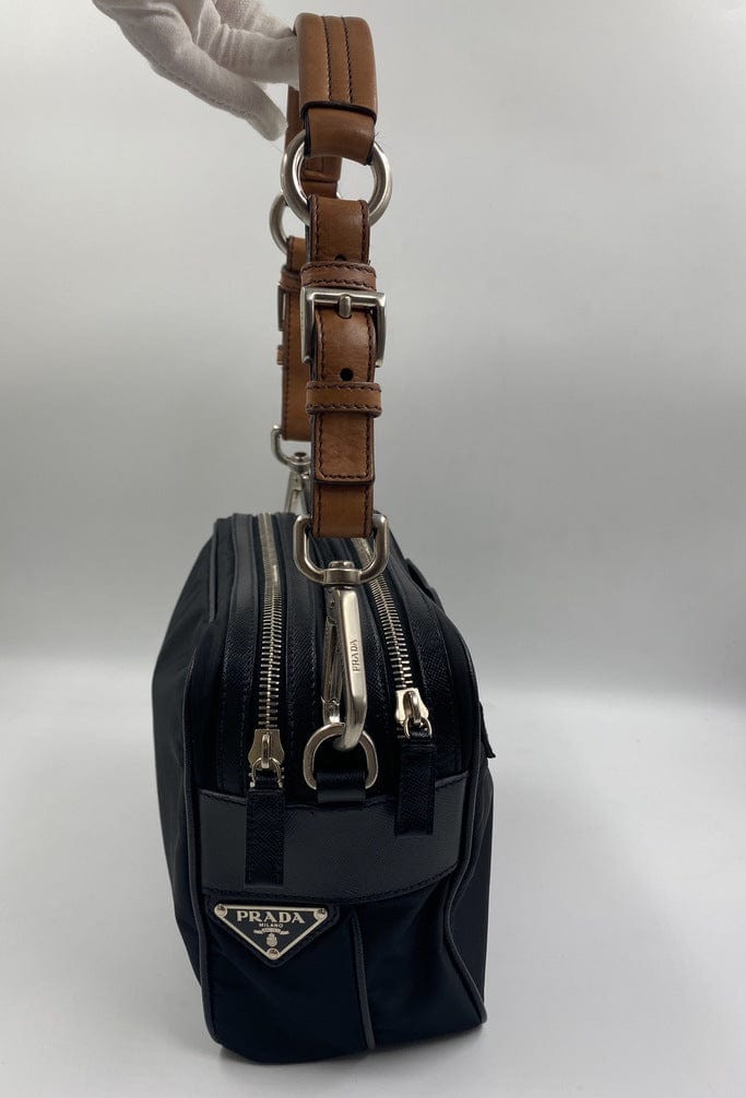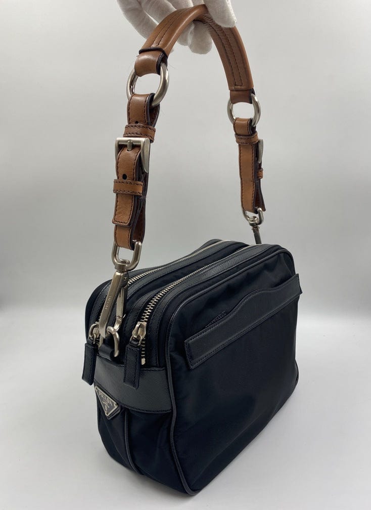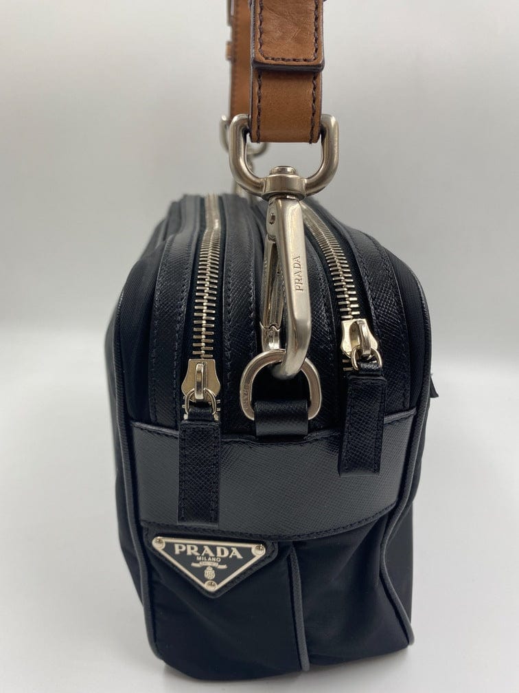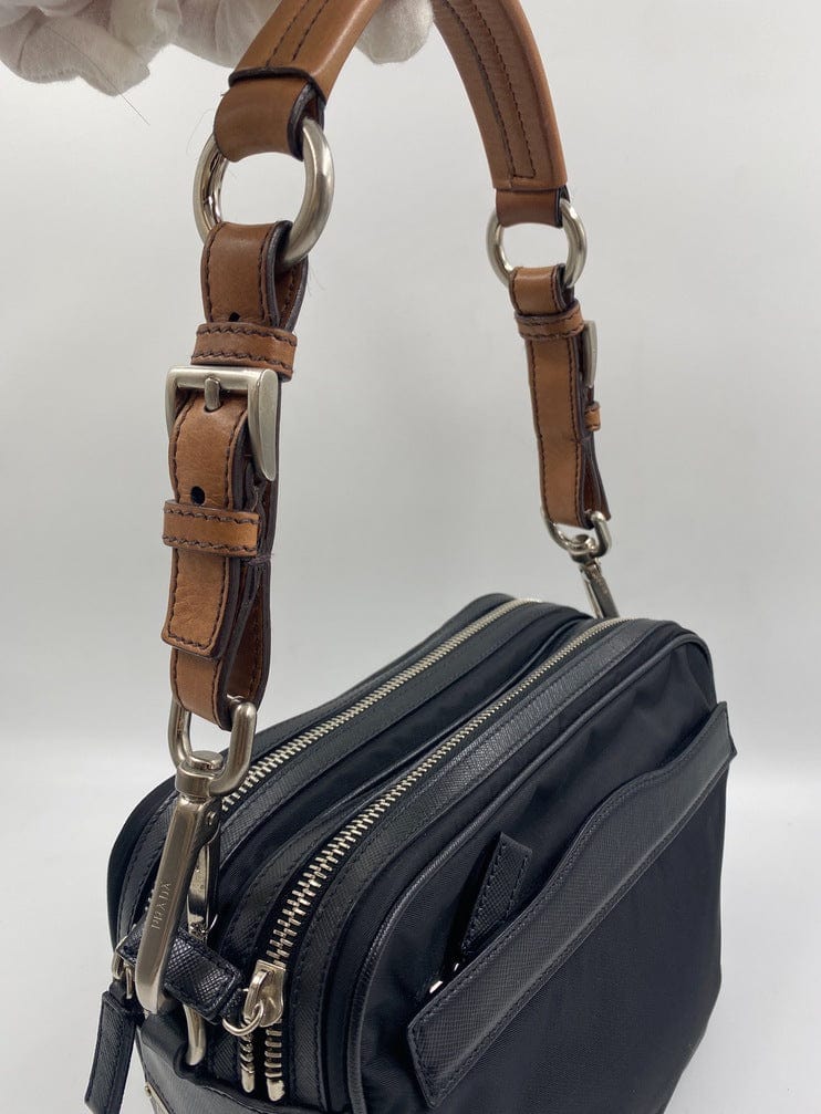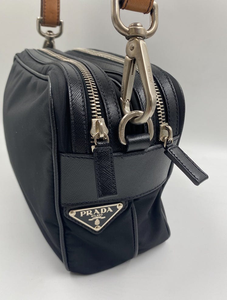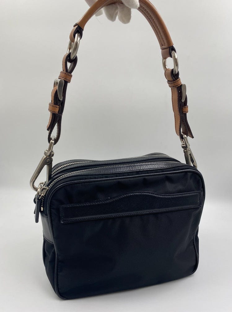 A black coloured vintage Prada nylon shoulder bag with tan leather trim and shoulder strap. This bag has a double zip opening at the top, each pocket lined with the classic Prada logo lining. There is an internal zipped pocket for valuables with the metal Prada logo plaque. Zips and hardware are silver in colour. There is an additional external zipped pocket on the front panel also.
