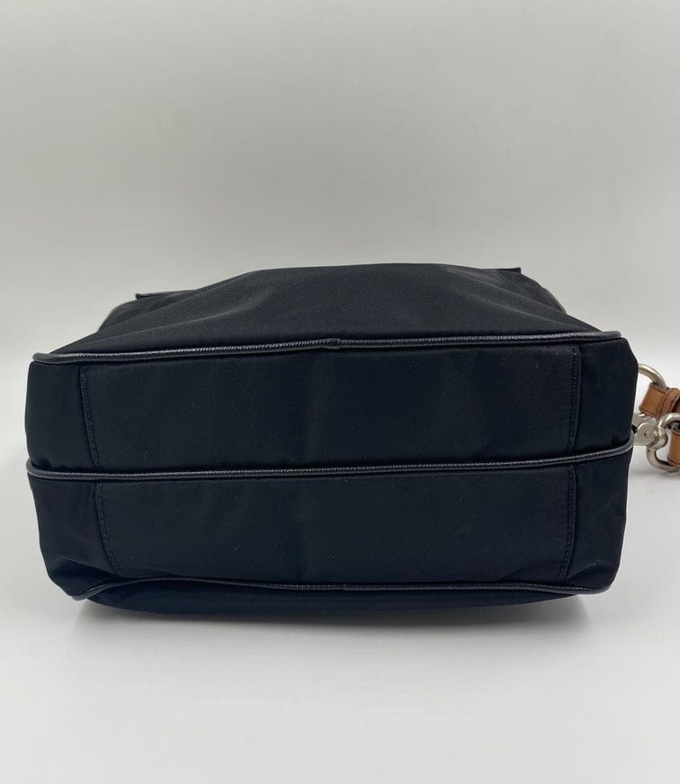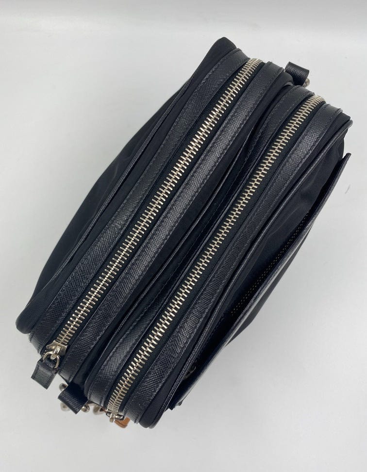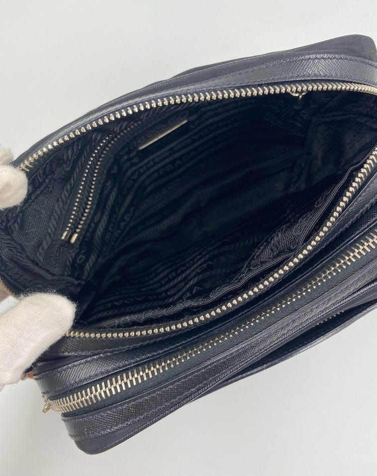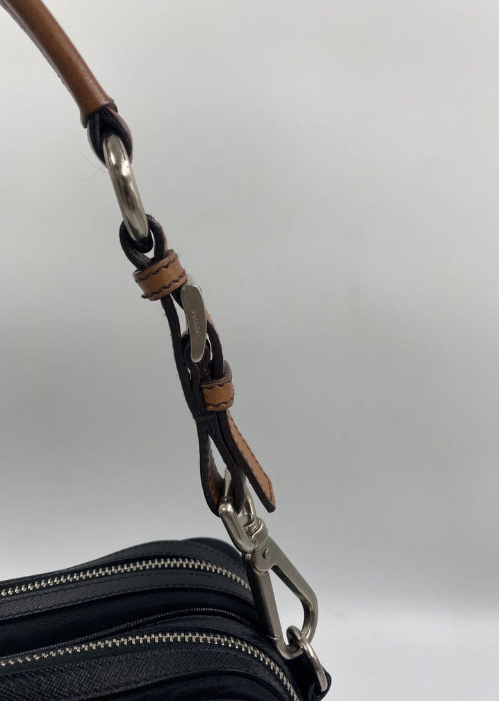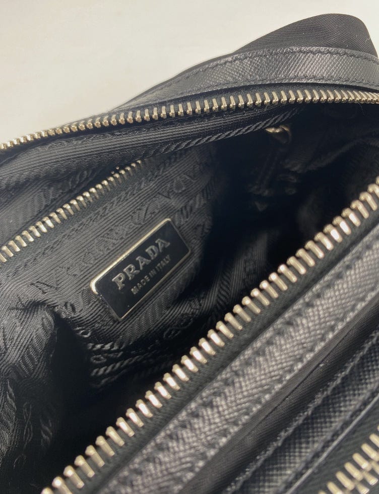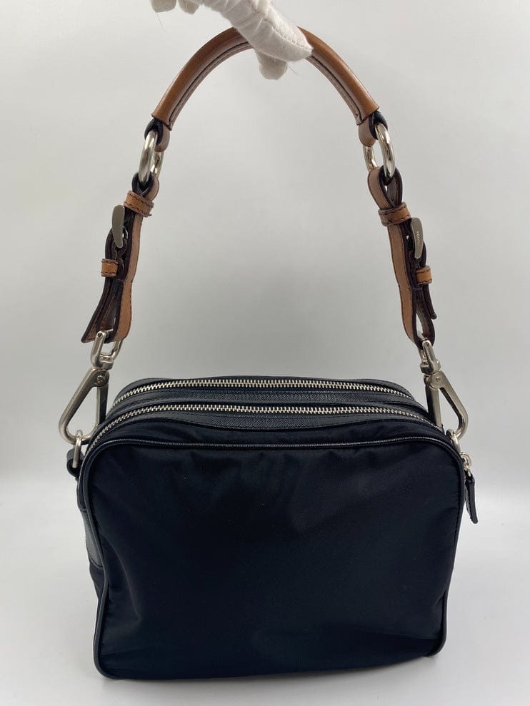 A black coloured vintage Prada nylon shoulder bag with tan leather trim and shoulder strap. This bag has a double zip opening at the top, each pocket lined with the classic Prada logo lining. There is an internal zipped pocket for valuables with the metal Prada logo plaque. Zips and hardware are silver in colour. There is an additional external zipped pocket on the front panel also.