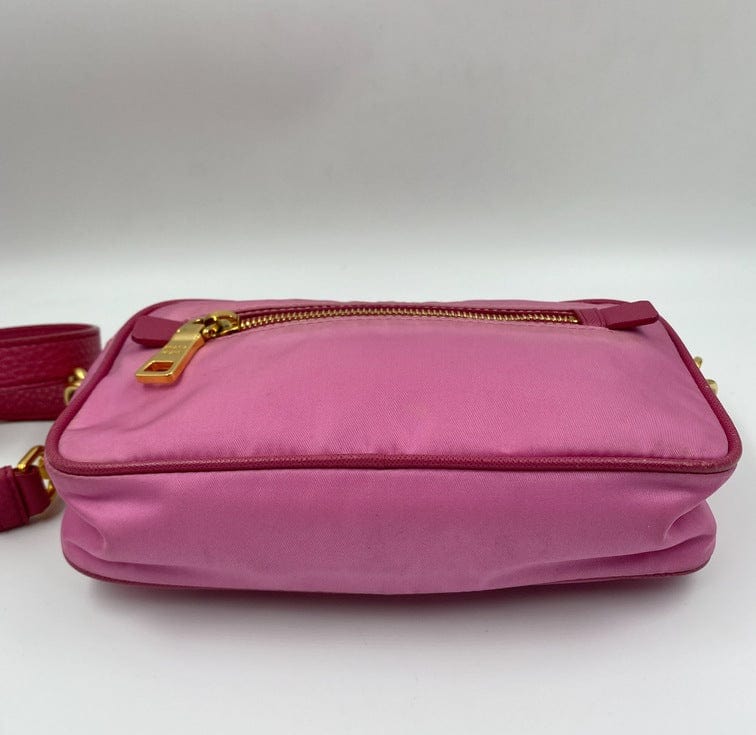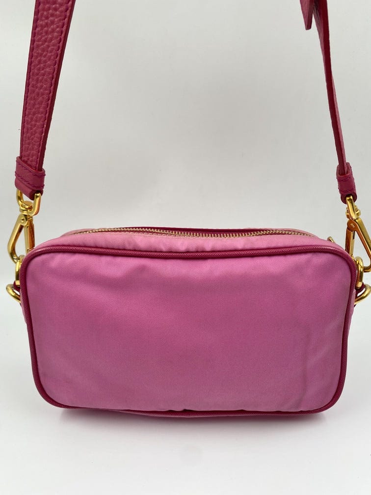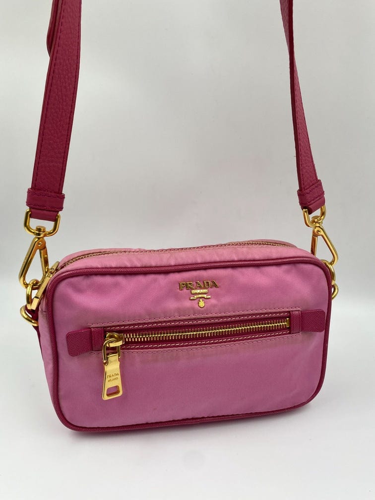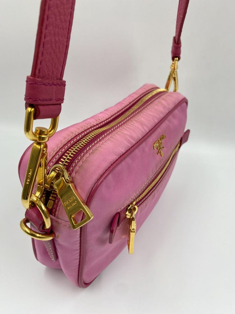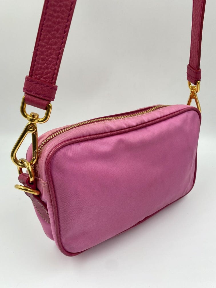 A fun pink Prada nylon crossbody bag with adjustable webbing strap and chunky gold Prada branded hardware. There is a zipped pocket on the front panel.
