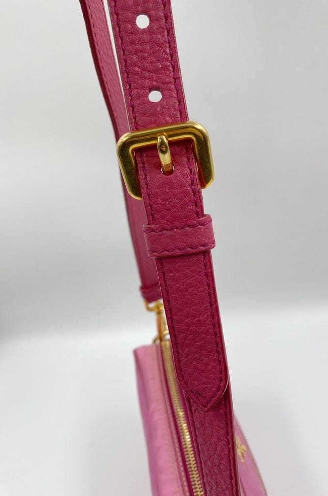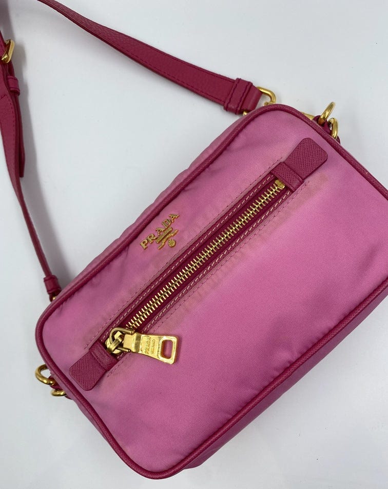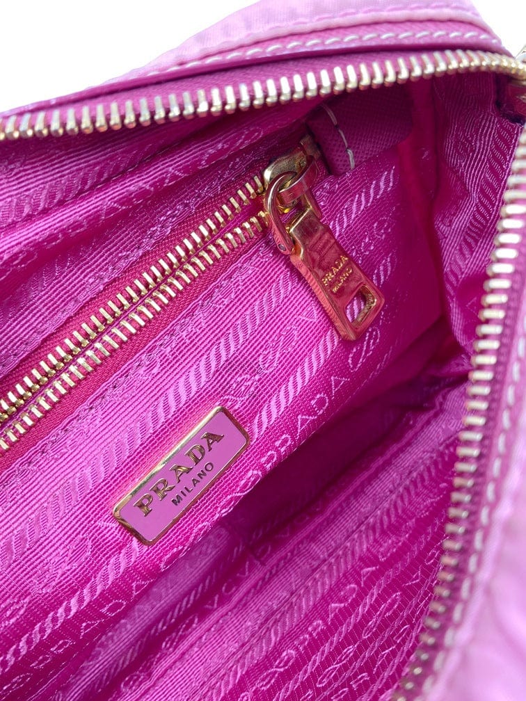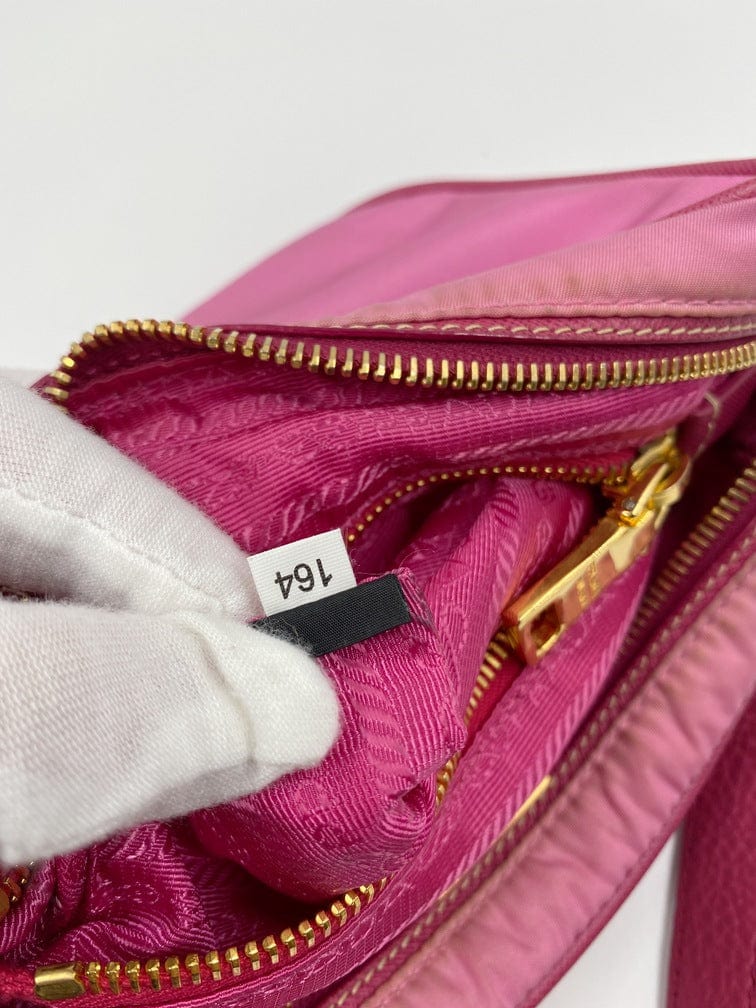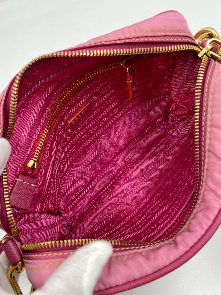 A fun pink Prada nylon crossbody bag with adjustable webbing strap and chunky gold Prada branded hardware. There is a zipped pocket on the front panel.