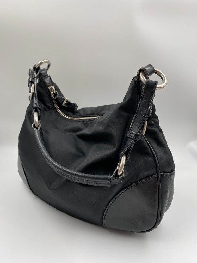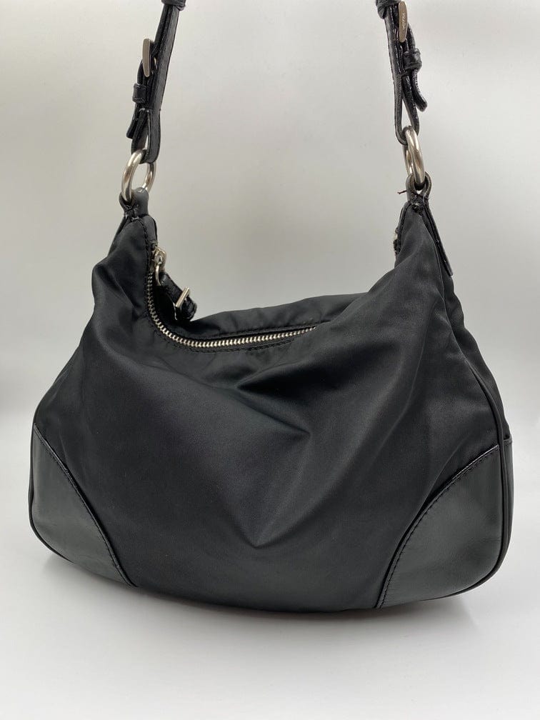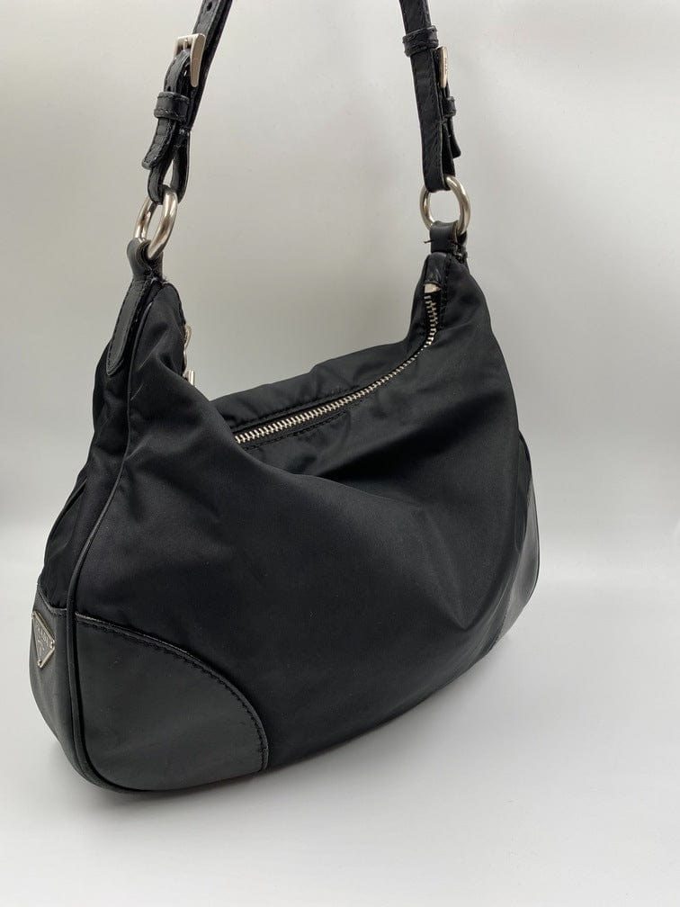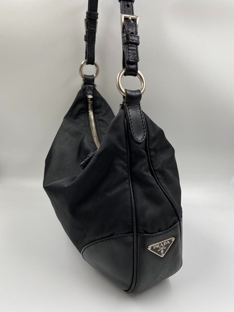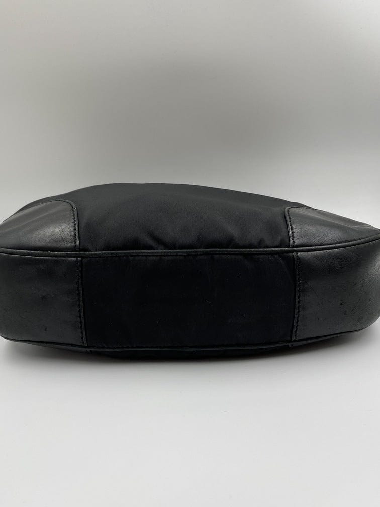 A very cool all black Prada classic. This bag has leather base corners and features a Prada metal logo on the side at the bottom. The strap can be adjusted with a buckle and the main body of bag has a top zip closure. Inside the bag is lined with the classic Prada logo lining. It also has an interior zipped pocket for valuables.
