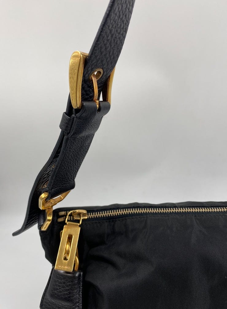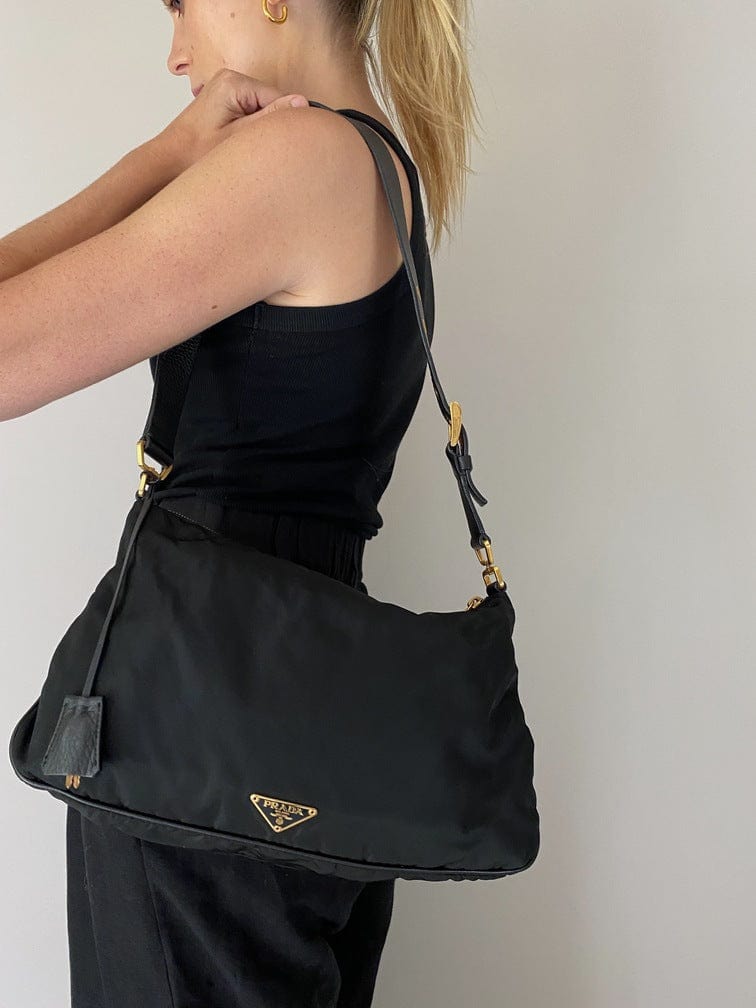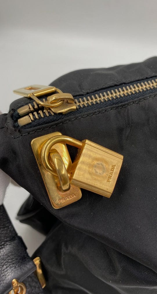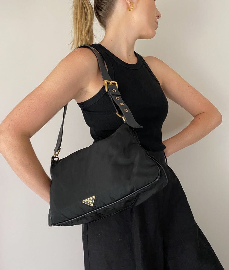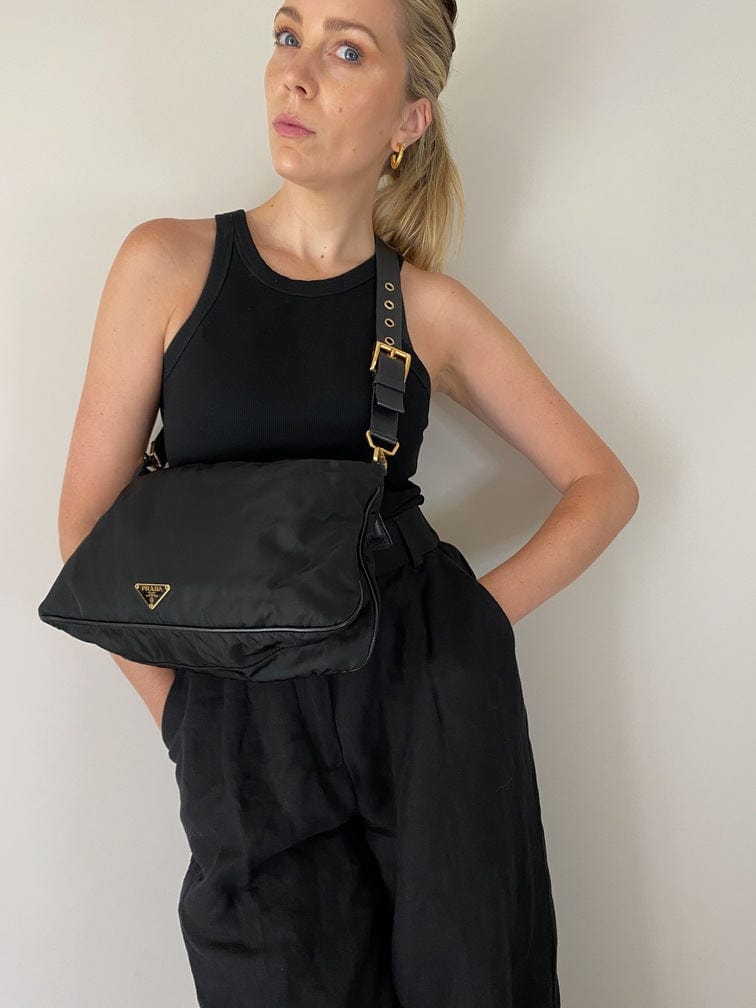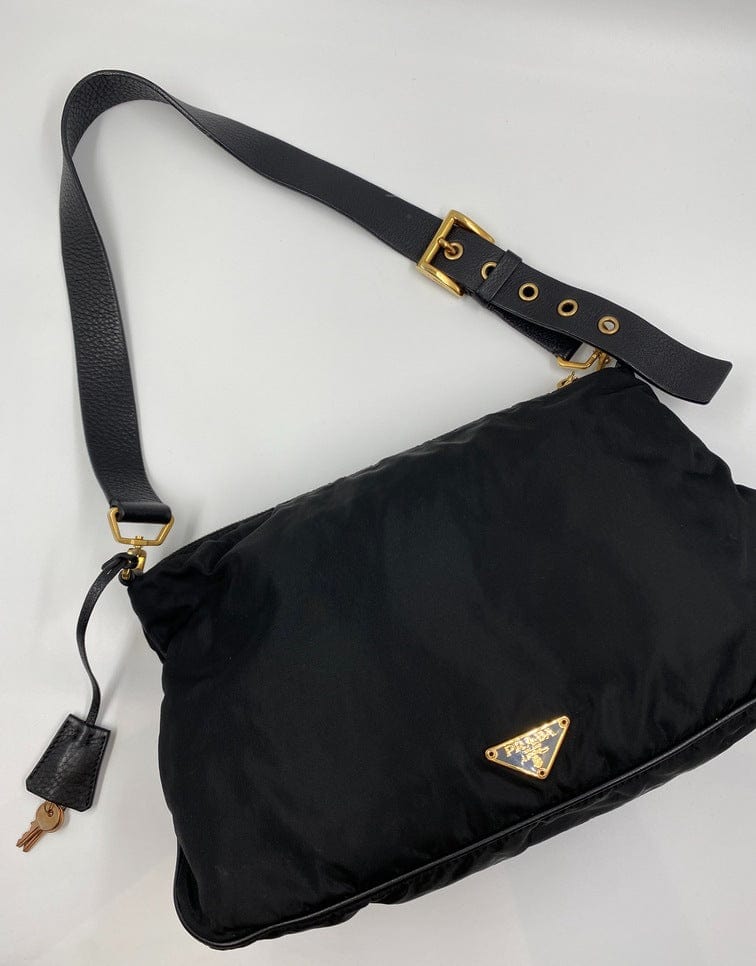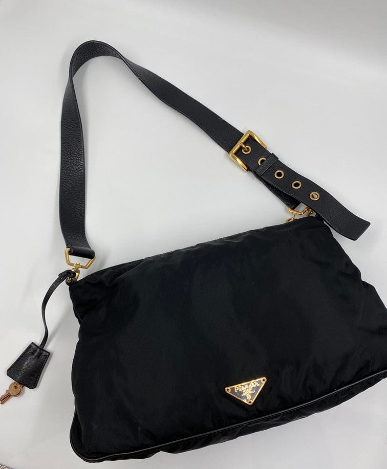A super cool nylon Prada shoulder bag with Prada branded gold hardware. This bag has a Prada branded padlock plus the keys to lock. This bag has the iconic Prada ceramic plaque on the front. The shoulder strap is make from black leather and has a buckle to adjust the length. It can be worn as either a shoulder bag or a short crossbody. At the shortest the handle drop is 32cm and at its longest the drop is 37cm. Inside the bag is lined with the famous Prada logo nylon lining and has an interior pocket for valuables.