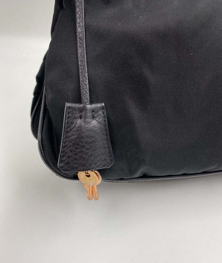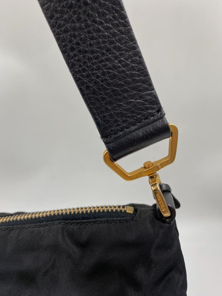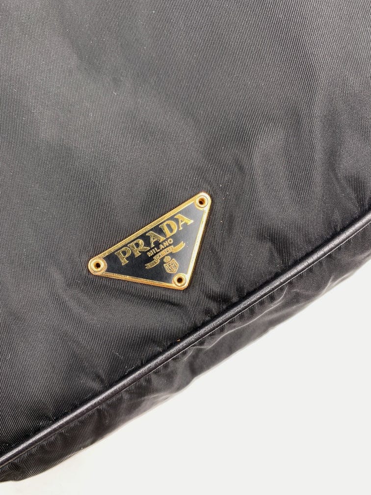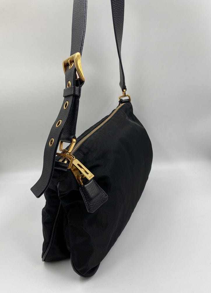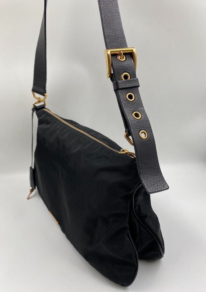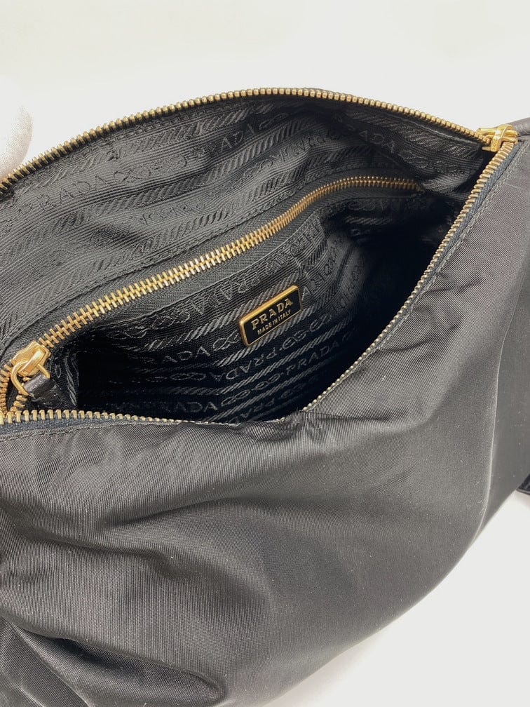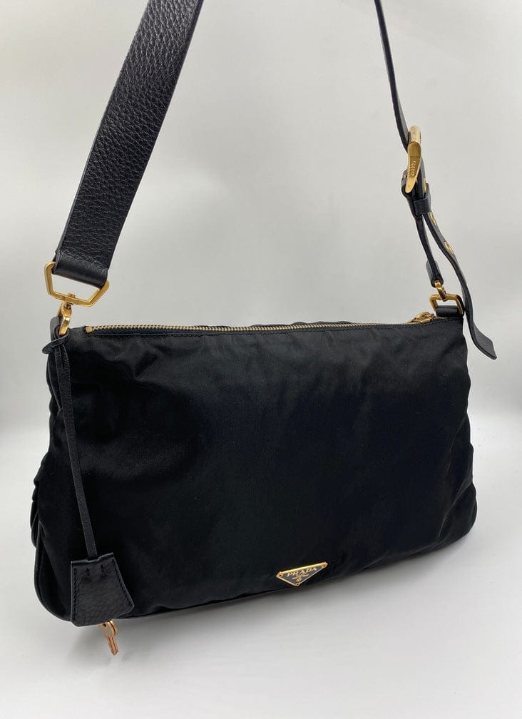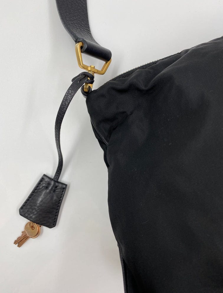 A super cool nylon Prada shoulder bag with Prada branded gold hardware. This bag has a Prada branded padlock plus the keys to lock. This bag has the iconic Prada ceramic plaque on the front. The shoulder strap is make from black leather and has a buckle to adjust the length. It can be worn as either a shoulder bag or a short crossbody. At the shortest the handle drop is 32cm and at its longest the drop is 37cm. Inside the bag is lined with the famous Prada logo nylon lining and has an interior pocket for valuables.